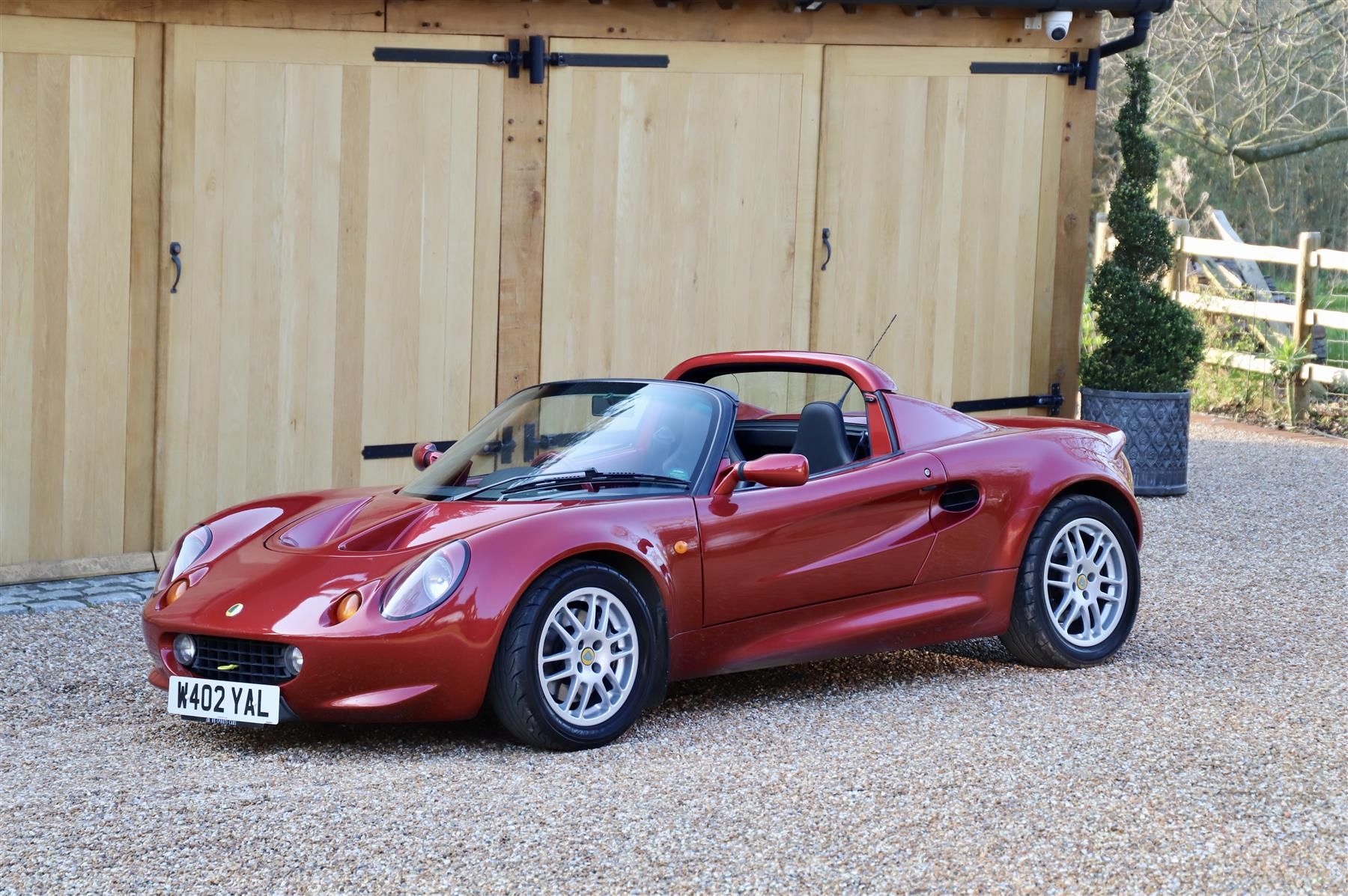 Lotus Elise S1, 2000. Ruby red metallic with black leather and Alcantara seat inserts stitched in red