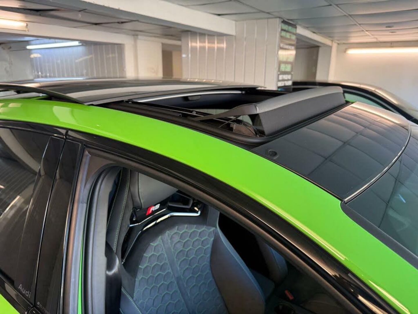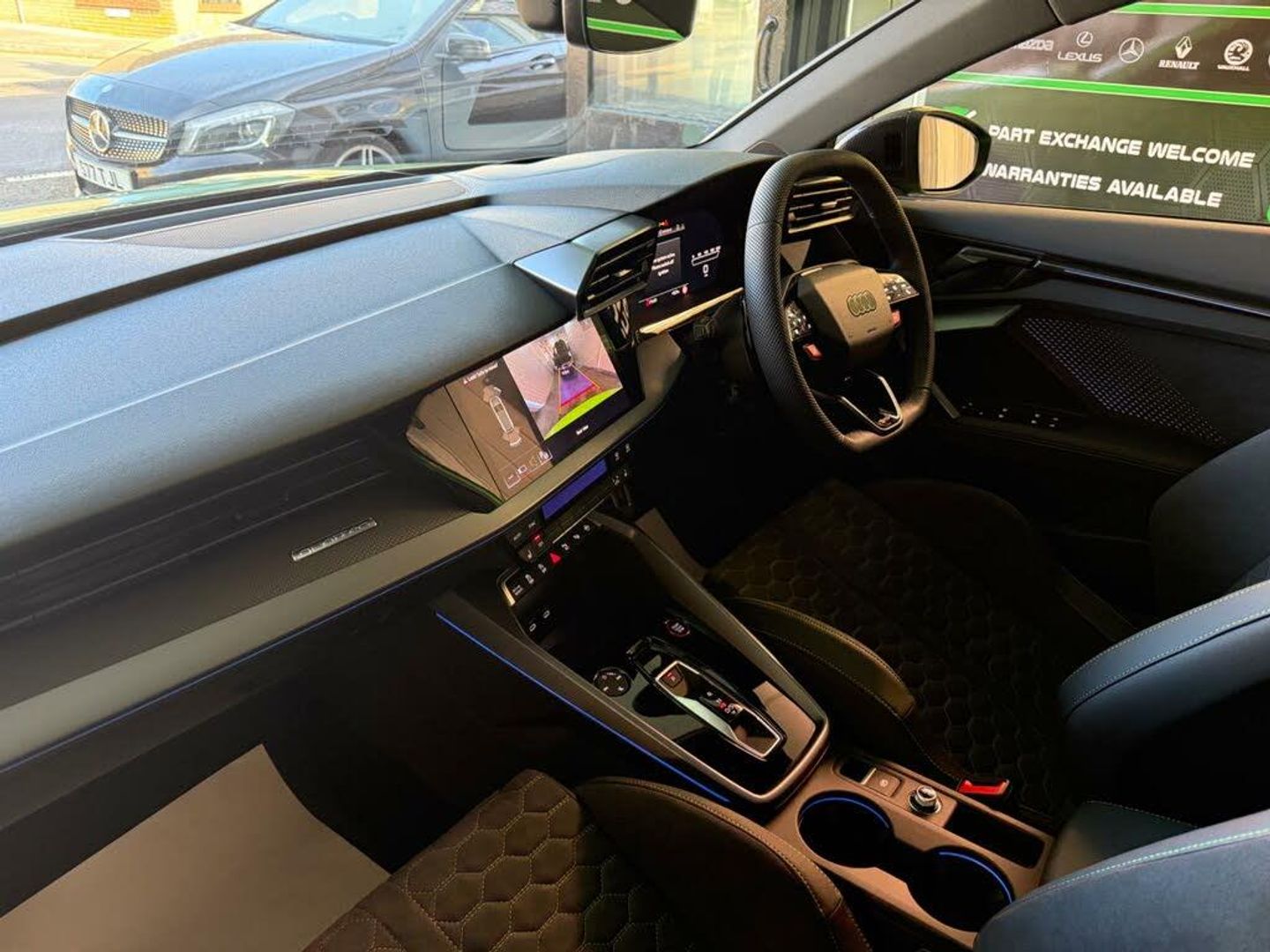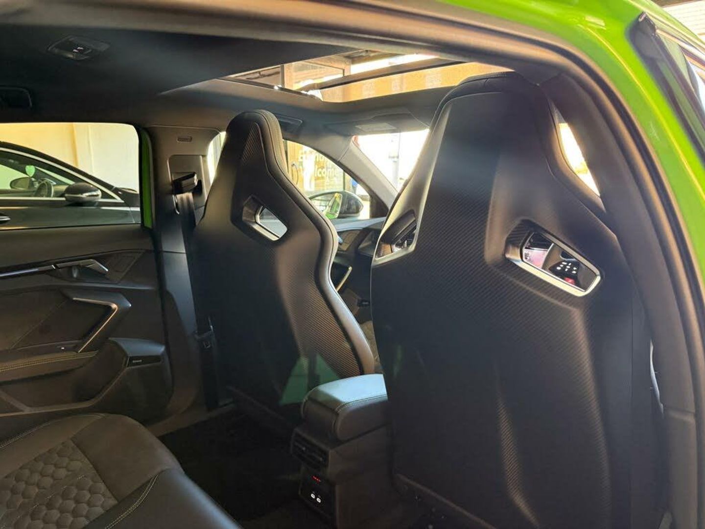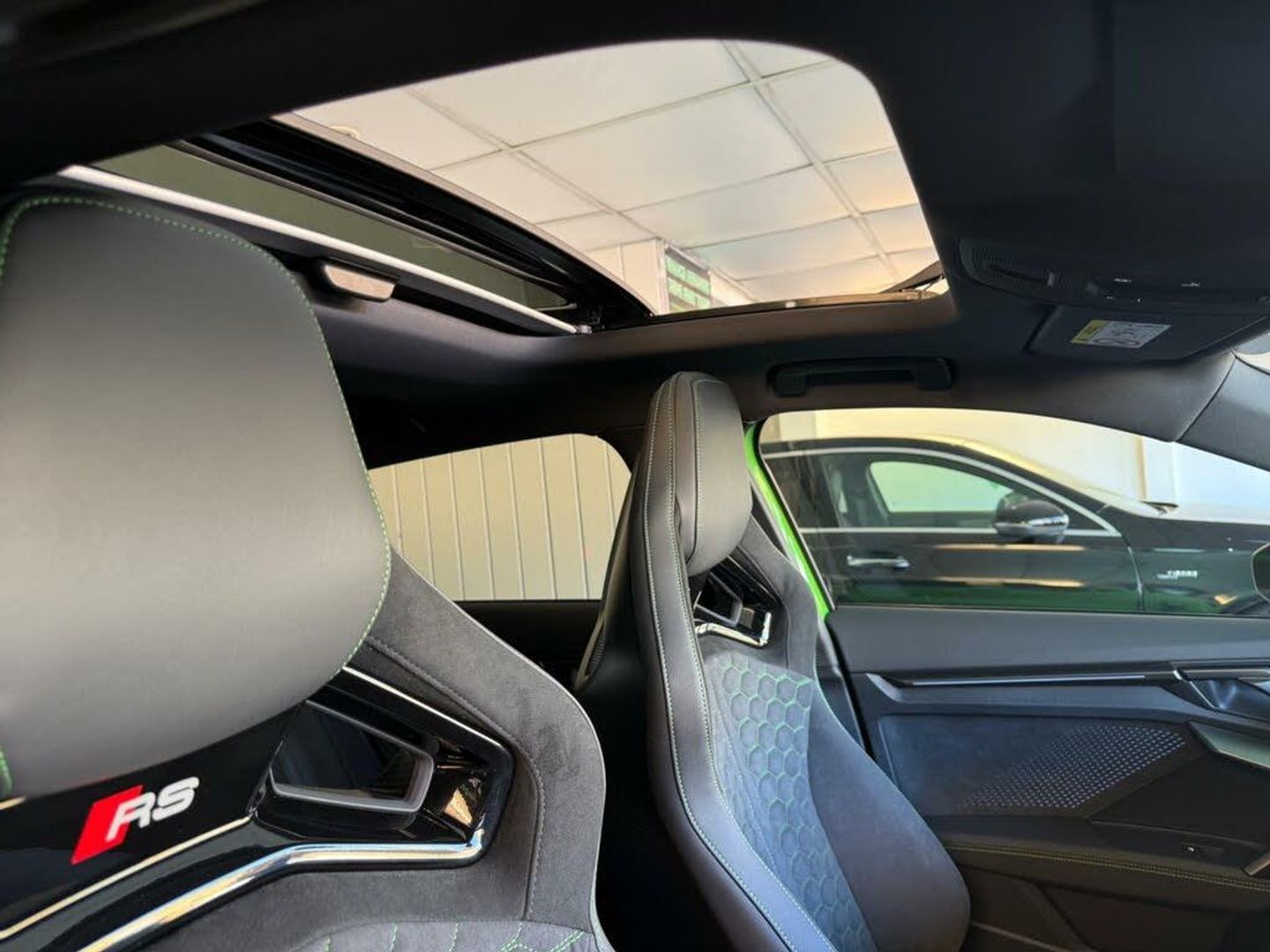 12v Socket and Storage Compartment in Front Centre Console, 19in Alloy Wheels - 10-Cross-Spoke Black Metallic, 3-Zone Deluxe Automatic Air Conditioning, 4-Way Lumbar Support for Front Seats, Adaptive Suspension with Audi Drive Select, Airbags - Driver and Front Passenger with Passenger Airbag Deactivation, Ambient Lighting Package Pro, Anti Theft Locking Wheel Bolts, Anti-Theft Alarm, Audi App Store and Smartphone Interface, Audi Beam, Audi Connect Navigation and Infotainment Services Plus - 3 Year Subscription, Audi Phone Box with Wireless Charging, Audi Pre-Sense Front, Audi Virtual Cockpit with RS Specific Design and 12.3in Display, Auto Dimming and Frameless Rear View Mirror, Automatic Start-Stop System with Recuperation, Black Styling Pack Plus, Camera Based Traffic Sign Recognition, Carbon Door Mirrors, Carbon Roof Spoiler, Cloth Headlining in Black, Collision Avoidance Assistant, DAB Digital Radio, Distraction and Fatigue Warning, Door Mirrors - Electrically Adjustable - Heated - Folding - Automatically Dimming with Memory Function and Integrated LED Indicators with Kerb View Function for Passenger Side, Door Sill Trims with RS3 Logo, ESC - Electronic Stabilisation Control inc ABS - ASR and EDL, Electrically Adjustable Front Seats with Memory Function for Drivers Side, Electronically Operated Child Locks, Emergency Call - E-Call, Engine Compartment Cover with Carbon Trim, First Aid Kit and Warning Triangle and 2 Safety Vests, Front Centre Armrest, Front Side Airbags with Head Airbags and Interaction Airbag, Front Sports Seats, Front and Rear Floor Mats, Heated Front Seats, Hill Hold Assist, I-Size and Top Tether Child Seat Mounting for the Outer Rear Seats, Inlays - Carbon Atlas Structure, Interior Accents in Vanadium Look, Lane Departure Warning, Light and Rain Sensor, MMI Navigation Plus with High Resolution 10.1in Touchscreen Colour Display, Manual Boot Compartment Lid, Model Badging - Exterior, Panoramic Sunroof, Parking Assist with Parking System Plus, Pedals in Stainless Steel and Footrest in Black, Privacy Glass, Progressive Steering, RS Exterior Features in Carbon - Gloss Black, RS Sport Exhaust System, RS Steel Brakes with Black Calipers with RS Logo, Remote Central Locking with Safelock, Seat Belt Monitoring, Speed Limiter - Adjustable, Split Folding Rear Seat Bench - 60-40 or Fully, Steering Wheel - Flat Top and Bottomed 3-Spoke Black Leather Multifunction with Shift Paddles in Vanadium Look - Rhombus RS Logo, Storage Package, Technology Pack, Technology Pack Pro, Tool Kit, Top Speed Restriction Increase to 174mph, Tyre Pressure Loss Indicator, Tyre Repair Kit, USB Ports with Charging Function in Rear, Rear Side Airbags with Head Airbag System, Brake Calipers - Red, Dinamica Microfibre-Leather - RS Bucket Seats - Honeycomb Pattern - Black with Micrommata Green Contrast Stitching, Toolkit and Jack, Audi Warranty 5 Years - 90000 Miles - Whichever Comes First