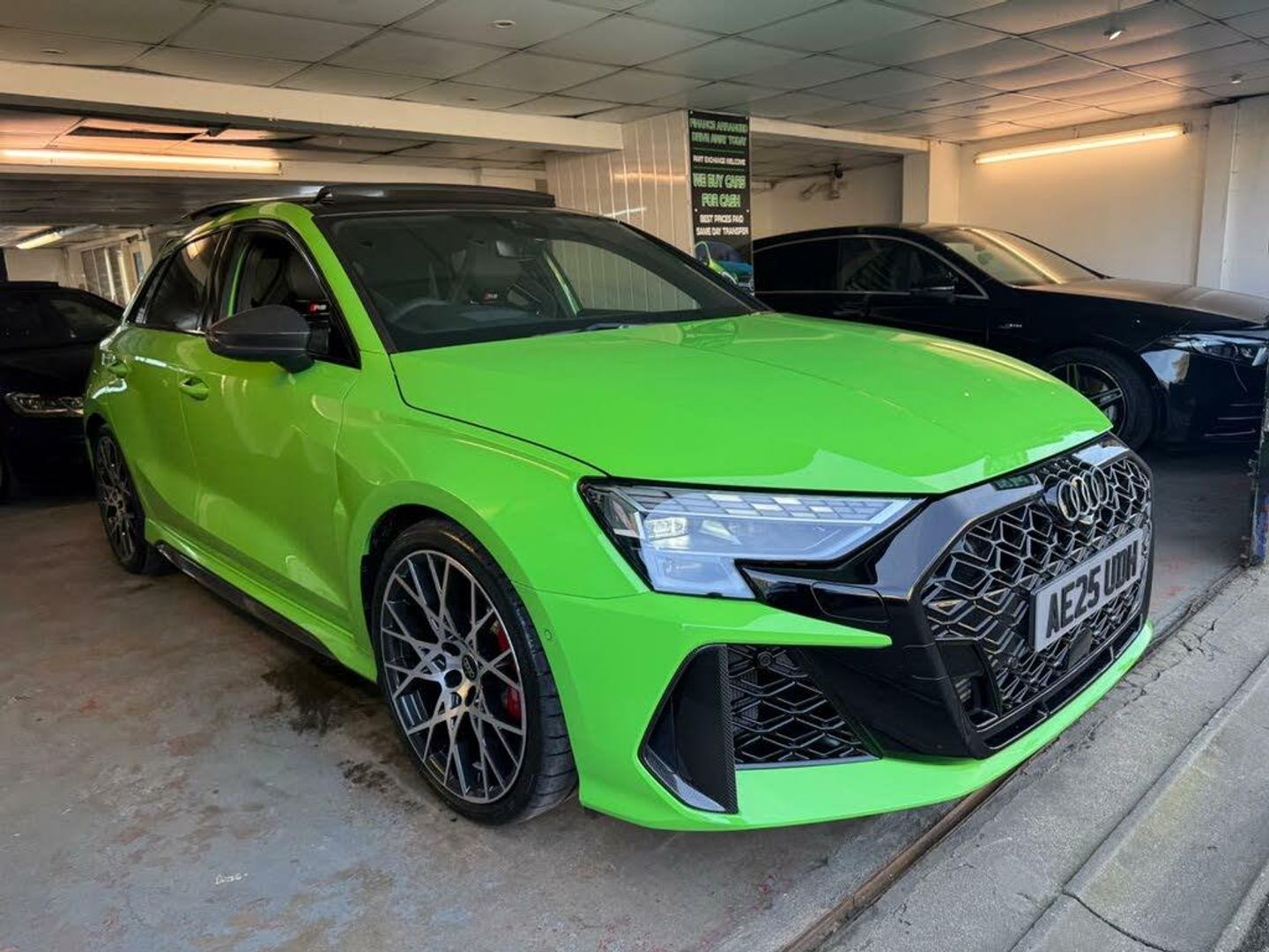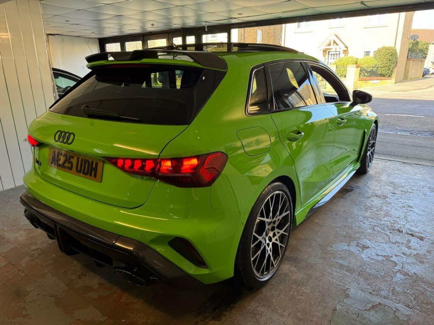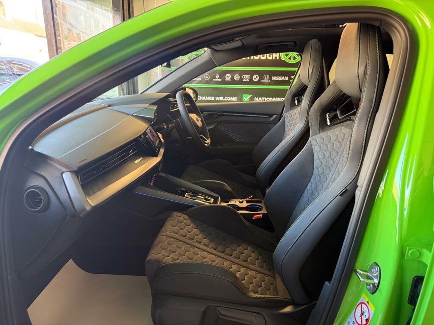 12v Socket and Storage Compartment in Front Centre Console, 19in Alloy Wheels - 10-Cross-Spoke Black Metallic, 3-Zone Deluxe Automatic Air Conditioning, 4-Way Lumbar Support for Front Seats, Adaptive Suspension with Audi Drive Select, Airbags - Driver and Front Passenger with Passenger Airbag Deactivation, Ambient Lighting Package Pro, Anti Theft Locking Wheel Bolts, Anti-Theft Alarm, Audi App Store and Smartphone Interface, Audi Beam, Audi Connect Navigation and Infotainment Services Plus - 3 Year Subscription, Audi Phone Box with Wireless Charging, Audi Pre-Sense Front, Audi Virtual Cockpit with RS Specific Design and 12.3in Display, Auto Dimming and Frameless Rear View Mirror, Automatic Start-Stop System with Recuperation, Black Styling Pack Plus, Camera Based Traffic Sign Recognition, Carbon Door Mirrors, Carbon Roof Spoiler, Cloth Headlining in Black, Collision Avoidance Assistant, DAB Digital Radio, Distraction and Fatigue Warning, Door Mirrors - Electrically Adjustable - Heated - Folding - Automatically Dimming with Memory Function and Integrated LED Indicators with Kerb View Function for Passenger Side, Door Sill Trims with RS3 Logo, ESC - Electronic Stabilisation Control inc ABS - ASR and EDL, Electrically Adjustable Front Seats with Memory Function for Drivers Side, Electronically Operated Child Locks, Emergency Call - E-Call, Engine Compartment Cover with Carbon Trim, First Aid Kit and Warning Triangle and 2 Safety Vests, Front Centre Armrest, Front Side Airbags with Head Airbags and Interaction Airbag, Front Sports Seats, Front and Rear Floor Mats, Heated Front Seats, Hill Hold Assist, I-Size and Top Tether Child Seat Mounting for the Outer Rear Seats, Inlays - Carbon Atlas Structure, Interior Accents in Vanadium Look, Lane Departure Warning, Light and Rain Sensor, MMI Navigation Plus with High Resolution 10.1in Touchscreen Colour Display, Manual Boot Compartment Lid, Model Badging - Exterior, Panoramic Sunroof, Parking Assist with Parking System Plus, Pedals in Stainless Steel and Footrest in Black, Privacy Glass, Progressive Steering, RS Exterior Features in Carbon - Gloss Black, RS Sport Exhaust System, RS Steel Brakes with Black Calipers with RS Logo, Remote Central Locking with Safelock, Seat Belt Monitoring, Speed Limiter - Adjustable, Split Folding Rear Seat Bench - 60-40 or Fully, Steering Wheel - Flat Top and Bottomed 3-Spoke Black Leather Multifunction with Shift Paddles in Vanadium Look - Rhombus RS Logo, Storage Package, Technology Pack, Technology Pack Pro, Tool Kit, Top Speed Restriction Increase to 174mph, Tyre Pressure Loss Indicator, Tyre Repair Kit, USB Ports with Charging Function in Rear, Rear Side Airbags with Head Airbag System, Brake Calipers - Red, Dinamica Microfibre-Leather - RS Bucket Seats - Honeycomb Pattern - Black with Micrommata Green Contrast Stitching, Toolkit and Jack, Audi Warranty 5 Years - 90000 Miles - Whichever Comes First