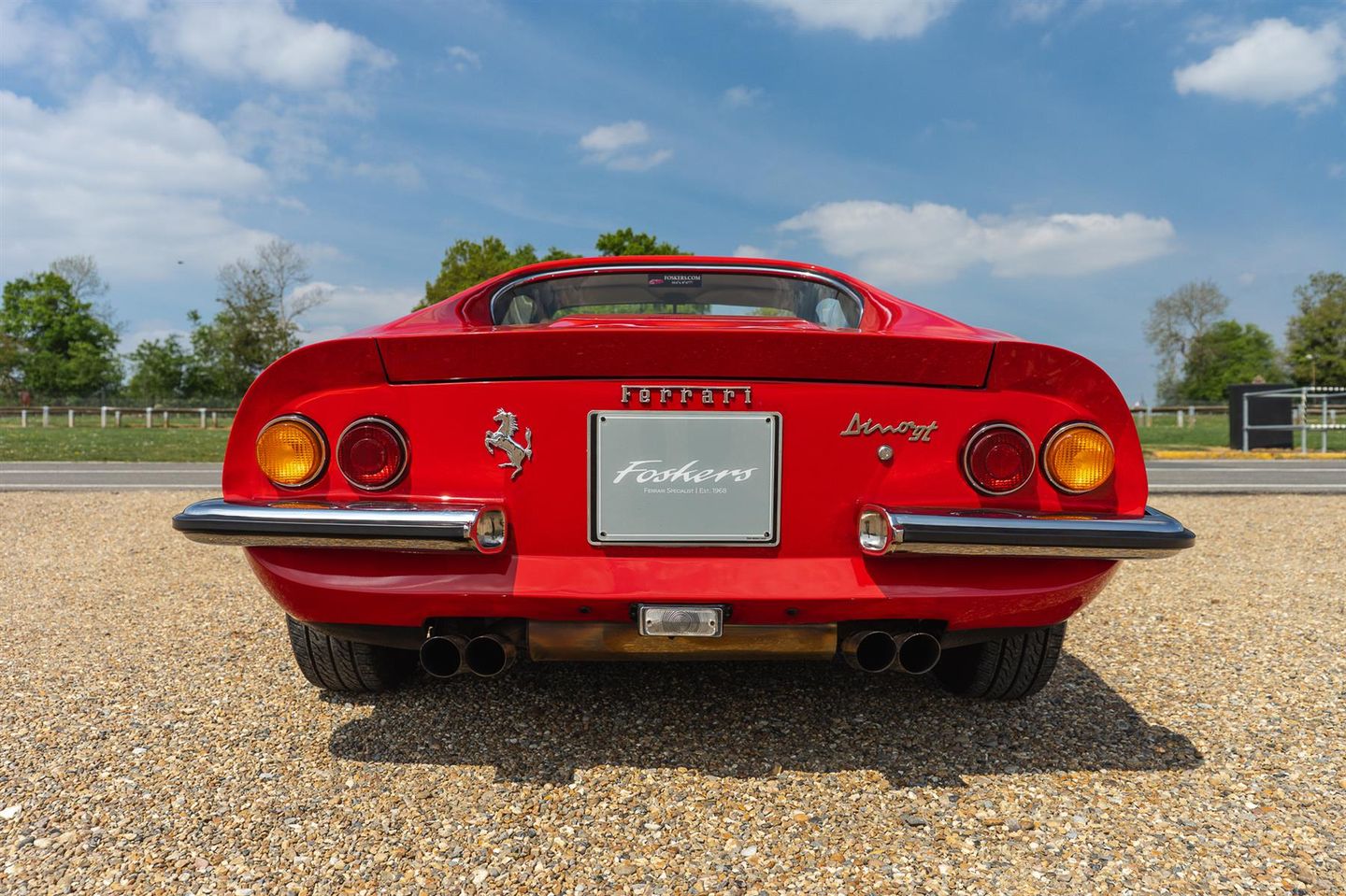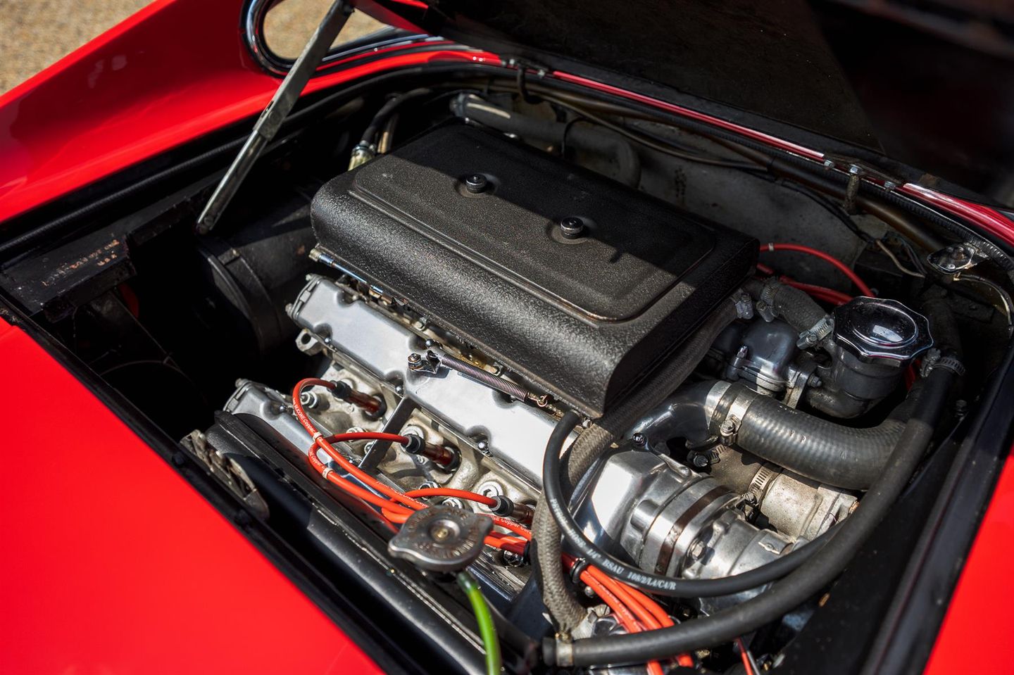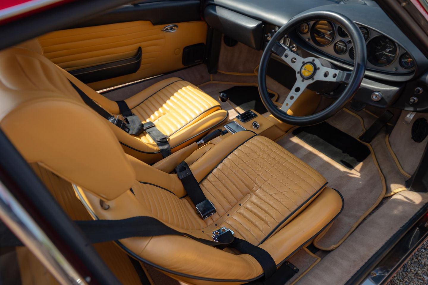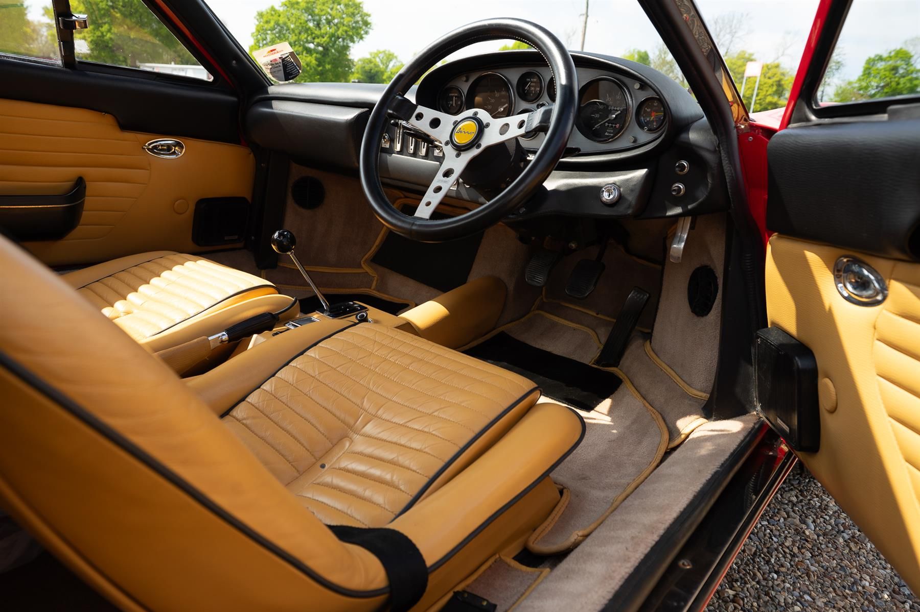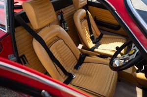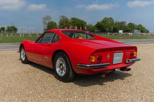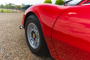 Production of the Dino 246 GT commenced in August of 1969 after 152 units of the 206 GT had been built. The engine was enlarged to 2.4 litres and the new model also had a slightly extended wheelbase. The 65 degree V6 was transverseley mounted featured dual overhead camshafts with two valves per cylinder and wet sump lubrication. The block was cast iron with an alloy head and three twin choke Weber carburettors. Transmission was an all syncromesh five speed with a single plate clutch. The body was styled by Pininfarina with Scaglietti handling the fabrication of steel panels with the exception of the aluminium front lid. The chassis was tubular steel with alloy panels riveted in place and rack and pinion steering. Fully independent suspension all around with Koni telescopic dampers and coil springs.
