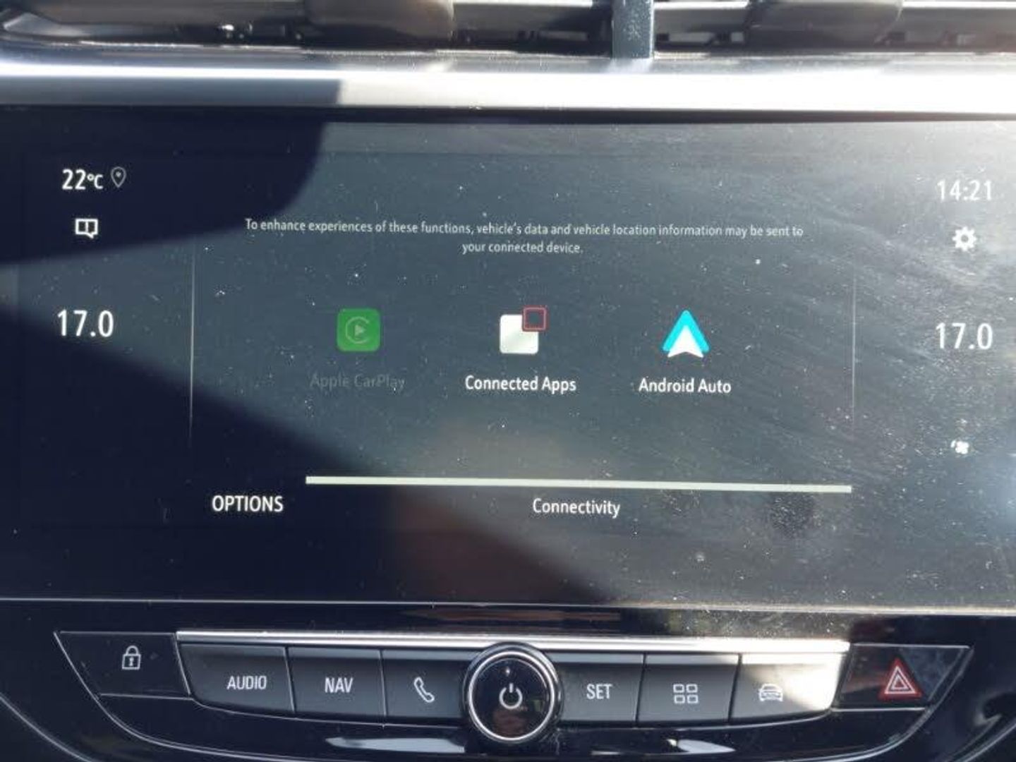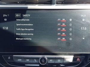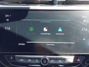 Adaptive cruise control, Android Auto, Apple CarPlay, Heated steering wheel, LED daytime running lights, LED Headlights, Rear parking sensor, Speed limiter, Steering wheel audio controls, Central facia display with digital clock, outside air temperature and audio information, Instrumentation - Speedometer, rev counter, low fuel gauge warning light + water temperature gauge warning light, shift up/down indicate light, Lane departure warning with lane assist, Multimedia Navi pro 10" colour touchscreen, Sat nav, European coverage,2D/3D street level mapping, points-of-interest search and map updates via USB, RDS with traffic programme, Speed sign recognition, Vauxhall connect box, Electronic returnless fuel system, AM/FM stereo radio, Rear USB port, Six speakers, Centre rear brake lights, Dark tinted rear side windows + tailgate window, Electrically operated front and rear windows with safety auto reverse and one touch up/down facility, 6 way manual adjustable driver seat with massage function height up/down, reach fore/aft, backrest upright/recline, Alloy effect sport pedals, Cabin particulate filter - removes dust, airborne particles and pollen, Four adjustable facia vents