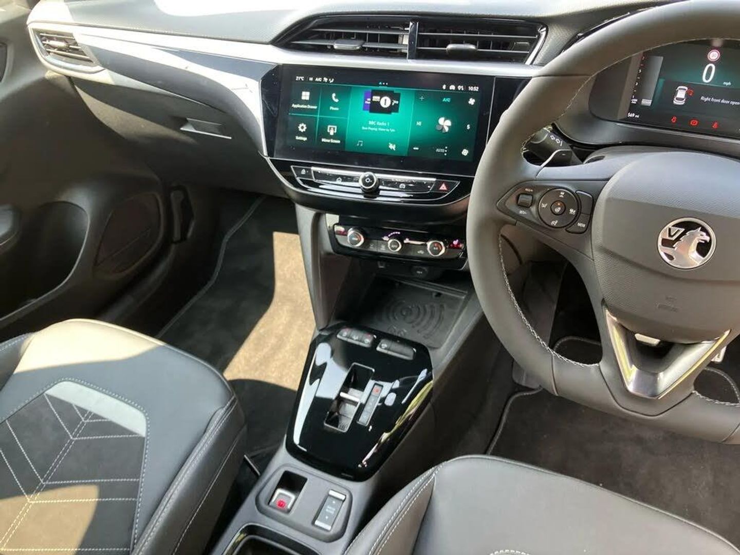 180 degree panoramic rear view camera,2D/3D street level mapping,7 inch digital instrument cluster display,Adaptive cruise control with intelligent speed limiter,Auto tele unit 3S vehicle communication system,Breakdown call (b-call),Central facia display with digital clock, outside air temperature and audio information,Drive modes (sport, normal, eco),Driver drowsiness alert system,E-call,Engine oil life indicator,Enhanced traffic sign recognition,European coverage,Extended speed sign recognition,Front and rear parking sensors,Front camera system,Instrumentation - Speedometer, rev counter, low fuel gauge warning light + water temperature gauge warning light,Lane departure warning,Lane keep assist,Lane positioning assist,Lights on audible warning,Live nav plus-Tom Tom,Real time traffic,parking prices,weather forecast,fuel prices,search for changing station,road safety alerts and speedcam alerts,MAP OTA updates,Multi function trip computer,POI (search),Pre conditioning of vehicle temperature,RDS with traffic programme,Remote check of battery level programming and charge management,Service indicator,Side blind spot alert,Smartphone projection,Speed sensitive power steering,Start/stop system,Vauxhall connect box,Vehicle status and information,Voice recognition,Wireless Apple CarPlay/Android Auto,Electronic returnless fuel system,Petrol Particulate Filter,Under body shield for aero,AM/FM stereo radio,Bluetooth A2DP audio streaming,DAB Digital radio,Multimedia Navi with 10-inch touchscreen,Rear USB port,Six speakers,Steering wheel audio, phone and cruise controls,USB type C port,3rd brake light,Automatic headlamp levelling,Automatic headlight control system,Black door mirror housings,Black Griffin logo and vizor frame,Black lower side window mouldings,Body colour door handles,Body colour front and rear bumpers,Bonnet/headlight/wiper structure,Corsa lettering in tailgate,Dark tinted rear side windows + tailgate window,Electrically adjustable and heated door mirrors,Electrically folding door mirrors,Electrically operated front and rear windows with safety auto reverse and one touch up/down facility,Electrochromic automatic anti-dazzle rear view mirror,Glazed tailgate and heated rear window with wash/wipe facility,Hazard warning lights,Headlamps for left side traffic,High beam assist,High gloss black finish B pillar,High gloss black honeycomb lower grille with black badging,IntelliLux Matrix LED Headlights,LED daytime running lights,LED front fog lights,LED tail lamp,Rain sensitive windscreen wipers,Rear fog lamp,Rear reversing lights,Rear side wing doors,Rear wiper,Shark fin aerial,Solar heat absorbing windscreen and windows,Sports front and rear body styling for upper and lower bumper design,Two speed windscreen wipers with variable intermittent wipe,Windscreen and side window demist vents,12V power sockets,3 bench rear seats in 2nd row,4 speed fan with illuminated controls,6 way manual adjustable co-driver seat height up/down, reach fore/aft, backrest upright/recline,6 way manual adjustable driver seat with massage function height up/down, reach fore/aft, backrest upright/recline,60/40 split folding rear seat,Alloy effect sport pedals,Black headliner,Cabin particulate filter - removes dust, airborne particles and pollen,Comfort front seats,Driver's seat lumbar support,Driver/passenger sunvisors with vanity mirrors + covers,Electronic climate control (ECC),Flat bottomed steering wheel,Four adjustable facia vents,Front centre armrest with storage,Front cupholder,Front headrests,Gearshift paddles,Height adjustable head restraints,Illuminated glovebox with lid,Interior courtesy light,Internal chrome door handles,LED ambient lighting,LED boot light,Polyurethane gear knob/lever,Reach and rake adjustable steering column,Rear cupholder,Rear headrests,ReNewKnit upholstery,Right hand drive (RHD),Single dome lamp with dual front reading lamps,Single front passenger seat,Standard floor mats,Two litre open door pockets,Vegan leather steering wheel,Winter pack - Corsa,3 rear 3 point seatbelts,Anti-lock braking system (ABS),Cornering brake control,Deactivation switch for front passenger's airbag,Drag torque control,Driver and front passenger airbags, front seat side impact airbags, full size curtain airbags,EBD - Electronic brakeforce distribution,Electrical child lock system in rear door latch,Electronic parking brake,Electronic Stability Programme (ESP),Emergency brake assist,Enhanced automatic emergency braking,Forward collision alert,Front seatbelt unfastened audible warning and warning light,Front ventilated disc brakes - 381mm,Hill hold and start system,ISOFIX child seat mountings incorporating top tether anchor points located on second row rear seats,Rear disc brakes - 356mm,Seatbelt pretensioners,Single tone horn,Straight line stability control,Traction control,Tyre deflation detection system,2 keys one folding with integral remote,Electronically protected audio equipment,Engine deadlock and immobiliser
