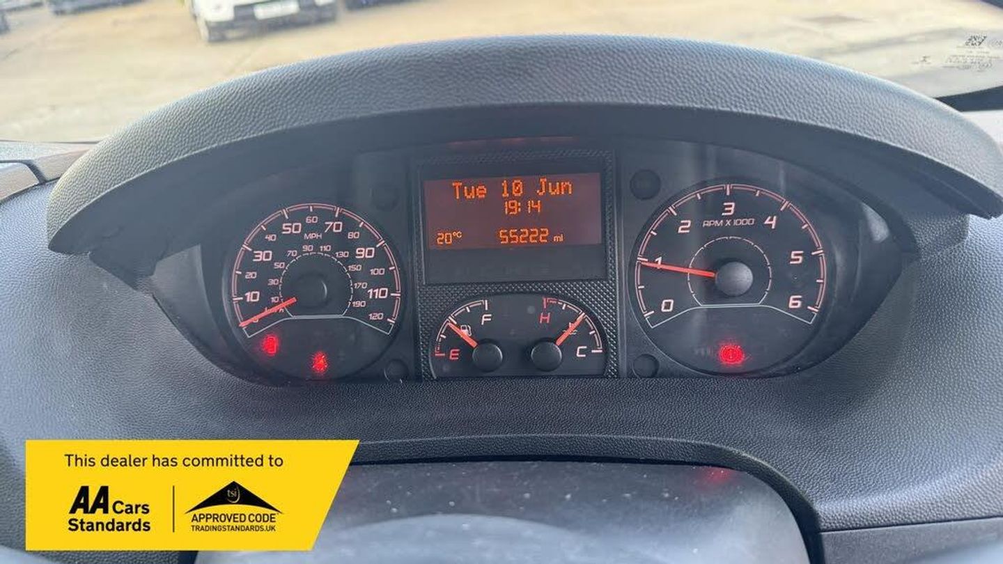 USB Charging Socket on Dashboard,Cruise Control with Speed Limiter Fixed at 62mph,Automatic Air Conditioning,Icy White,12V Socket in Cabin,15in Steel Wheels,2x Load Area Lights,ABS - Anti-Lock Braking System,Airbags - Driver,Battery Charge Warning,Bulb Out Warning for Side Light - Headlamp and Indicators,Central Dash Folding Clipboard - Deleted with Passenger Airbag,Cruise Control with Programmable Speed Limiter,Daytime Running Lights,Door Open Warning for Cab Doors,Drivers Seat Armrest - Lumbar Adjustment and Under Seat Storage,Drivers Seat Height Adjustment - Rake and Reach Adjustment,EBA - Emergency Braking Assistance,EBFD - Electronic Brakeforce Distribution,Electric Power Steering,Electronic Stability Control - ESC,Front Electric Windows,Full Steel Bulkhead,Gear Shift Indicator,Glove Box - Lockable and Non-Illuminated,Halogen Headlights with Clear Polycarbonate Lenses,High Frequency Remote Control Central Locking with 3-Button Plip,Hill Start Assist,Laminated Windscreen,Lights On Alarm,Load Tie Down Hooks in Cargo Area - 10,Lower Central Glovebox,Manual Air Conditioning for Cab Area - including Glovebox,Manually Folding Door Mirrors,Nearside Sliding Side Loading Door,Non Slip Hardwearing Front Cabin Floor Covering,Oil Level Indicator,Perimetric Alarm,Rear Doors Opening - 180 Degree,Rear Parking Sensors,Rear Single-Leaf Suspension,Remote Central Locking with Deadlocking and Separate Locking For Cab,Remote Headlight Adjustment from Facia,Rev Counter - Water Temperature Gauge - Fuel Gauge and Trip Computer,Seatbelt Reminder for the Front Passenger Seats,Seats - Dual Passenger Bench,Side Rubbing Strips,Spare Wheel - Full Size Steel,Steering Wheel - Reach Adjustable,Telematics Box for Free2Move Connect Fleet Services,Thatcham Rolling Transponder Immobiliser,Three x3 Point Inertia Reel - Height Adjustable Seatbelts,Tinted Windows,Touch Screen Navigation Pack,Twin Lens Door Mirrors with Electrically Adjustable and Heated Upper Mirror,Two Speed Intermittent Front Windscreen Wipers,Unglazed Rear Doors,Visible Vehicle Identification Number at Base of Windscreen