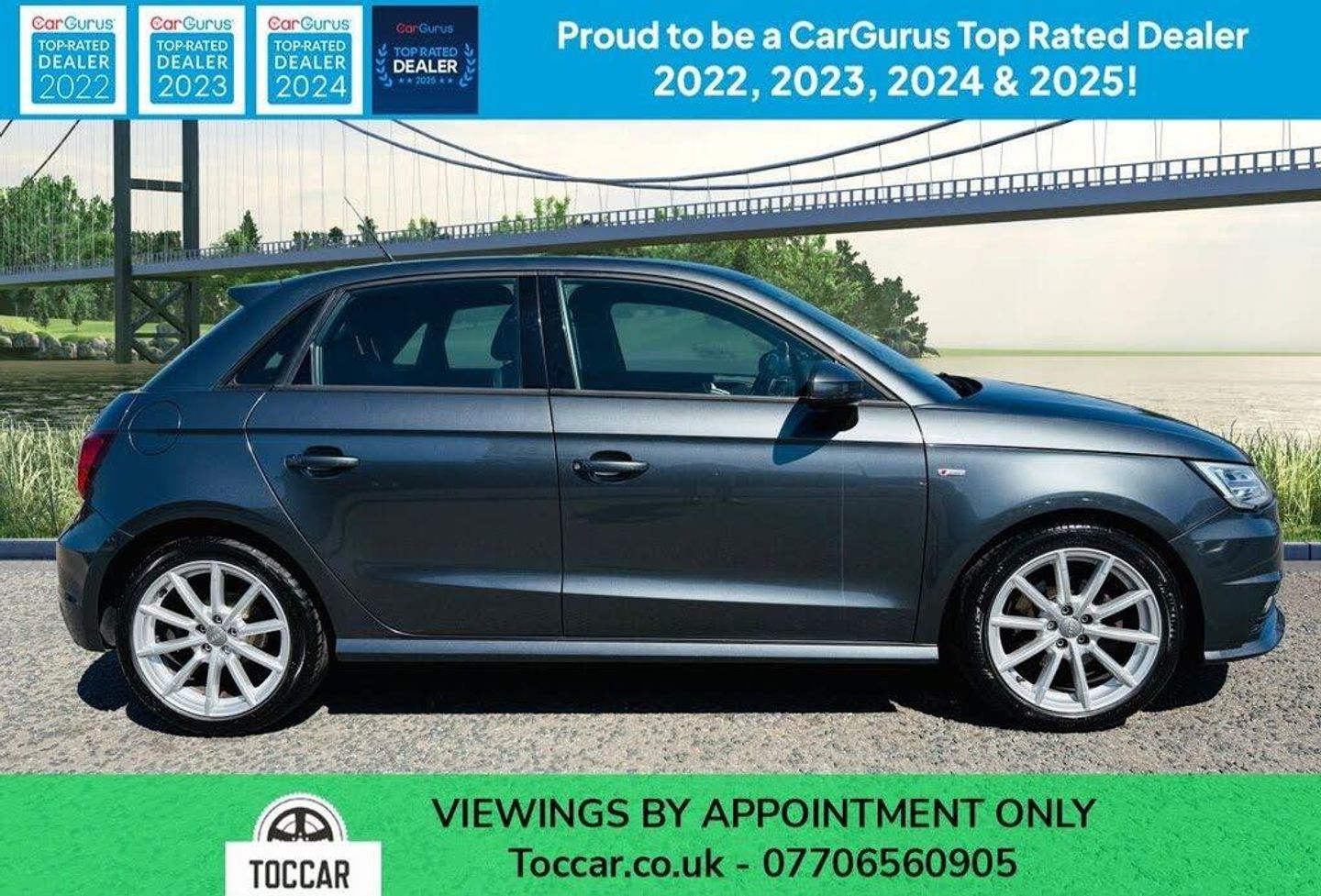 We are pleased to offer this Audi A1 1.4 TFSI S Line Sportback 5dr 125ps in Metallic Grey with half leather trim. This car is in excellent condition both inside and out. A nice example of this popular premium hatchback. £35 Road Tax. New brakes and tyres. The specification includes: Alloy Wheels, Air Conditioning, Bluetooth, DAB Radio, Electric Adjustable Heated Door Mirrors, Multi-Function Steering Wheel, Electric Windows and Remote Central Locking. The car has been serviced by an approved service centre and is supplied with an MOT (no advisories). For further peace of mind Autoguard nationwide warranties are available to purchase. Viewing is by appointment please. Part Exchange welcome. Finance available. Please see our wide selection of used cars at www.toccar.co.uk. Toccar is proud to be a Top-rated dealer on Google, Facebook, CarGurus and Autotrader. We promise all our valued customers a no-nonsense approach. All our vehicles come quality checked with service, MOT and warranty.