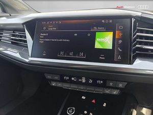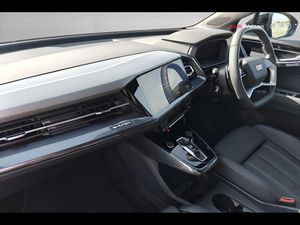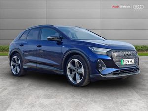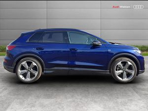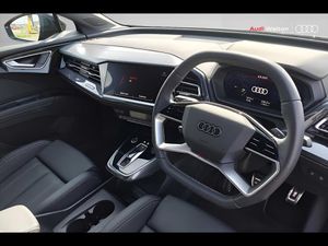 Adaptive cruise control with speed limiter, Advanced driver attention and drowsiness monitor, Audi application store, Audi connect safety and service (e-call), Audi drive select, Audi smartphone interface, Audi Virtual Cockpit - 10.25" display, Bluetooth interface, Camera based traffic sign recognition, Lane departure warning including emergency assist, MMI Navigation Plus with high resolution 11.6 inch touchscreen colour display, Power operated tailgate with sensor controlled release, Progressive steering, Rear view camera, Swerve assist and turn assist, 145kW DC charging capability, AC and DC charging access point positioned on driver's side rear, Control unit with household plug and charging cable, Mode 2, Type 2 / G (10A), Mode 3 type 2 AC charging cable 22kW, Sport suspension, 2 USB-C ports with charge and data functions, Audi sound system with 8 loudspeakers incl. centre speaker, subwoofer and 6-channel amplifier with total output of 180 watts, DAB Digital radio, Audi rings and model badging in black (with powertrain designation removed), Black roof rails, Contrast bumpers in Manhattan grey, Electrically adjustable/heated/folding/auto dimming door mirrors with integrated LED indications + kerb view function for passenger side, Frameless auto dimming interior rear view mirror, Heat insulating glass windscreen, Heated rear window, LED 3rd brake light, LED daytime running lights, LED Headlights, LED rear lights, Privacy glass - dark-tinted rear window, rear door windows and rear side windows, Projection light in the exterior mirrors, e-tron logo projected from the underside of the exterior mirror onto the ground, Rear side wing doors, Rear wiper, S Line badges on the front wings, S line exterior styling, Single frame grille with a structured, closed surface within an octagonal shape, 3 seat bench in 2nd row, 3 zone automatic air conditioning, 4 way electric lumbar support for driver and front passenger, 40/20/40 split folding rear seat bench, Accent surfaces in gloss black - centre console control panel, switch panel and trim on front doors in gloss black, Black carpets, Black cloth headlining, Comfort auxiliary air conditioning, Door armrests in leatherette, Flat top and bottomed twin-spoke leather multifunction sport steering wheel with shift paddles for recuperation, Front centre armrest, Front door sill trims with aluminium inlay, illuminated with S logo, Front sport seats with integrated head reastrains, Front/rear floor mats, Heated front seats, Manual seat adjustment for driver and front passenger seats, Pedals in stainless steel, Rear centre armrest with cupholders, Rear head restraints, Single front passenger seat, Ambient lighting plus pack - Q4 E-tron, Black styling pack plus - Q4 E-tron, Non smoking pack - Q4 E-tron, 3x3 point rear seatbelts, Acoustic vehicle alerting system, Convenience key with safelock, Driver and front passenger airbag with passenger airbag deactivation, Electric child locks, First aid kit with warning triangle and vests, Front side airbags with head airbag system and front interaction airbag, i - Size child seat mounting on the front passenger side and i - Size and top tether on the outer rear seats, Pre-sense front with pedestrian and cyclist detection, Rear seat occupant reminder for child presence detection, Seat belt monitoring, Tyre pressure loss indicator, Anti theft alarm, Anti-theft wheel bolts, Keyless Go, Aluminium look interior elements, Black dashboard, 21" 5 arm rotor evo Audi Sport alloy wheels in matt grey, gloss turned finish and tyre seal technology, Vehicle tool kit
