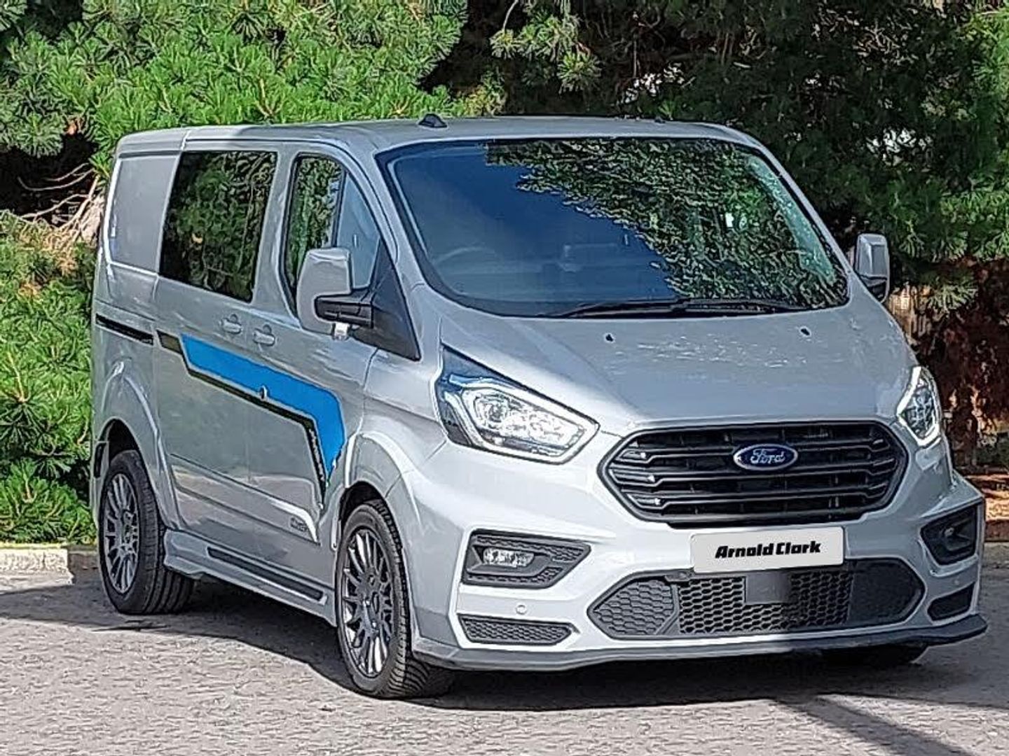 Front and rear parking aids, Interior trim accent pack C - Transit custom, Rear seat pack 3 - Transit Custom, Audio controls mounted on steering wheel, Embedded modem, Ford Eco mode, Selectable drive mode, Front manual air conditioning, Isofix child seat attachments - centre and offside 2nd row seats, Thatcham category 1 alarm, Automatic headlamps with follow me home, Automatic lights and wipers, Automatic windshield wiper, Low roof line, Quad beam headlamps, LED load compartment light, Remote central locking, Roll stability control, Side wind mitigation, 16" 6.5 alloy wheels, Crew van integral bulkhead