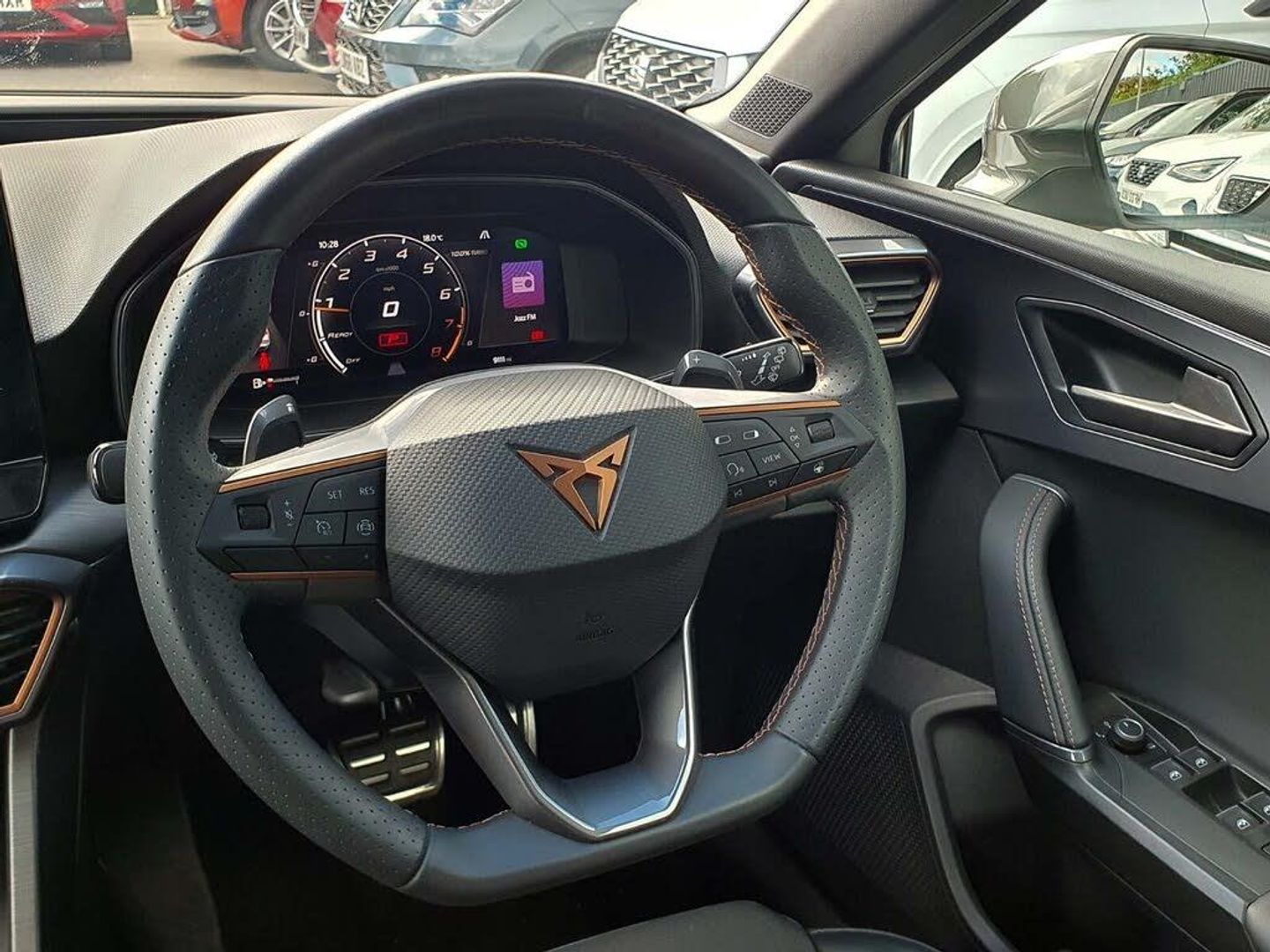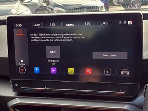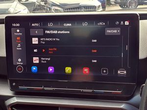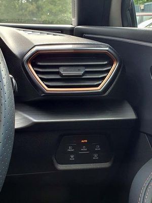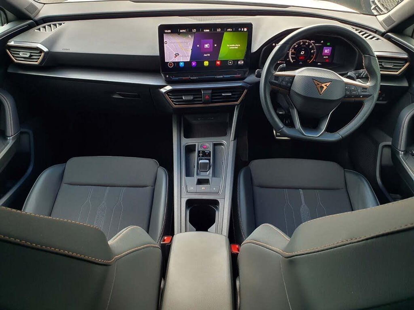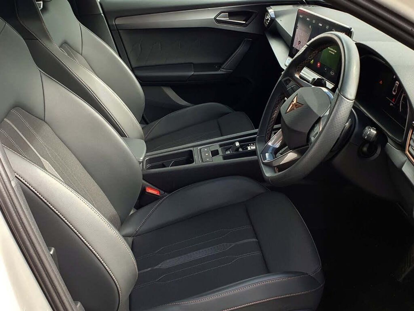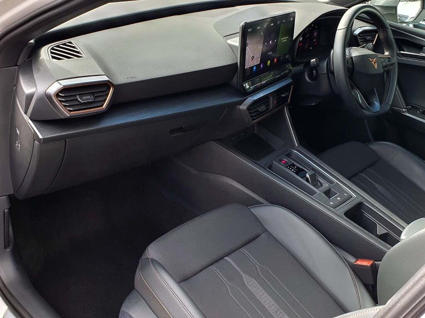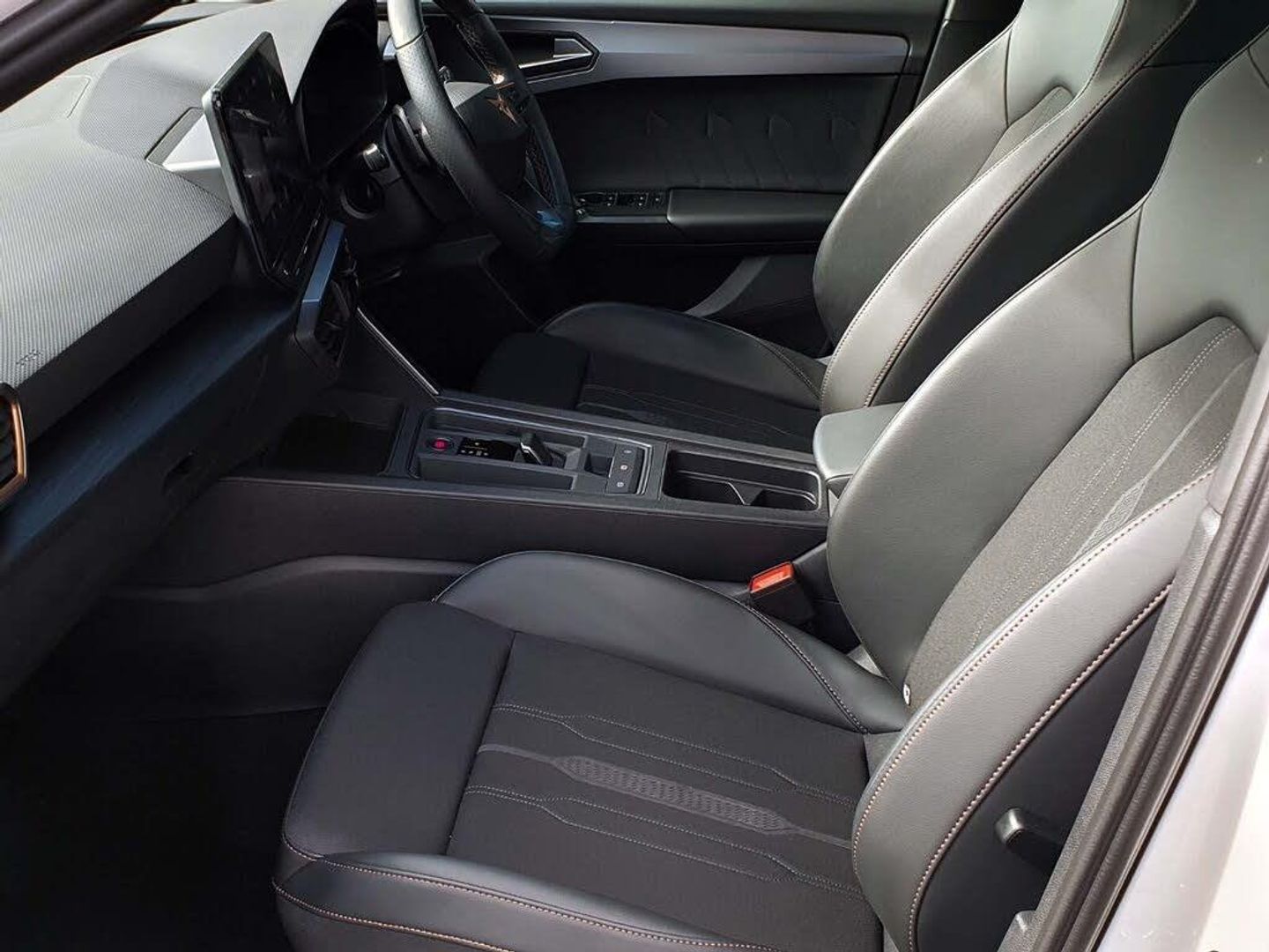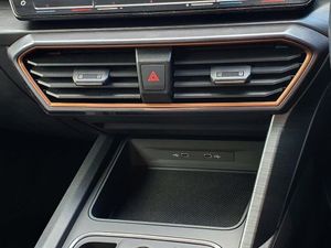 CUPRA drive profile selection with 4 modes (Comfort/Cupra/Sport/Individual), throttle response and gearshift mode, Digital cockpit, E-call, Electro mechanical speed sensitive power steering, Four x USB Type C ports, Front assist with forward collision warning braking reaction to vehicles, pedestrians and cyclists, Full link smartphone integration with Mirror Link, wireless Apple CarPlay and wired Google Android Auto, Lane assist, Lockable tailgate, Park assist (inc front/rear parking sensors), Rear view camera, RPM, trip computer, outside temp gauge, instrument light brightness, low fuel warning light, lights on reminder, gearshift indicator, Service interval indicator, Start/stop system with regenerative braking, Sports suspension, XDS electronic differential lock and dynamic traction support, 7 speakers, Auxiliary input socket, Auto dimming rear view mirror, Body colour door handles, Body coloured bumpers, Cupra sports bumpers, Dark tinted rear windows, Electric front/rear windows, Electrically adjustable, heated and folding door mirrors, LED front fog lamps with cornering function, LED headlights with dynamic turn signals, tail lights, rear fog lights with rear coast to coast lighting, Rain sensing wipers, Rear diffuser with twin exhaust pipe on each side, Rear side wing doors, Rear wash/wipe, Separate daytime running light with automatic headlight control and coming home feature, Third brake light, 12v power supply in centre console, 3 seat bench in 2nd row, 5 headrests, 60/40 split rear bench seat with armrest, Ambient lighting (glovebox, footwell, ambient lighting multicoloured), Black headlining, CUPRA Leather flat bottomed, heated, perforated steering and gearshift paddles, Cupra sports pedals, Driver/passenger manual seat height adjustment, Dust/pollen filter, Folding boot cover, Front and rear reading lights X 4, Front centre armrest, Front seats manual lumbar adjustment, Height/reach adjust steering wheel, Illuminated interior front door sills, Interior wraparound lighting, ISOFIX points in outer rear seats with top tether anchorage points, Jack and tool kit, Luggage tie-down hooks, PVC/Cloth upholstery with copper stitching + Cupra embossed logo on headrest, Single front passenger seat, Sports bucket seats, Storage pockets on rear of front seats, Sunvisors with illuminated mirror, Three zone climate control, Media system plus with navigation pack - Leon Cupra, 3 point seatbelts on all rear seats, ABS, Brake control system - ESC and brake booster, Child proof door locks, Cupra black brake calipers, Driver and front passenger airbags with front passenger airbag de-activation, front side and curtain airbags, Electronic parking brake, Extended safety system - seat belt tensioner, window closure and hazard lights, Hill hold control, Rear disc brakes, Seat belt reminder for front and rear seats, Tiredness recognition system, Tyre pressure monitoring system, Anti theft alarm system with interior monitoring in cab, backup horn and towing protection, KESSY Advanced - Keyless start, keyless entry, Locking wheel bolts, Chrome and copper interior detailing, 18" Machined sport black and silver alloy wheels with 92Y tyres, Space saver spare wheel