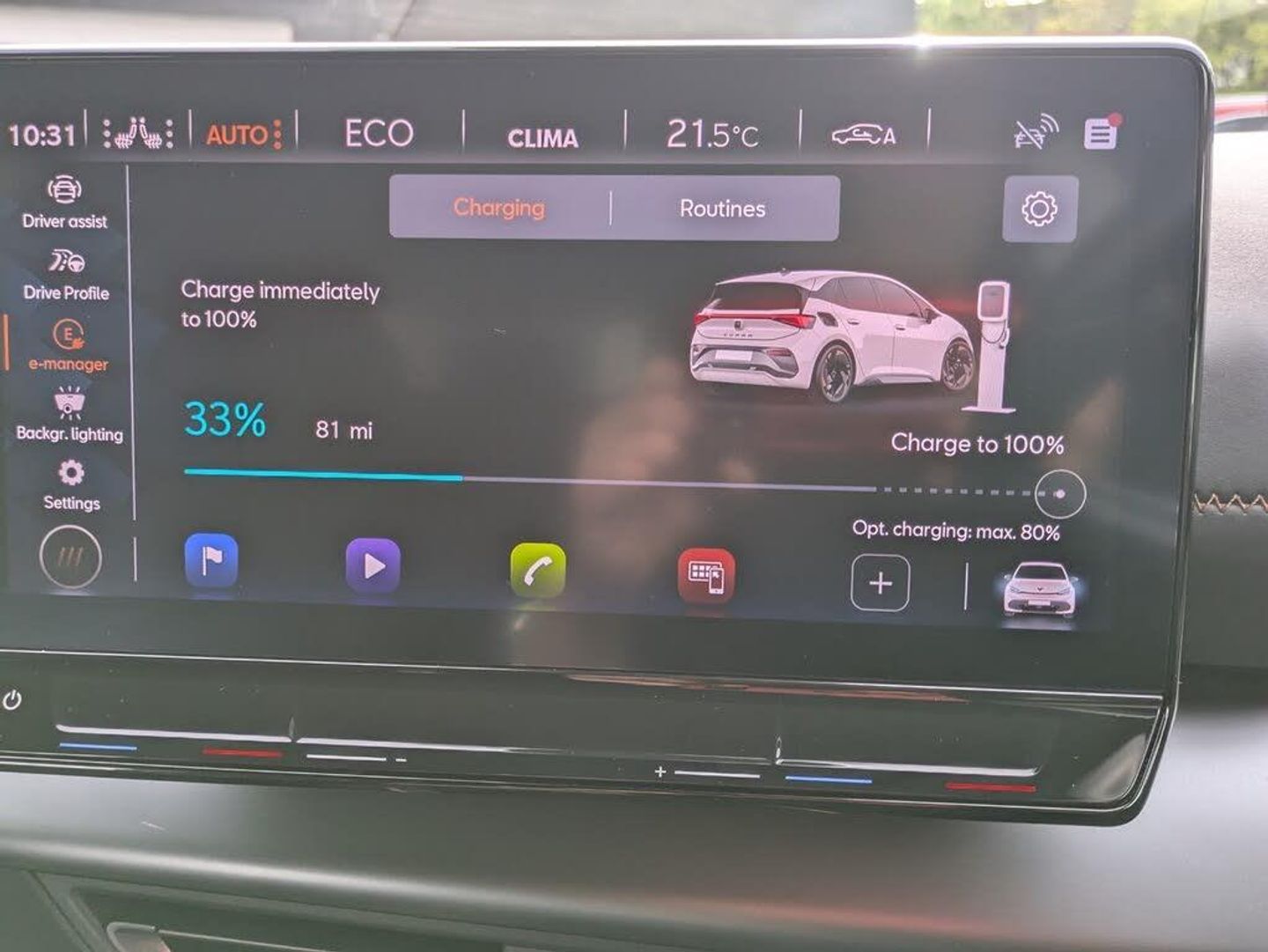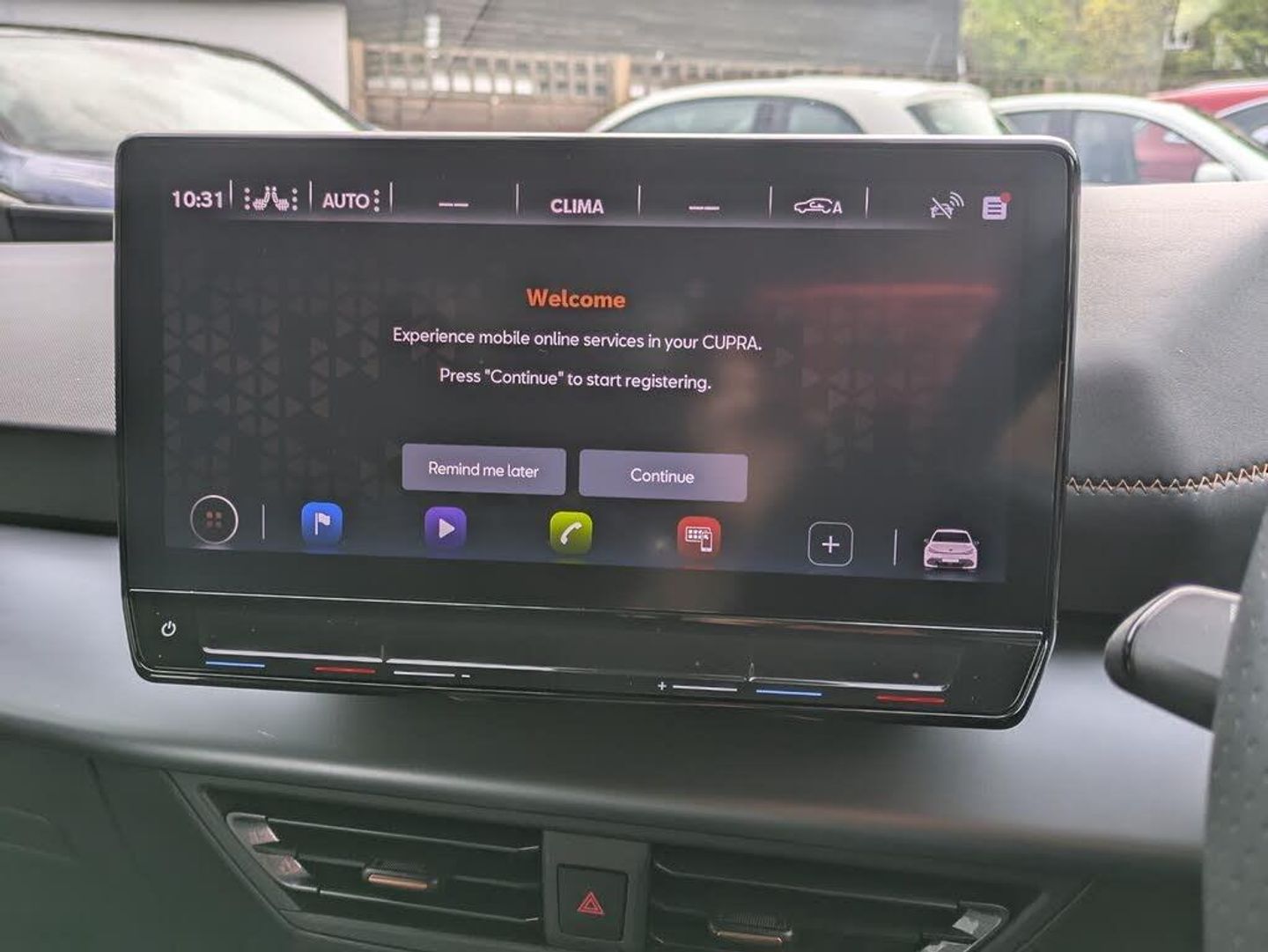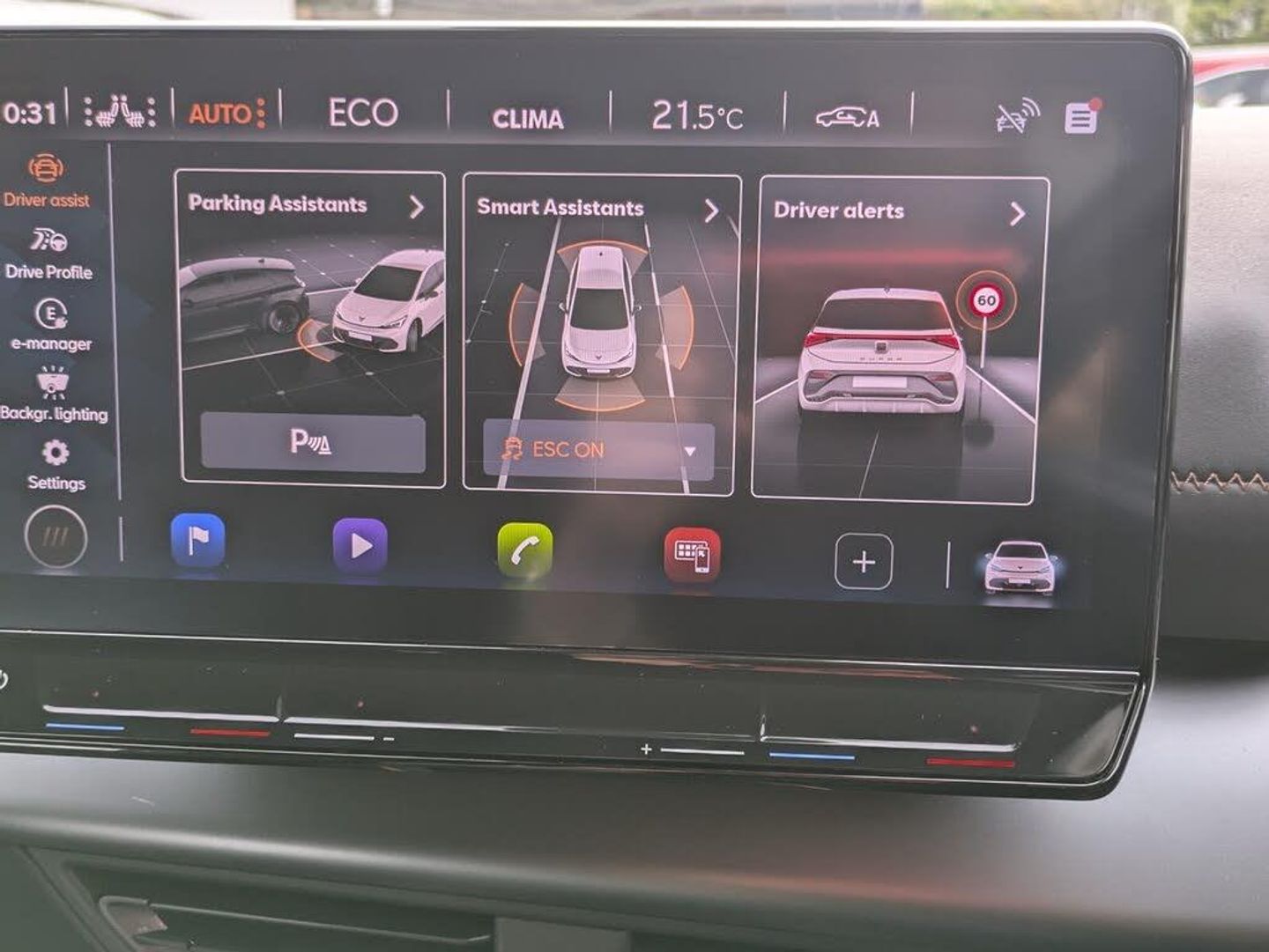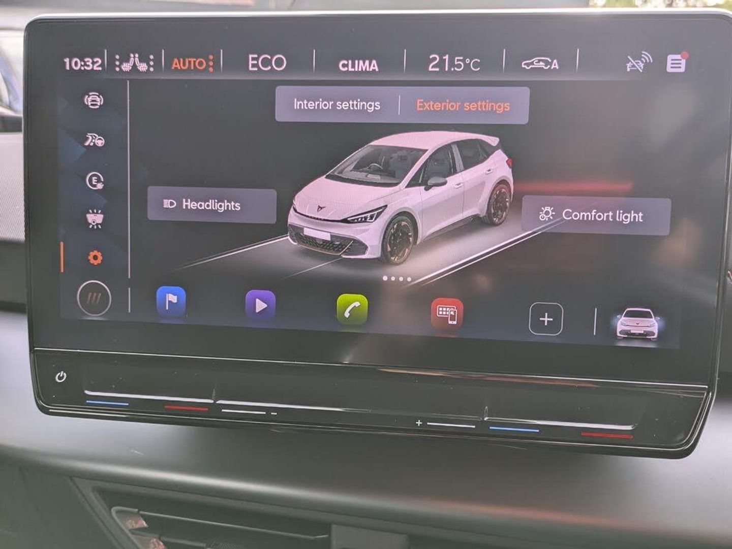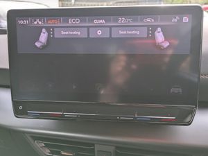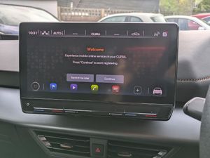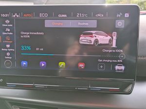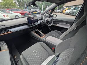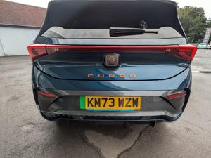 5.3" digital cockpit with 12" central display infotainment system, Augmented reality head up display, Driving profile selection - Range, Comfort, Performance, Individual, Dynamic steering, e-call service, Emergency steering support with turn assist, Forward collision warning with automatic braking, Lane assist, PAS, Tailgate, Voice assistant, Wireless full link smartphone integration, 11 kW onboard charger, 120kW DC charging capacity, Charging cable mode 3, type 2/3 32 A, Shock absorption in front, Sports rear shock absorption, 2x USB sockets in front, 2x USB sockets in rear, charge only, DAB (Digital Audio Broadcasting) and AM/FM radio, Acoustic windshield, Auto dimming rear view mirror, Dark tinted rear windows, Daytime running lights, Electric adjustable/heated/folding door mirrors, Full LED headlights, Grey exterior mirrors, Heat insulated glass, LED 3rd brake light, LED rear lights, Rear side wing doors, Rear wiper, Transport protection film, Variable intermittent wiper, Welcome home function and adverse weather function, Windshield wiper with light/rain sensor, 3 seat bench in 2nd row, Aluminium pedals, CUPRA emblem on steering wheel, Dual zone climate control, Electric auxiliary air heater, Heated front seats, Heated leather wrapped multi function steering wheel, Integrated front head restraints, ISOFIX points in outer rear seats with top tether anchorage points, Manual height adjustable front seats, Multi-colour ambient interior lighting, Rear headrests, SEAQUAL Yarn cloth upholstery, Single front passenger seat, Sunvisors with illuminated mirror, Unsplit rear seat bench, split folding backrest, without centre armrest, 3 point seatbelts on all rear seats, Driver and front passenger airbags with front passenger airbag deactivation, side airbag in front with curtain airbag and front interaction airbag, Extended safety system with proactive passenger protection system, Manual child lock in rear doors, Tiredness recognition system, driver alert system, Tyre pressure monitoring system, Visual and acoustic seat belt reminder, Anti theft alarm system with interior monitoring in cab, backup horn and towing protection, Anti theft wheel bolts, Keyless go central locking system, 19" Typhoon alloy wheels, Tool kit, Tyre repair kit