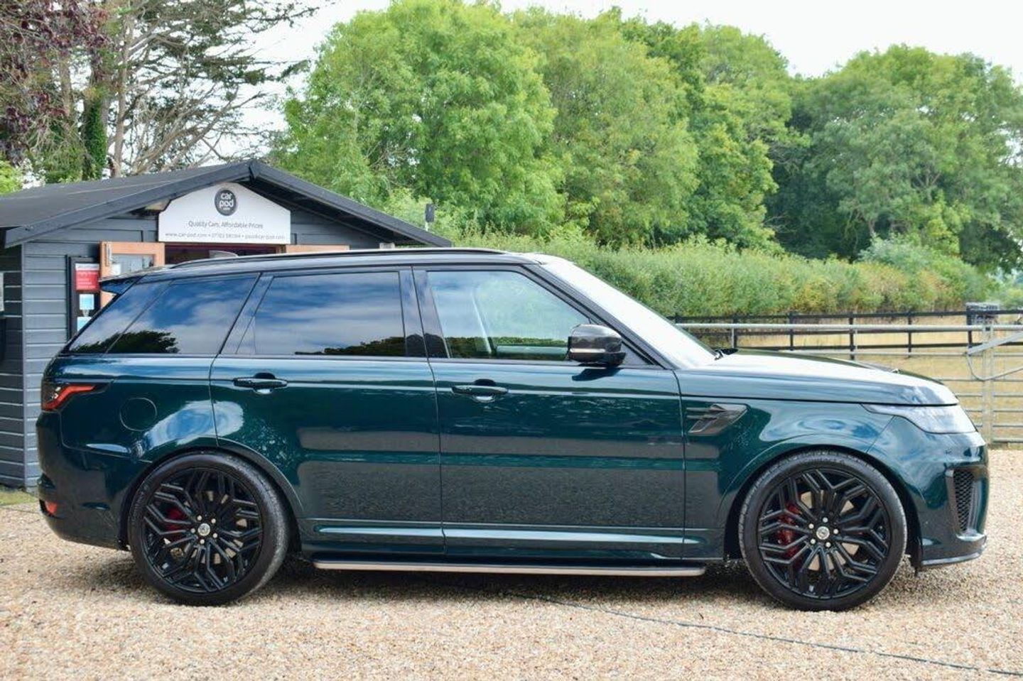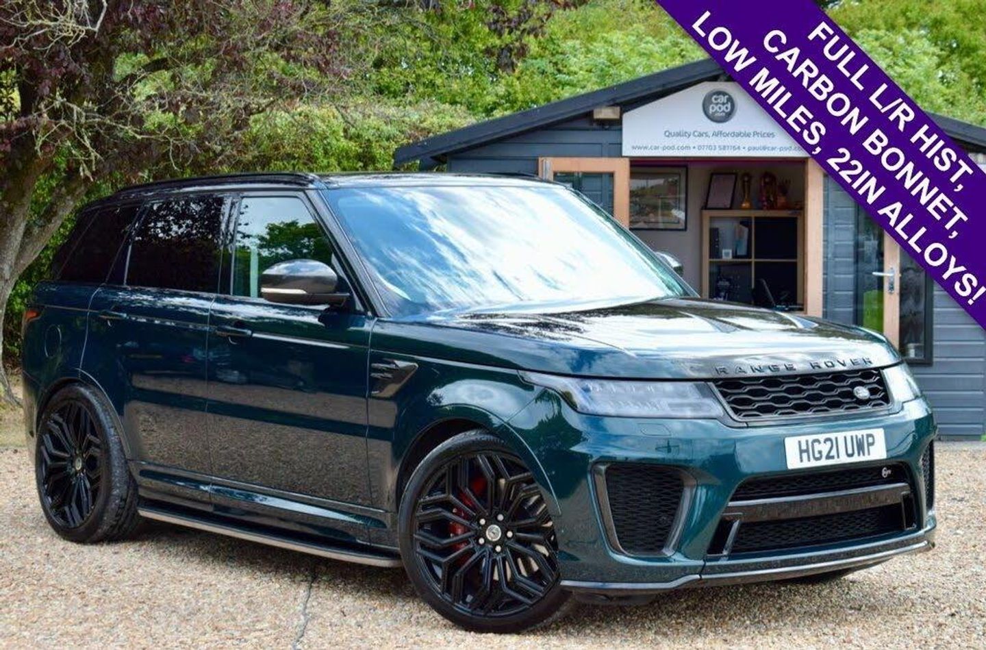 Welcome to Car-Pod and our advert for this stunning British Racing Green Carbon Edition Range Rover SVR which joins us with just 2 Owners from New, Low Mileage, Full Land Rover Service History (services at 3k, 8k, 15k and 23k miles) and an MOT until 1st May 2026. Beautifully presented throughout, this head turning SUV comes loaded with spec including 22in Urban Alloys, Carbon Bonnet and Wing Mirrors, Sliding Panoramic Roof, Meridian Sound, Sat Nav, Reversing Camera, Front and Rear Sensors, Electric Boot Opening, Heated Front and Rear Seats, DAB Radio, Bluetooth, 2 Remote Keys and much more. First to see will buy, so call now to book your personal viewing! Highly competitive finance available with £0 deposit, call us for an instant quote. Credit & Debit Cards Accepted. Maximum £250 Credit Card Payment accepted. We deliver nationwide upon request. For more info, photos, video's or to arrange a viewing, please call us on 07703 581764 or visit www.car-pod.com. We are proud winners of the 'Highly Commended' Award for 'Car Retailer Customer Service Excellence', presented to us at the Auto Industry Excellence Awards 2020.