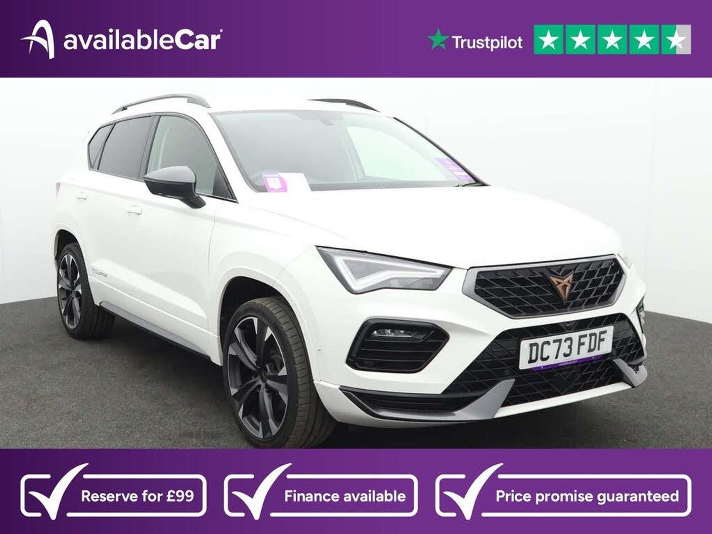 12V Socket in Front,19in Alloy Wheels - Sport Machined - Black and Silver,ABS - Anti-Lock Braking System - TCS - Traction Control System - ESC - Electronic Stability Control - XDS - Electronic Differential Lock System,Alarm,Ambient Lighting - Multi-Coloured and LED Interior Illumination,Bucket Sports Seats,CUPRA Connect,CUPRA Emblem on Steering Wheel,Convenience Pack,Cruise Control with Speed Limiter,Dark Tinted Rear Windows,Daytime Running Lights,Digital Cockpit,Door Mirrors Electrically Adjustable - Folding and Heated,Driver and Front Passenger Airbags with Front Passenger Airbag Deactivation,Driving Profile Selection and Conventional Shock Absorber,Dual-Zone Climate Control,Dynamic Headlight Range Control with Self-Adjusting Whilst Driving,Electric Driver Seat with Memory Function,Electric Front and Rear Windows,Electronic Parking Brake with Autohold Function,Front Assist including Autonomous Emergency Braking,Front Centre Armrest,Front Seat with Back Storage Pockets,Front Side Airbags,Front and Rear Seat Belt Reminders,Front and Rear Shock Absorption - Chassis with Increased Height,Headlining - Grey,Heated Steering Wheel,ISOFIX Points in Outer Rear Seats with Top Tether Anchorage Points,Illuminated Aluminium Front Door Sill,Interior Lighting,Keyless Entry,LED Headlamps with Lens and LED Fog Lamps with Cornering Function,LED Rear Taillights,Leather Sports Steering Wheel with Wheel-Mounted Gearshift Paddles and Leather Gear Stick,Locking Wheel Bolts,Navigation System Plus,Pedal Cluster,Rear Armrest with Access to the Boot,Rear Spoiler,Rear View Camera,Roof Rails - Black,Safety and Driving Pack,Self Parking Functionality includes Front and Rear Parking Sensors,Split Folding Rear Seats - 60-40,Standard Rear Exhaust Pipes,Tiredness Recognition System,Tyre Pressure Monitoring System,Virtual Pedal and Electric Tailgate,Wheel Arch Surrounds - Body Coloured,Wireless Full Link Smartphone Integration,Wireless Phone Charger