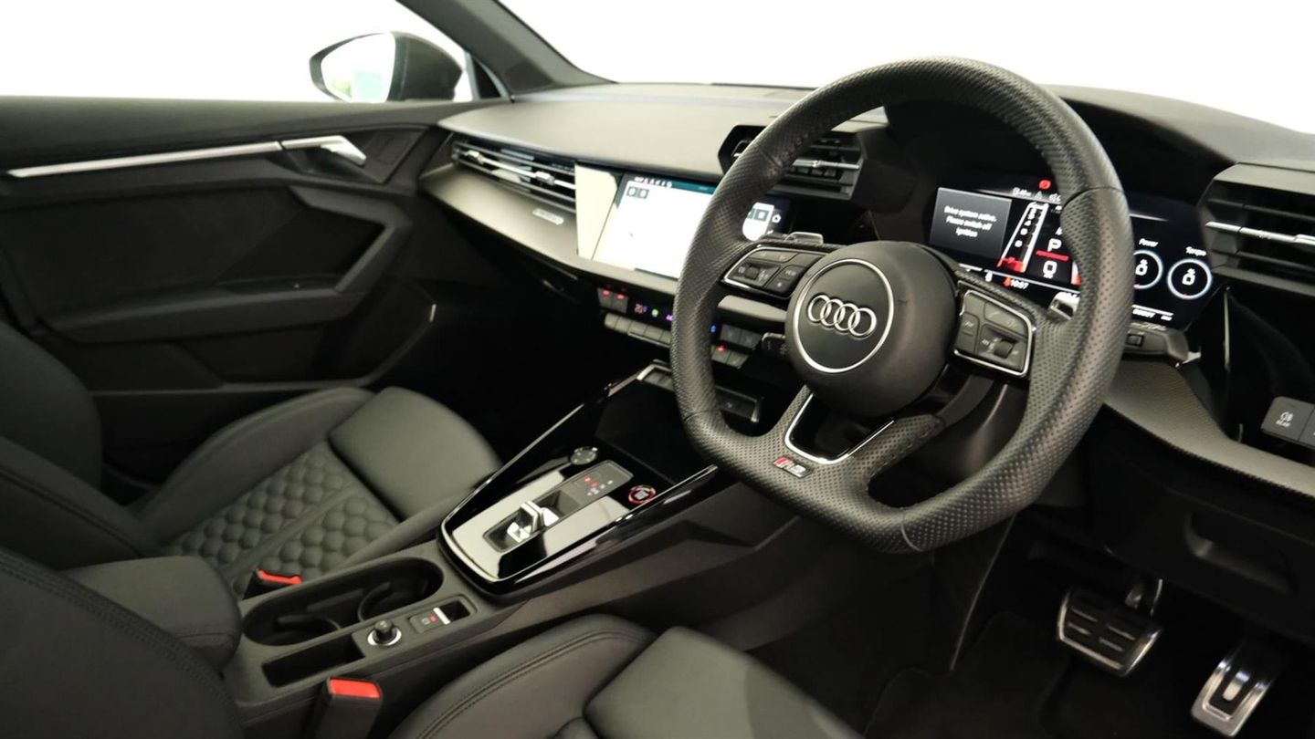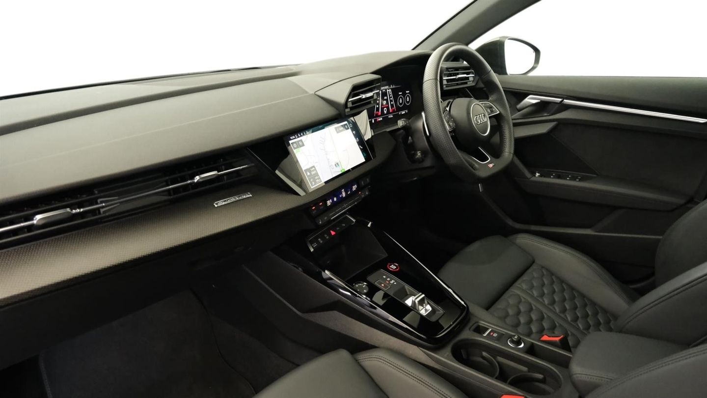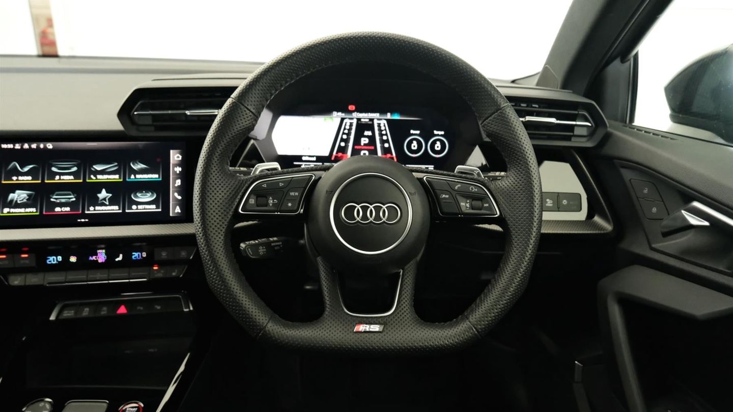 Reserve Online,Comfort and Sound Pack,Bang & Olufsen Premium Sound System with 3D sound,Rear view camera system,MMI navigation plus with MMI touch - RS3,Audi smartphone interface,Audi virtual cockpit with RS specific display 12.3" full colour digital instrument cluster,Audi matrix LED headlights LED rear lights, dynamic front and rear indicators and headlight cleaning system,Light and rain sensors,Auto dimming rear view mirror,Tyre pressure loss indicator,Parking assist with parking system plus,RS sports exhaust system,Dual zone electronic climate control,Heated front seats,Ambient lighting pack - RS3,Audi beam uses LEDs to project the Audi sport logo onto the ground as you exit your RS 3,Carbon roof spoiler