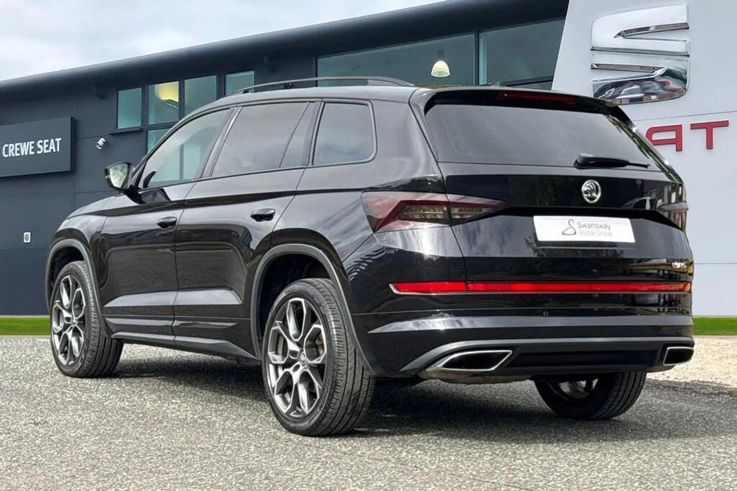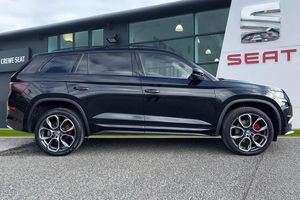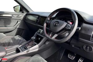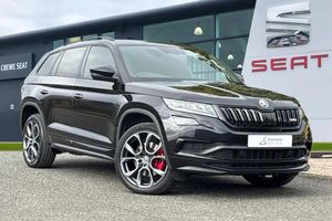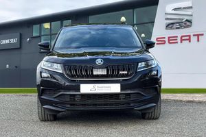 Alloys, Bluetooth, Sat Nav, Touchscreen, Cruise Control, Advanced Safety, Heated Seats, Keyless Entry, Parking Sensor;**Please note that this vehicle may be located off-site at our compound please call ahead to book a viewing/test drive** The Skoda Kodiaq 2.0 BiTDI vRS DSG 4WD Euro 6 (s/s) 5dr is a striking seven seat performance SUV finished in the sleek Black Magic paintwork, enhanced by distinctive vRS design elements and premium detailing. Its commanding presence is defined by 20 inch Xtreme alloy wheels, a gloss black radiator grille, chrome exhaust accents, a rear diffuser, and sporty front and rear bumpers. The dual exhaust pipes and subtle vRS badging on the grille and boot lid underline its athletic character. Inside, the cabin combines practicality with a performance-inspired feel, featuring Alcantara door panels with vRS stitching, a carbon finish dashboard and door inserts, piano black decorative elements, and door sill panels bearing the Kodiaq logo. The 3 spoke leather multi function steering wheel, which is also heated, sits ahead of the Virtual Cockpit digital display, providing a fully customisable driving interface. Comfort is assured with heated front seats, electrically adjustable heated and folding door mirrors with memory function, adaptive cruise control, and privacy glass, while KESSY keyless entry and start adds convenience. Technology is at the forefront with the Columbus 9.2 inch touchscreen satellite navigation system, SmartLink Plus smartphone connectivity, Bluetooth, and a premium sound and infotainment setup. Dynamic Chassis Control and drive mode selection...