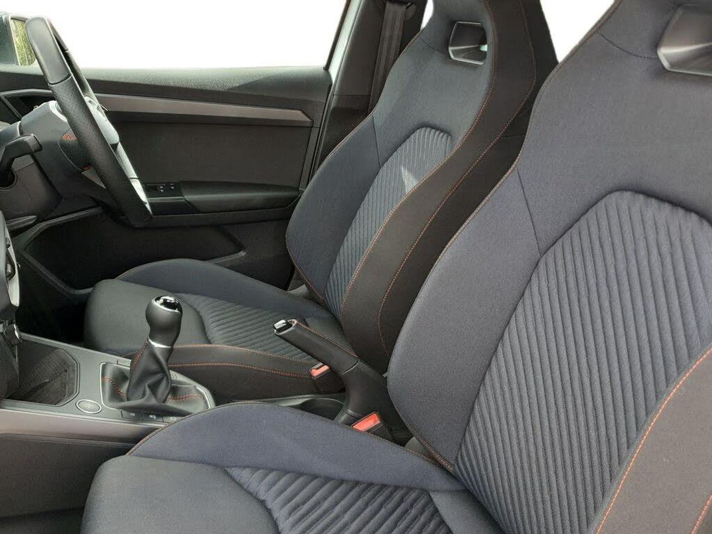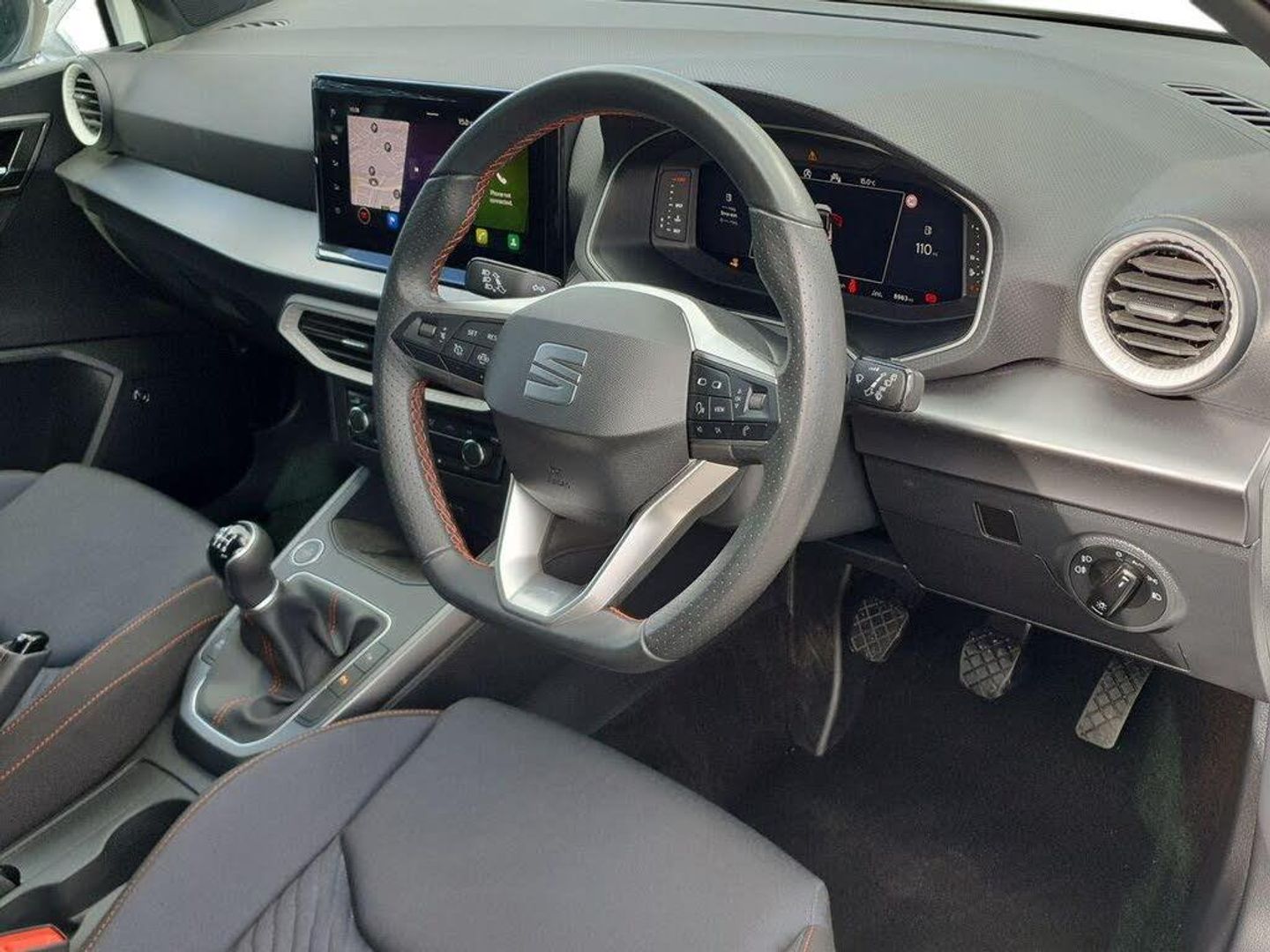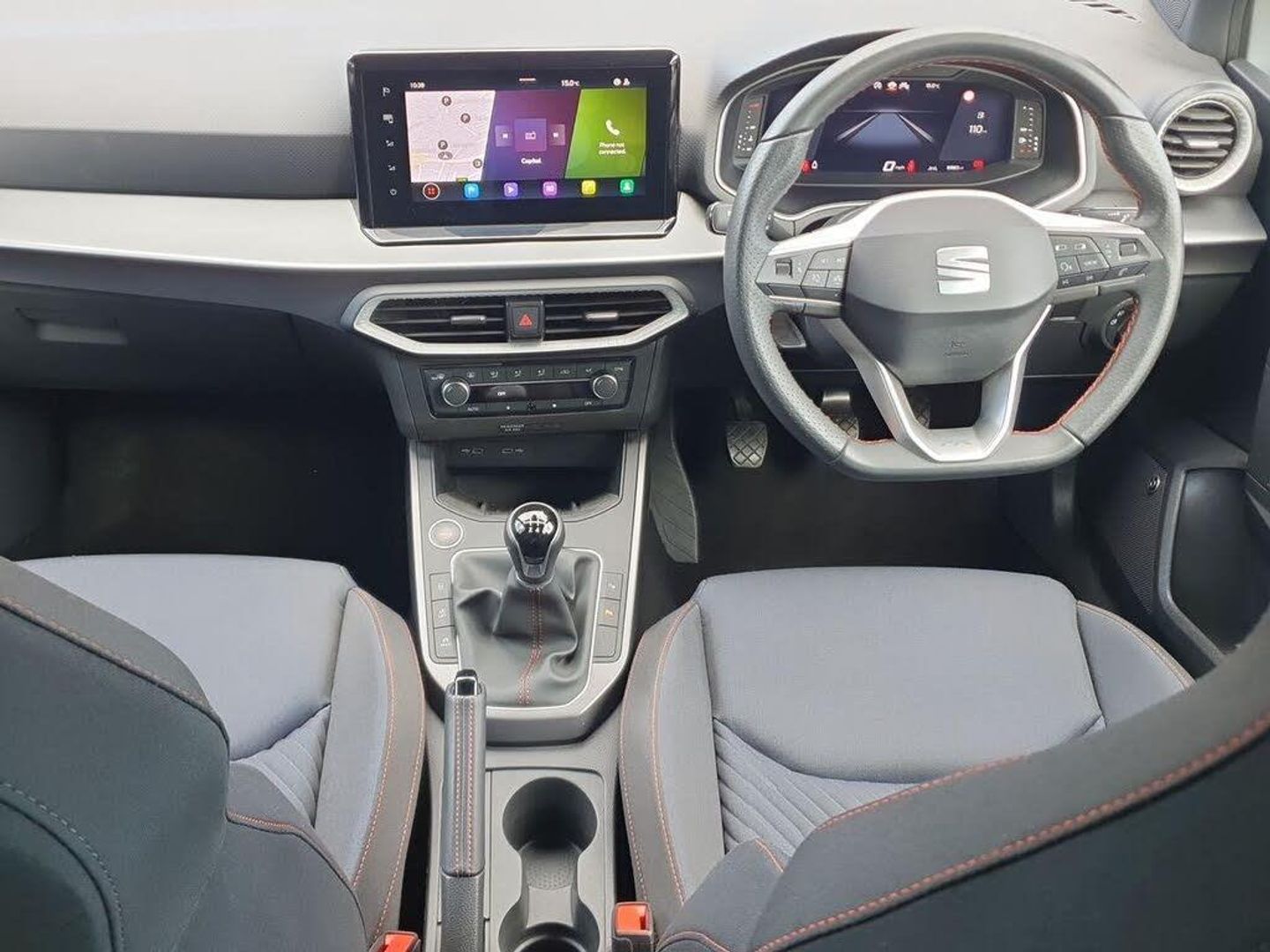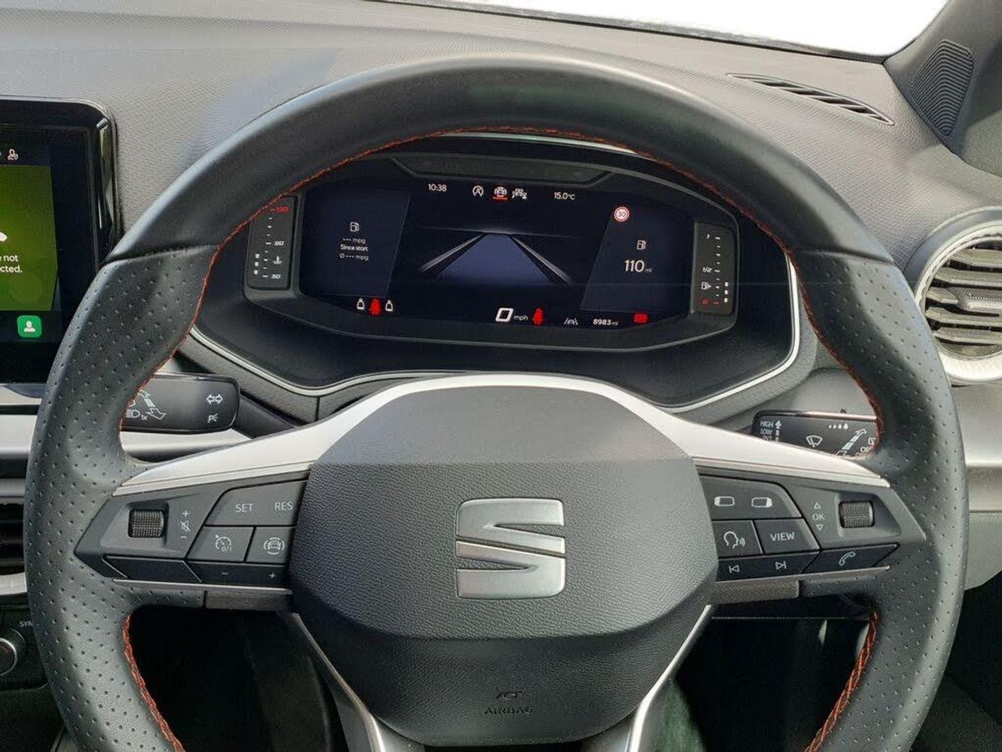 'Lights On' Reminder warning buzzer, 10" Digital cockpit, Digital clock, E-call, Electric speed sensitive power steering, Full Link Smartphone Integration with Mirror Link, Apple Car Play, Google Android Auto with USB Type C cable for Apple and Android compatibility, Lane keeping system, Low fuel warning light, Outside temperature display, Park assist system, Rear view camera, RPM counter, SEAT Drive profile - Four different models normal-sport-eco-individual, steering response, throttle response, Trip computer, Wireless phone charger, 9.2" colour touchscreen with navigation system, voice control and USB port (type c), Bluetooth interface for hands free and audio streaming, DAB digital radio and AM/FM radio, Steering wheel mounted audio controls, Anti theft roof antenna, Auto dimming interior rear view mirror, Automatic activation of hazard warning lights, Body coloured bumpers, Body coloured door handle inserts, Chrome roof rails and window surrounds, Dark tinted rear windows, Electric front/rear windows, Electrically adjustable, heated and folding door mirrors, Front fog lights with cornering function and rear fog light, FULL LED automatic headlights with dynamic headlight range control, coming and leaving home, LED daytime running lights, LED rear tail lights and licence plate lights, Protective side mouldings, Rain sensing wipers, Rear side wing doors, Rear spoiler, Rear window wash/wipe, Roof colour door mirrors, Third brake light, Twin exhaust pipe styling hidden exhaust pipe, Visible VIN plate, 2 cupholders, 3 seat bench in 2nd row, 60/40 split folding rear seat, Aircare filter, Black interior roof, Double boot floor, Driver sunvisor with covered mirror + card holder, Dual zone climate control, Front courtesy light with front reading lights, Front sport seats, Gear shift indicator, Grey interior air vents, Height adjustable front seats, Height/reach adjustable steering column, Illuminated boot, Instrument lighting with brightness control, Interior ambient lighting, Interior light in footwell, central console and door panel, ISOFIX points in outer rear seats with top tether anchorage points, Microsuede cloth upholstery + sports bucket seats, Passenger sunvisor with vanity mirror, Perforated flat bottomed leather steering wheel/gear knob/handbrake with red stitching and FR logo, Potentiometer, Single front passenger seat, Two front and three rear height adjustable headrests, Interior chrome pack - Arona, Safe and driving pack (S) - Arona, 3 point seatbelts on all rear seats, ABS, Active front headrests, Child locks on rear doors, Driver and front passenger airbags with front passenger airbag de activation, front side and curtain airbags, Electronic Stability Control (ESC), Emergency Brake Assist (EBA) and front assist, Front and rear seatbelt reminder, Hill hold control, Multi-Collision braking, Tiredness recognition system, Traction control, Tyre pressure monitoring system, Alarm with back-up horn, Electronic engine immobiliser, KESSY Keyless entry and go, Locking wheel bolts, Remote central locking + deadlocks, Tow away protection, Titan black dashboard, 18" Performance Cosmo grey alloy wheels