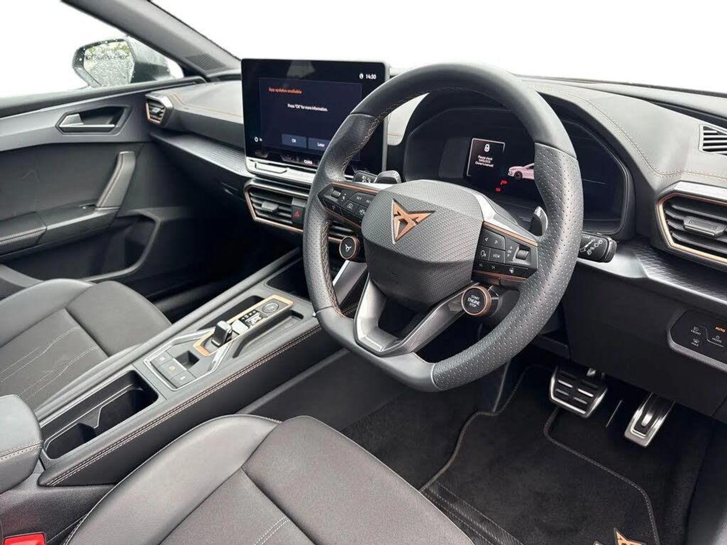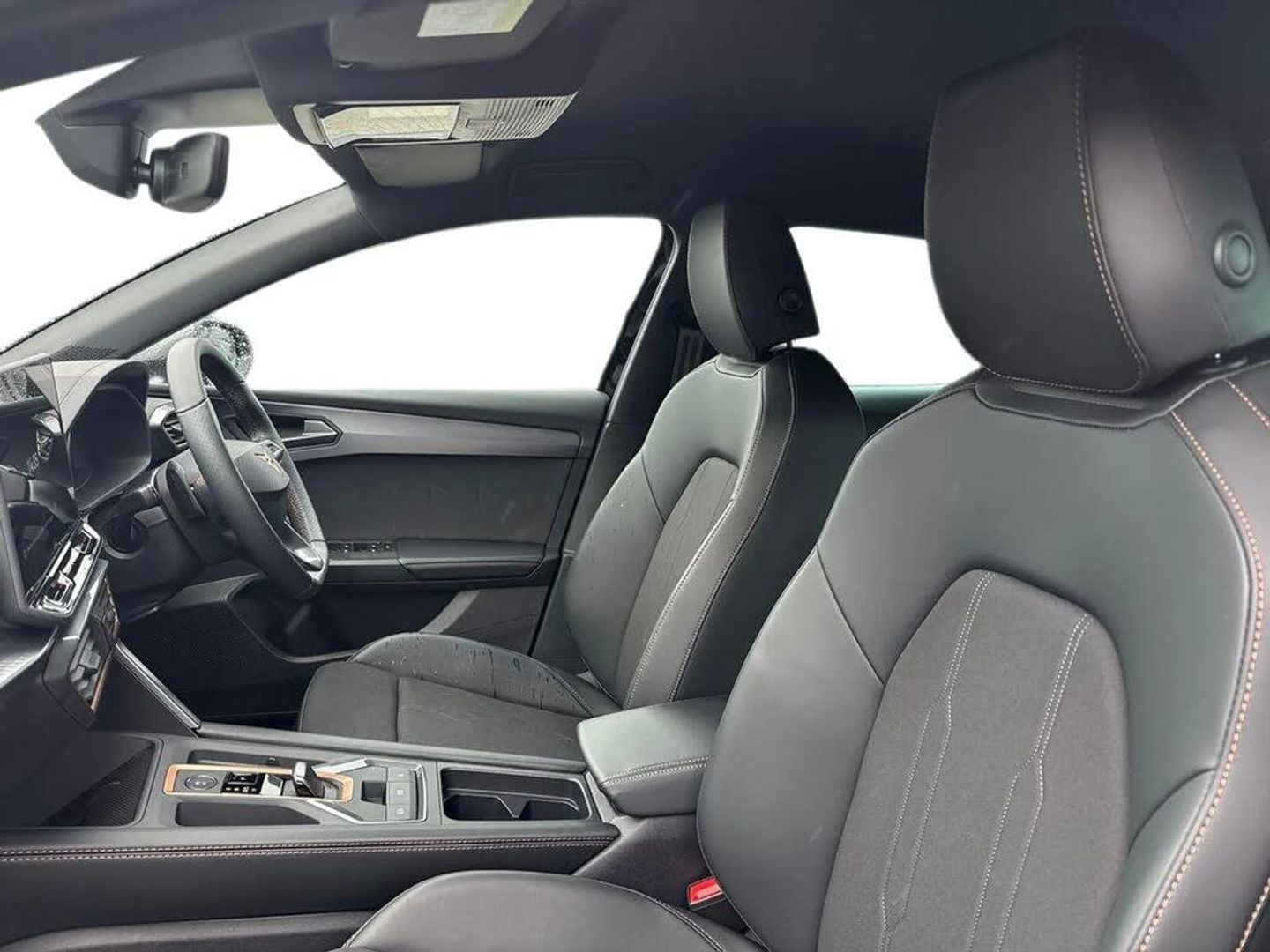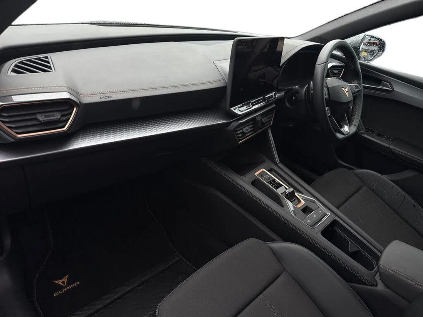 Dark tinted rear windows,Electric front/rear windows,Rain sensing wipers,Rear wash/wipe,Body colour door handles,Body coloured bumpers,Cupra sports bumpers,Rear side wing doors,High beam assist,LED front fog lamps with cornering function,LED headlights with dynamic turn signals,tail lights,rear fog lights with rear coast to coast lighting,LED rear fog lamp,Separate daytime running light with automatic headlight control and coming home feature,Third brake light,Welcome light with logo projector in door mirrors,ABS,Brake control system - ESC and brake booster,Cupra black brake calipers,Electronic parking brake,Hill hold control,Rear disc brakes,Adaptive cruise control with follow-to-stop and speed limiter,CUPRA drive profile selection with (Comfort/Sport/Individual),throttle response and gearshift mode,Dynamic road sign display,Front and rear parking sensors,Front assist with forward collision warning braking reaction to vehicles,pedestrians and cyclists,Lane assist,PAS,Auto dimming rear view mirror,Electrically adjustable,heated and folding door mirrors,3 point seatbelts on all rear seats,Child proof door locks,Driver and front passenger airbags with front passenger airbag de-activation,front side and curtain airbags,Seat belt reminder for front and rear seats,Tiredness recognition system,Tyre pressure monitoring system,E-call,Full link smartphone integration with Mirror Link,wireless Apple CarPlay and wired Google Android Auto,7 speakers,Auxiliary input socket,Lockable tailgate,Start/stop system with regenerative braking,Wireless phone charger,Digital cockpit,Four x USB Type C ports (2 in front and 2 in rear),RPM,trip computer,outside temp gauge,instrument light brightness,low fuel warning light,lights on reminder,gearshift indicator,Service interval indicator,Chrome and copper interior detailing,3 seat bench in 2nd row,5 headrests,60/40 split rear bench seat with armrest,Driver and passenger seat with manual height and lumbar adjustment,ISOFIX points in outer rear seats with top tether anchorage points,Single front passenger seat,Three zone climate control,12v power supply in centre console,Black headlining,Cloth/PVC upholstery,Cupra sports pedals,CUPRA Supersports,heated steering wheel with satellite buttons,Folding boot cover,Front centre armrest,Height/reach adjust steering wheel,Illuminated interior front door sills,Storage pockets on rear of front seats,Ambient lighting with glovebox,footwell and single monocolour,Front and rear reading lights X 4,Sunvisors with illuminated mirror,Media system plus with 12.9" display + navigation pack - Leon Cupra,Anti theft alarm system with interior monitoring in cab,backup horn and towing protection,Central locking system Keyless Go,Locking wheel bolts,18" Windstorm machined sport black matt and silver alloy wheel with 92Y XL tyres,Tool kit