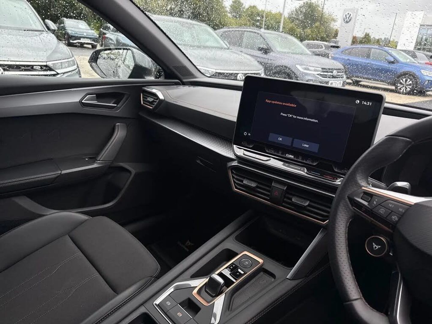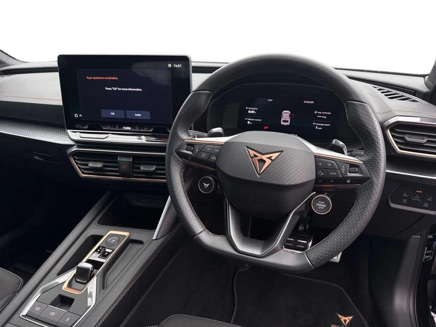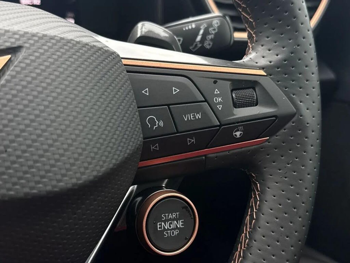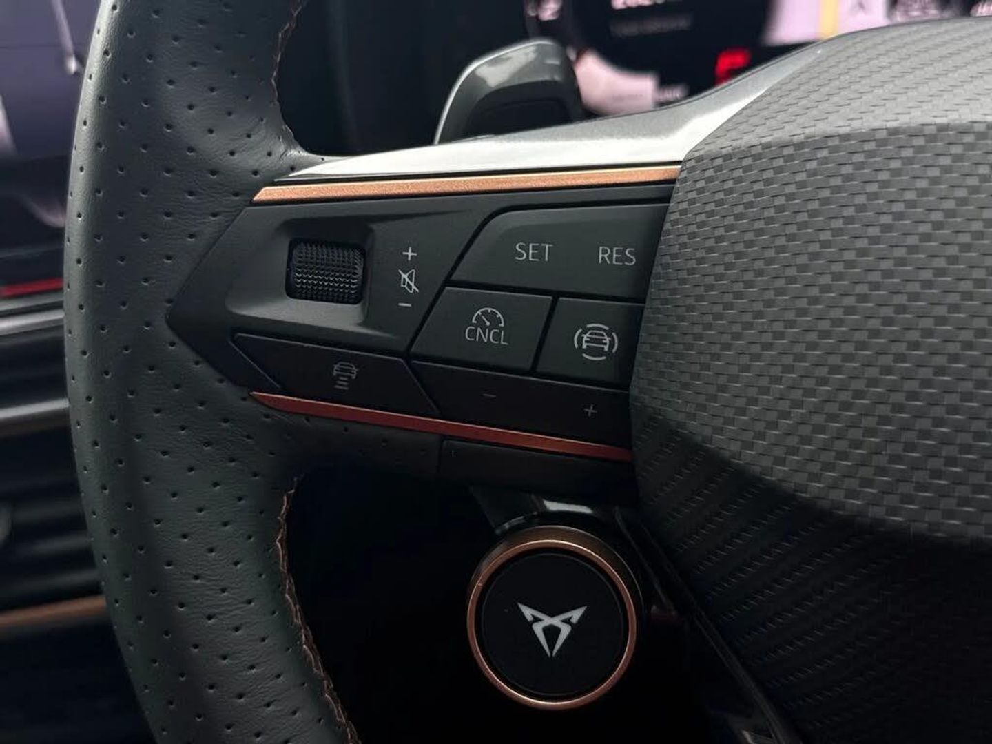 Dark tinted rear windows,Electric front/rear windows,Rain sensing wipers,Rear wash/wipe,Body colour door handles,Body coloured bumpers,Cupra sports bumpers,Rear side wing doors,High beam assist,LED front fog lamps with cornering function,LED headlights with dynamic turn signals,tail lights,rear fog lights with rear coast to coast lighting,LED rear fog lamp,Separate daytime running light with automatic headlight control and coming home feature,Third brake light,Welcome light with logo projector in door mirrors,ABS,Brake control system - ESC and brake booster,Cupra black brake calipers,Electronic parking brake,Hill hold control,Rear disc brakes,Adaptive cruise control with follow-to-stop and speed limiter,CUPRA drive profile selection with (Comfort/Sport/Individual),throttle response and gearshift mode,Dynamic road sign display,Front and rear parking sensors,Front assist with forward collision warning braking reaction to vehicles,pedestrians and cyclists,Lane assist,PAS,Auto dimming rear view mirror,Electrically adjustable,heated and folding door mirrors,3 point seatbelts on all rear seats,Child proof door locks,Driver and front passenger airbags with front passenger airbag de-activation,front side and curtain airbags,Seat belt reminder for front and rear seats,Tiredness recognition system,Tyre pressure monitoring system,E-call,Full link smartphone integration with Mirror Link,wireless Apple CarPlay and wired Google Android Auto,7 speakers,Auxiliary input socket,Lockable tailgate,Start/stop system with regenerative braking,Wireless phone charger,Digital cockpit,Four x USB Type C ports (2 in front and 2 in rear),RPM,trip computer,outside temp gauge,instrument light brightness,low fuel warning light,lights on reminder,gearshift indicator,Service interval indicator,Chrome and copper interior detailing,3 seat bench in 2nd row,5 headrests,60/40 split rear bench seat with armrest,Driver and passenger seat with manual height and lumbar adjustment,ISOFIX points in outer rear seats with top tether anchorage points,Single front passenger seat,Three zone climate control,12v power supply in centre console,Black headlining,Cloth/PVC upholstery,Cupra sports pedals,CUPRA Supersports,heated steering wheel with satellite buttons,Folding boot cover,Front centre armrest,Height/reach adjust steering wheel,Illuminated interior front door sills,Storage pockets on rear of front seats,Ambient lighting with glovebox,footwell and single monocolour,Front and rear reading lights X 4,Sunvisors with illuminated mirror,Media system plus with 12.9" display + navigation pack - Leon Cupra,Anti theft alarm system with interior monitoring in cab,backup horn and towing protection,Central locking system Keyless Go,Locking wheel bolts,18" Windstorm machined sport black matt and silver alloy wheel with 92Y XL tyres,Tool kit