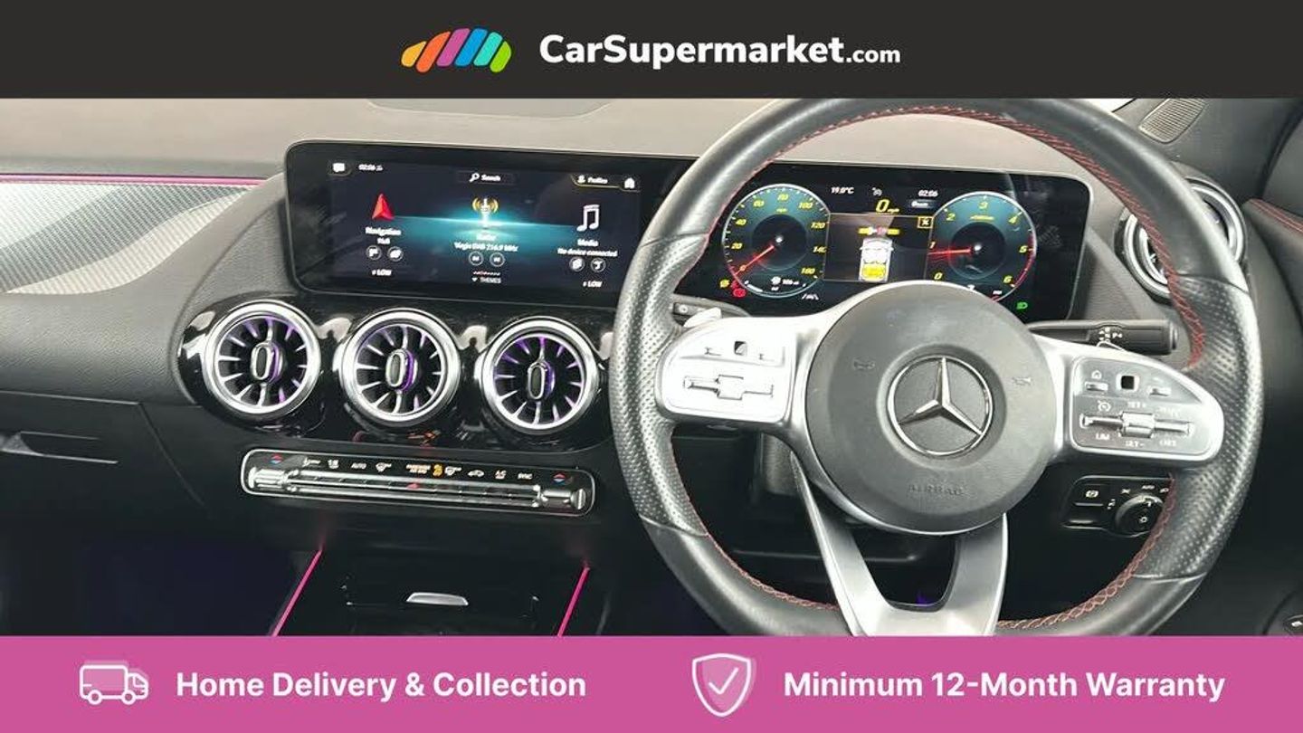 10.25 inch touchscreen central media display,10.25" Digital instrument cluster display screen,Active lane keeping assist,Attention assist,Cruise control + speed limiter,Direct steering,DYNAMIC SELECT with a choice of driving modes (ECO, Comfort, Sport and Individual),ECO start/stop function,Fluid level warning indicator for fuel, oil, coolant and washer fluid,Hard-disk navigation,Hey Mercedes Voice activation,Lamp failure indicator,Mercedes me connect including emergency call system, accident recovery, breakdown and maintenance management,Mercedes me remote services,Multi function trip computer,Outside temperature gauge,Owners manual and service booklet in English,Pre-installation of private car share,Radio aerial integrated into front and rear windshields,Service indicator (ASSYST),Smartphone integration with Apple CarPlay and Android auto,Speed limit assist,Status display for rear seat belts in instrument cluster,Lowered comfort suspension,Rear axle multi-link,2 USB ports (type C) in rear stowage compartment and one in front of center console,Bluetooth connectivity including audio streaming,DAB Digital radio,MBUX multimedia system,Media interface,Mercedes-Benz sound system - 100W,Adaptive brake lights,Aerial for GPS,Aluminium roof rails,AMG front and rear apron,AMG specific/dual flow exhaust pipes in chrome (non-functional),Automatic headlamp activation,Beltline strips and weather strip in chrome,Black grained claddings with chrome parts,Body colour bumpers,Body colour door mirrors,Body coloured door handles with chrome insert for keyless entry,Car wash function,Dark privacy glass from B-pillar backwards,Electric front windows,Electric rear windows,Electrically adjustable and heated door mirrors with integrated LED indicators,Heated glass rear windscreen + timer control,Heated windscreen wash system,Interior mirror with black reading lamps and frameless,LED high performance headlamps with integrated LED daytime running lights,LED tail lights in two piece design,LED third brake light,Matt titanium grey front and rear apron trim,Pre-installation for trailer coupling,Rain sensor windscreen wipers,Rear fog lights,Roof spoiler,Single lamella raditor grille with chrome dotted diamond grille and inlay,12V power socket in centre console,3 spoke multifunction sports steering wheel in nappa leather with flattened bottom and perforated grip area,40:20:40 split folding rear seat backrests,Adjustable head restraints,Air conditioning - Two zone thermotronic luxury automatic climate control with display,Ambient lighting in front headrests,Artico man-made leather/Microfibre Dinamica upholstery with red contrast stitching,Auto Mercedes-Benz child seat recognition sensor,Black roof lining,Brushed door pulls in silver chrome,Courtesy light in boot,Front centre armrest with stowage,Galvanished gear shift paddles on steering wheel,Heated front seats,illuminated door sills with changeable cover,Illuminated glovebox,Interior lighting - 64 colour Ambient lighting,Leather trimmed gearknob,Luggage net on driver/front passenger seat backrest,Manually height and reach adjustable steering column,Multi-gesture touchpad control on center console,Sports pedals in brushed stainless steel with black rubber studs,Sports seats,Stowage compartment in centre console,Stowage compartment with retractable cover,Sunvisors with illuminated vanity mirrors,Twin front cup holders,Two outer rear seat isofix and top tether child seat fixing points,AMG body styling pack - GLA,Comfort seat pack - GLA Class,Interior lighting with light and sight pack - GLA,Load compartment pack - GLA,Mirror pack - GLA Class,Parking pack - GLA,3 rear 3 point seatbelts,ABS with Brake Assist,Active bonnet pedestrain safety measure which detects an impact and raises bonnet by 65mm,Active brake assist includes forward collision warning system with autonomous braking,Adaptive brake assist with hold function and hill start assist,Bonnet with power domes,Brake pad wear warning indicator,Childproof locks manually operated for rear doors and electrically operated for rear power windows,Crash responsive emergency lighting,Driver and passenger head and side airbags,Drivers knee airbag,Dual stage driver/passenger airbags,Electronic parking brake,ESP curve dynamic assist,ESP with ASR,Front and rear seatbelt reminder,Front brake callipers with Mercedes Benz logo lettering on front,Front brake discs internally ventilated and perforated,Front passenger seat occupancy sensor,Tyre pressure monitoring system,Warning triangle and first aid kit,Window airbags,Alarm system with immobiliser and interior protection -Thatcham category 1,Keyless Go starting function,Remote central locking and crash sensor with emergency opening function,Urban guard vehicle protection,Vehicle key with decorative surround in chrome,Carbon structure trim,Chrome air vent surrounds,19" AMG 5 twin spoke light alloy wheels aerodynamically optimised painted in tantalite grey with a high sheen finish,Summer tyres