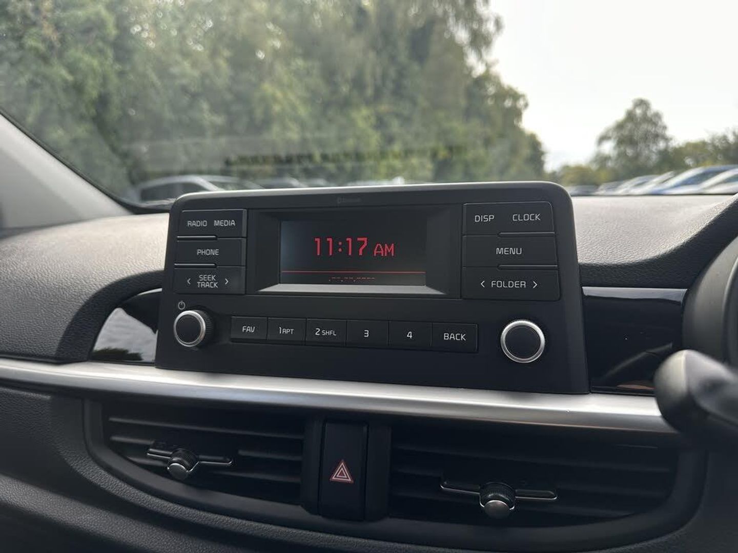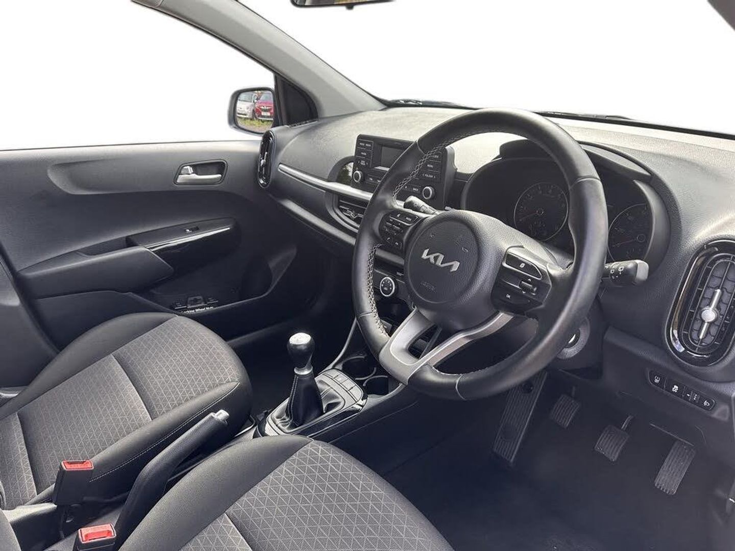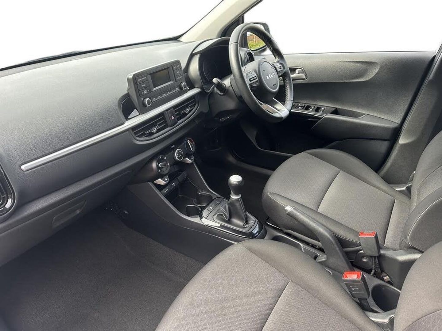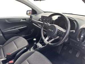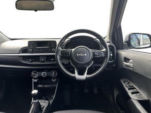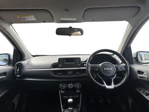3.8" monochrome audio display with RDS and DAB, Emergency call service, Emergency stop signalling system, External temperature gauge, Motor driven power steering, Tachometer, Tailgate, Trip computer, 4 speaker audio system, Bluetooth with music streaming, Steering wheel mounted controls, USB ports for connection of a media device, Automatic headlight control system, Black radiator grille with chrome surround, Body colour bumpers, Body colour mirrors and door handles, Day/night rear view mirror, Daytime running lights, Electric adjustable heated door mirrors, Front and rear electric windows with drivers's auto up/down function, Headlamp levelling, Heated rear window, High mount brake light, MFR - Multi Focus Reflector halogen headlights with black bezel, Rain sensor, Rear fog lights, Rear side wing doors, Rear wash/wipe, Speed variable front wipers, Tinted glass, Visible VIN plate, Welcome and follow-me home light functionality, 1 x rear coat hook, 12V power point front, 2 seat bench in 2nd row, 3 x passenger assist grips, 60/40 split/folding 2nd row of seats, All round height adjustable headrests, Cupholders in centre console, Driver and front passenger sunvisor with vanity mirror, Driver seat height adjust, Front cabin lights, Glovebox, High gloss lower centre fascia trim, door armrest and air vents, ISOFIX Child seat top tethers and anchor fixings, Leather trimmed steering wheel and gearshift, Luggage area light, Luggage area parcel shelf, Manual air conditioning, Passenger front seatback pockets, Premium cloth upholstery, Silver paint finished interior door handles, Single front passenger seat, Slide/reclining front seats, Tilt adjustable steering wheel, Advanced Driver Assistance Pack - Picanto, 2 x 3-point rear seatbelts, ABS/EBD, Automatic unlocking of doors in case of impact, Dual front airbags, ESC + BAS + VSM + HAC, Front passenger airbag cut-off switch, Front seatbelt height adjusters, Front seatbelt pretensioners + load limiters, Hill hold control, Knee airbags, Rear child proof door locks, Seatbelt warning, Side impact protection, Torque vectoring brake based and straight line stability (SLS), Traction control, Twin curtain airbags, Twin front side airbags, Tyre pressure monitoring system, Anti theft alarm, Engine immobiliser, Folding key, Locking wheel nuts, Remote central door locking, 14" alloy wheels, Tyre mobility kit