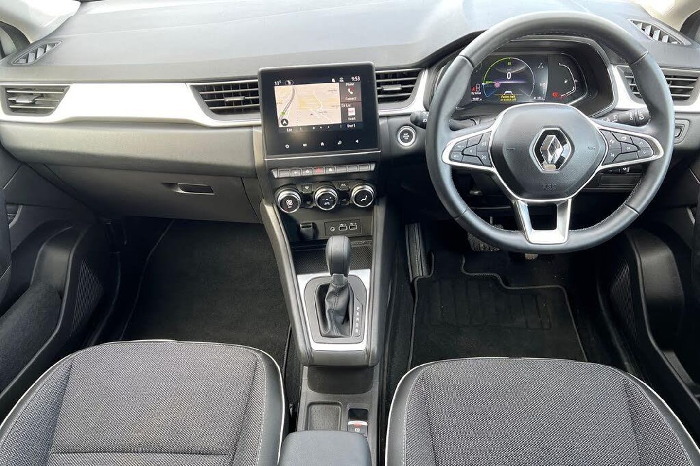 Synthetic Leather-Cloth - Black and Grey with Grey Stitching, Riverside Approved Sale, Remainder of Manufacturers Warranty, No Administration Fees Applicable, 18in Alloy Wheels - Pasadena - Diamond Cut with Grey Insert, 2 Front Reading Lights LED and Central Rear Roof Light with 3 Reading Lights LED, 2 Reverse Gear LED Lamps and 1 Rear LED Fog Lamp in Bumper, 7in TFT Driver Information Display, ABS with EBA - Emergency Brake Assist, AEBS - Active Emergency Braking System, Airbags - Deactivation - Front and Side - Driver and Passenger, Airbags - Driver and Front Passenger - Side - Head and Curtain, Anti Drill Door Locks and Locking Fuel Cap, Auto Dimming Rear View Mirror, Automatic Air Conditioning with One Touch Quick Demist Function and Air Quality Regulator, Automatic Headlights, Automatic Windscreen Wipers with Rain Sensors, Black Side Door Protection with Chrome Insert, Black Soft Touch Dashboard, Bluetooth - DAB Radio and USB Ports, C-Shaped LED Front and Rear Lighting Signature with 3D Effect on the Rear Lights, Central Console with Storage, Central Door Locking, Chrome Around Front Air Deflectors - Front Wing Deco Element and Window Lining, Cruise Control with Speed Limiter, Daytime Running Lights, Deadlocking, Distance Warning Alert, Driver Seat Belt Height Adjustable, ECO Mode Function, ESC - Electronic Stability Control, EV Button to Activate 100% Electric Drive, Easy Link Navigation with 7in Touchcreen, Electric Windows - Front With Driver One Touch Facility and Anti-Pinch Function, Electric Windows - Rear, Electronic Parking Brake with Auto-Hold Function, Extra Tinted Windows - Rear and Tailgate, Front Grille with Chrome on Upper Part, Front Passenger Height Adjustment Seat, Front and Rear No Seatbelt Warning Sound, Full LED Headlights, Gear Change Indicator, HSA - Hill Start Assist, Hands Free Keycard - Keyless Access and Start, Headlights - Automatic High-Low Beam, Heating System with Pollen Filter, ISOFIX Child Seat Fixing Points on Rear Outermost Seats, LDW - Lane Departure Warning, LED Turn Indicators in Side Wing Mirrors, LKA - Lane Keep Assist, Longitudinal Roof Bars, MULTI-SENSE - 3 Driving Modes and 8 Ambient Lighting, Modular Boot Floor, Parking Sensors - Front and Rear, Rear Air Vents, Rear Door and Window Child Locking Function - Front Driver Door Control Panel for Rear Door, Rear LED Fog Lights, Rear Seats - 1-3 2-3 Foldable Sliding Bench, Rear-View Camera, Renault Automatic Emergency Assist - E-Call, Seats - Drivers Height Adjustment, Shark Fin Antenna, Skid Plates - Front and Rear - Grey, Smartphone Integration with Apple CarPlay and Android Auto, Steering Wheel - Height and Reach Adjustable, Steering Wheel - Synthetic Leather, Traffic Sign Recognition with Overspeed Prevention, Trip Computer, Tyre Inflation Kit, Tyre Pressure Warning Light, Variable Power Assisted Steering - Electrical, Windscreen Wipers - Rear, Wireless Phone Charger