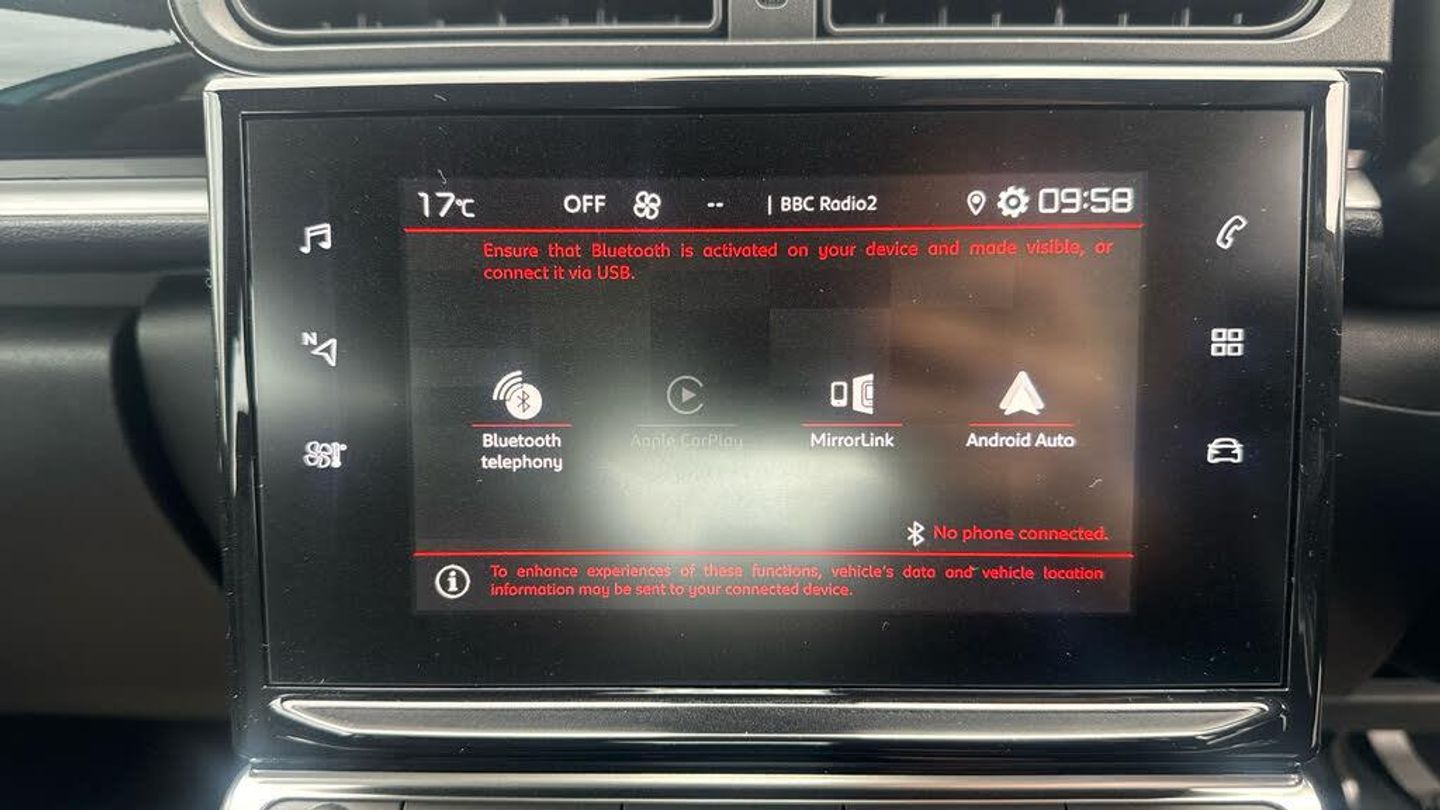 1 USB Socket, 12V Socket, Citroen Connect DAB Radio with 6 Speakers, Coffee Break Alert, Cruise Control with Speed Limiter, Lane Departure Warning System, Multi-Function On-Board Trip Computer, Rear Parking Sensors, Tyre Pressure Monitor, 16in Alloy Wheels - Hellix - Grey - Diamond Cut, 3D Rear Lights Signature, Airbump on Side Door Panel, Bi-Tone Onyx Black Roof, Black Colour Pack, Body Colour Door Handles, Body Colour Front and Rear Bumpers, Chrome Decoration on Front Face - Under Chevrons and around Daytime Running Lights, Citroen Illuminated Signature in LED Headlights and LED Daytime Running Lights, Electrically Adjustable - Heated Folding Door Mirrors, Front Sequential Electric Windows with One-Touch - Open-Close and Anti Pinch System, Matt Black B Pillars, Puncture Repair Kit, Rear Sequential Electric Windows with One-Touch - Open-Close and Anti Pinch System, Roof-Colour Rear View Mirror Caps, Tinted Windows - Side, Fog Lights Integrated into the Front Bumper, LED Daytime Running Lights, LED Headlights, 2-3 - 1-3 Split Folding Rear Bench, Automatic Air Conditioning, Boot Light, Day-Night Switchable Interior Rear View Mirror, Drivers and Passengers Sunvisor with Courtesy Mirror - Non Illuminated, Front Head Restraint with Height Adjustment, Front Lighting Panel with Map Reading Lights, Front Seats Adjustable with Forward-Back Slide and Adjustable Backrest, Gloss Black Dashboard with Grey Surround, Height Adjustable Drivers Seat, Height and Reach Adjustable Steering Wheel, Instrument Cluster with White LCD and Analogue Gauges, Manual Parking Brake with Chrome Finish Button, Parcel Shelf, Rear Windscreen Wiper with Intermittent Mode Linked to Vehicle Speed and Automatic Activation when Reverse Gear Selected, Soft-Touch Gear Lever with Leather-Effect Gaiter and Overstitching, Standard Ambience, Steering Wheel with Satin Chrome Elements and Audio-Telephone Controls, Storage Space Under Touchscreen with Rubber Mat, Three Rear Seats with Headrests, Upholstered Armrest in Front and Rear Doors, Visibility Pack, Power Assisted Steering, ABS - Anti-Lock Braking System, Airbags - Driver, Anti-Theft Alarm, Automatic Activation of Hazard Warning Lights in Case of Severe Deceleration, Automatic Door and Boot Locking when in Motion, Central Locking with Locked Indicators and Interior One-Touch Lock Button, Driver and Front Seatbelts with Pyrotechnic Pretensioners and Force Limiters, Electric Child Locks, ESP - Electronic Stability Programme with Anti-Skid System, Front Passenger Airbag - Can be Deactivated, Front Side Airbags and Front and Rear Curtain Airbags, Hill Start Assist, ISOFIX Mountings on Outer Rear Seats with Top Tether and Labels Indicating Fixing Points, Monotone Horn, Remote Central Locking with Two Plip Keys, Safety Pack, Seatbelt Unfastened on the Move Audible and Visual Alert for Front and Rear Seats, Three Rear Three-Point Seatbelt - Outer Seats have Pretensioners and Force Limiters