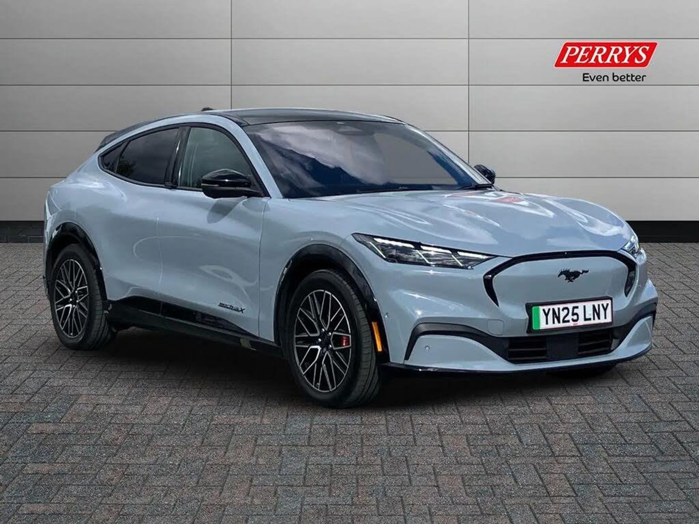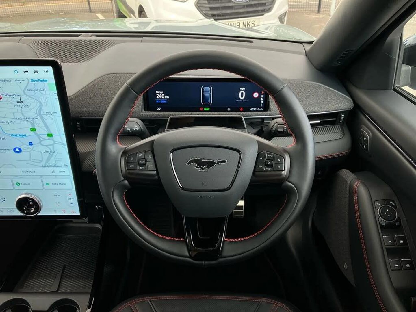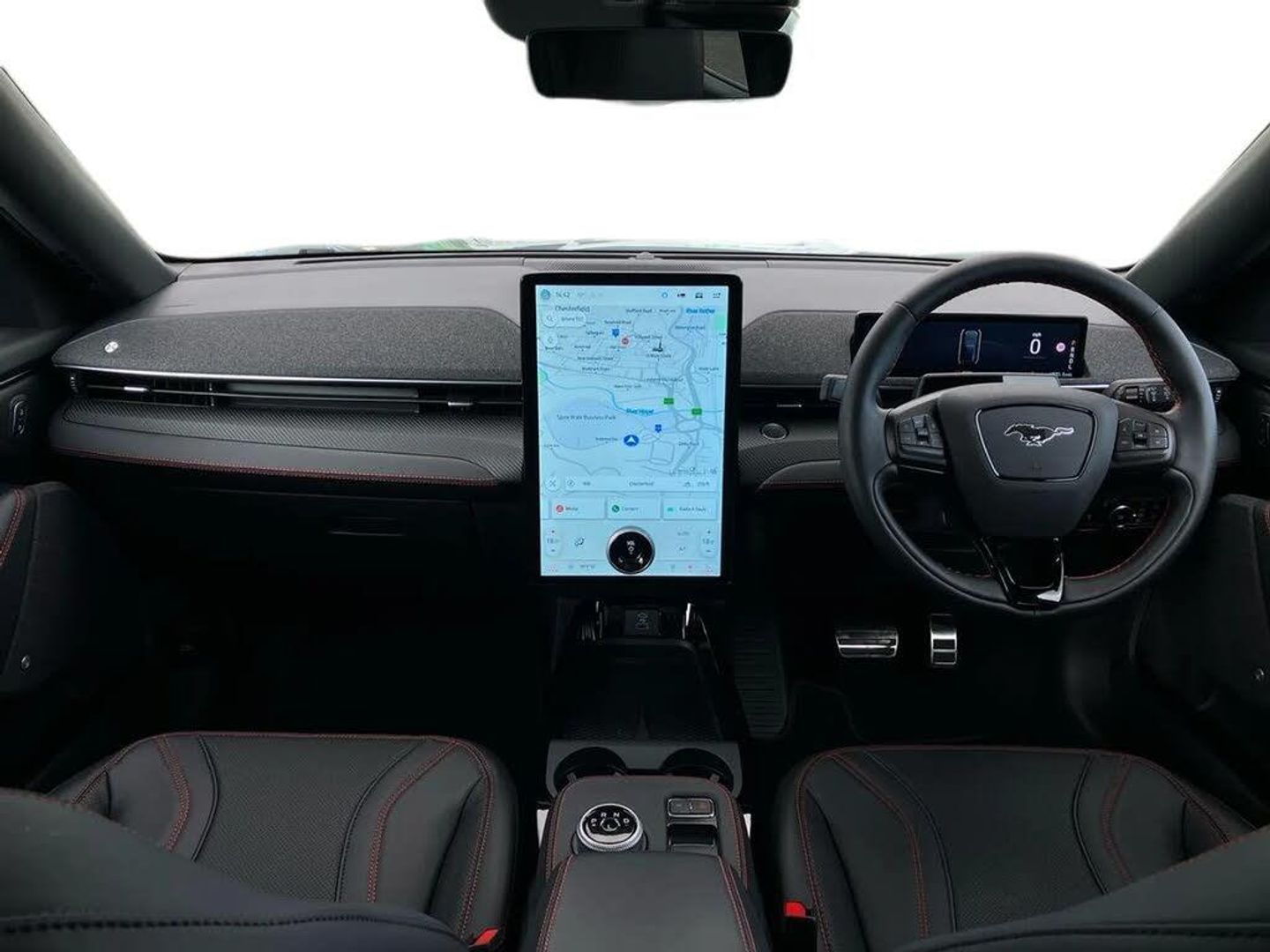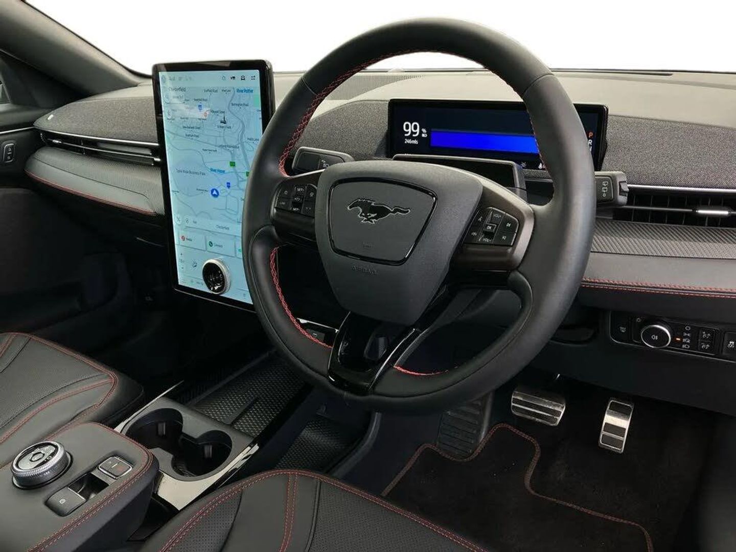 10.2" digital insturment cluster,360 degree camera,Applink remote control system,BLIS (Blind Spot Information System) with cross traffic alert,Distance alert and indication system,Electric power steering,Emergency services call system,Ford SYNC4A with 15.5"Touch,DAB radio,Emer assist,Wireless carplay androidauto,2 front,rear USB ports,FordPass connect,Connected naviation,Front and rear parking sensors,Hands free tailgate,Intelligent adaptive cruise control with stop and go + lane centering,Lane departure warning with lane keeping aid,Selectable drive modes - active, whisper and untamed,Trip computer,Wireless charging pad,11 kW AC onboard charger,150kw high powered charging,Dual motor permanent all wheel drive,Universal home charging cable and public charging cable,B and O premium sound system 10 speaker including dashboard sound bar,Adaptive LED Mustang signature headllamps,Black painted power fold heated mirrors with puddle light mustang logo projection,Blade front grille design,Body colour bumpers,Daytime running lights,Fixed full panoramic roof,LED 3rd brake light,LED Mustang signature tail lights,Quickclear heated windscreen,Rear privacy glass,Rear side wing doors,Rear wiper,Side cladding and wheel arches in piano black,3 seat bench in 2nd row,8 way power driver seats with lumbar support,8 way power passenger seats with lumbar support,Ambient lighting,Dual electronic automatic temperature control,Front headrests,Front trunk,Heated front seats and steering wheel,One pedal drive,Perforated full sensico artificial leather upholstery,Rear head restraints,Single front passenger seat,3 point rear seatbelts,ABS,Child locks on rear doors,ESP,Evasive steering assist,Pre collision assist inc Collision mitigation, Forward collision warning, Dynamic brake support, Automated emergency braking,E-Latch keyless entry system including B-Pillar keypad access,Keyless Start,Thatcham Cat.1 alarm,Glacier Grey,Perforated Sensico - Black with Red Stitching
