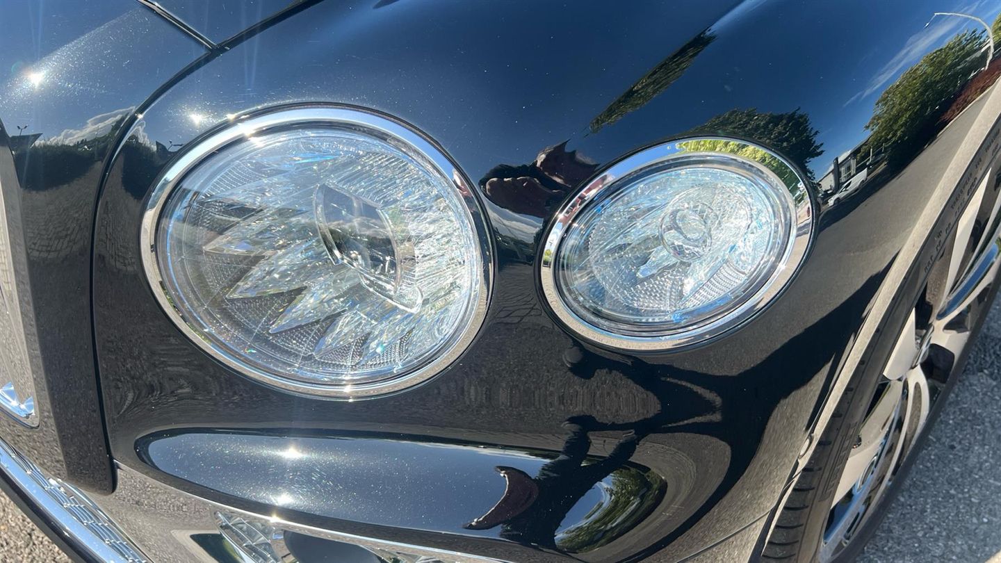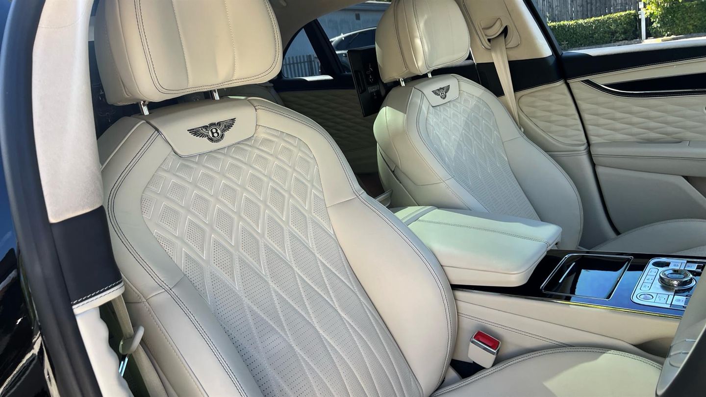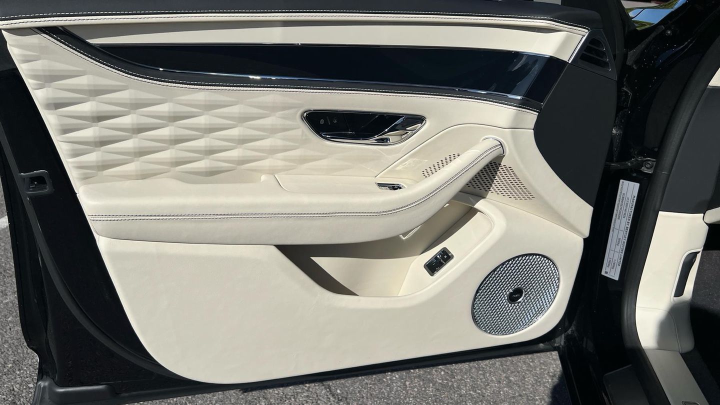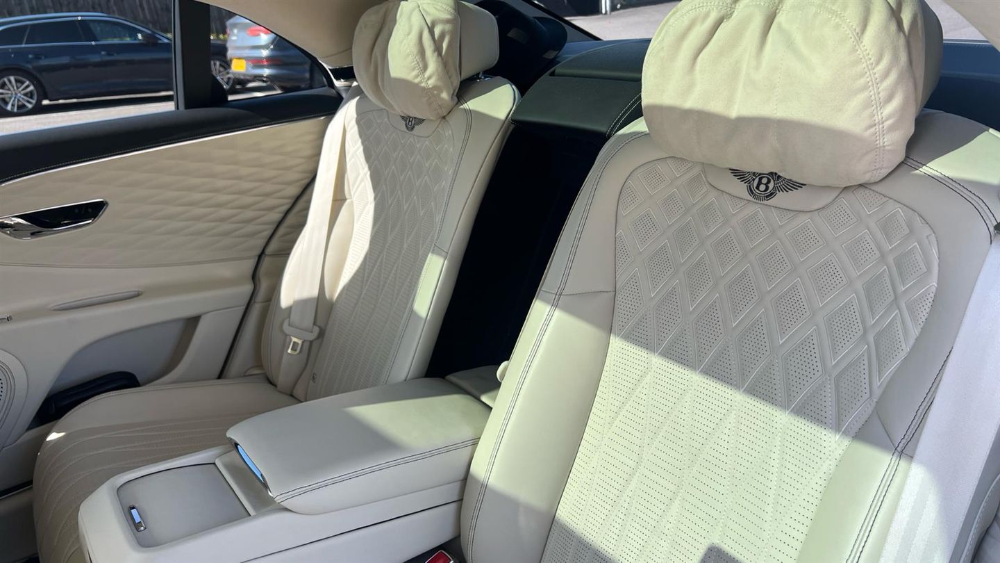 Bentley Azure Flying Spur V6 Hybrid in Black Crystal with a Linen Quited Leather Interion. Azure Specificartion including Touring and City Specification, Bentley Rotating Dash, Mood Lighting, 22 Ten Spoke Alloys, Four Wheel Drive Sysytem, LED Welcome Lamps, Lofted Diamond Hide Seats Heated with Ventilation and Massage, Illuminated Flying B Radiator Mascot - Bright Polished Stainless Steel, Veneered Picnic Tables Match to Upper, Naim for Bentley, Bentley Rear Entertainment, Remote Controlled Garage Door Opener, Dual Finish - Piano Linen over Grand Black, Diamond Knurling, Self Levelling Wheel Badge - by Mulliner..
