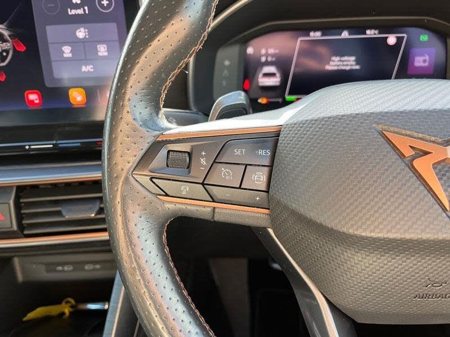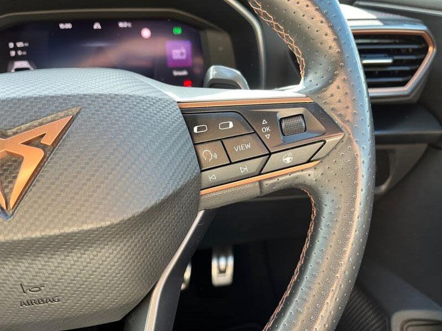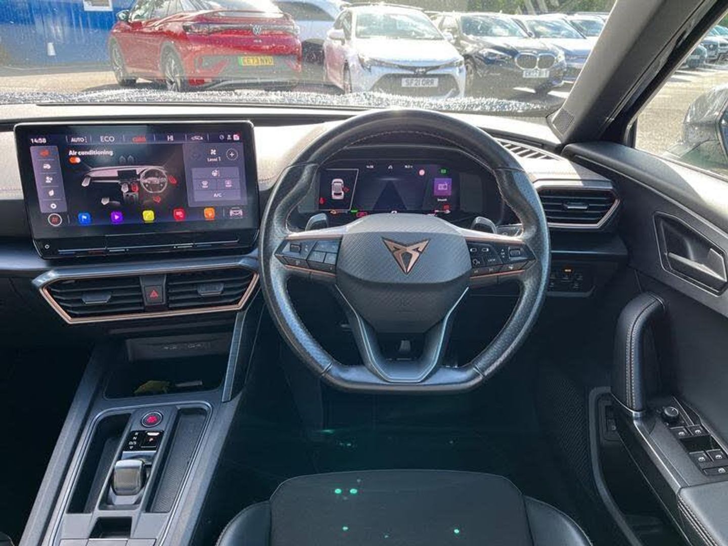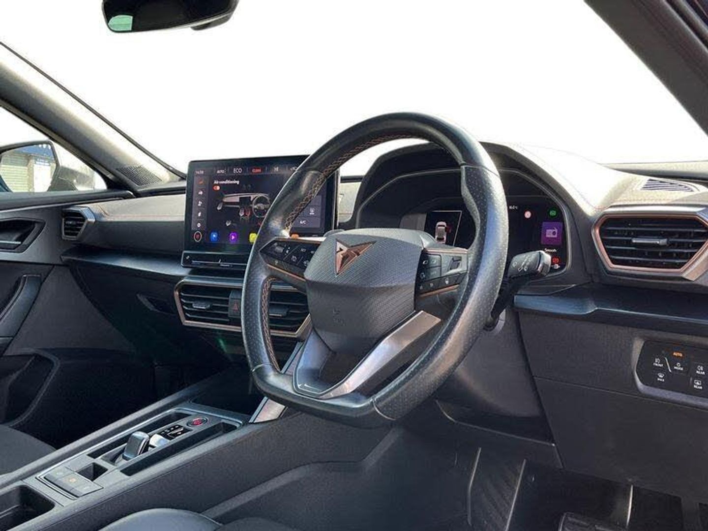 [Exterior]Auto dimming rear view mirror, Body colour door handles, Body coloured bumpers, Dark grey wing mirror, Daytime running light with automatic headlight control and coming home feature, Dynamic headlight range control, Electric front/rear windows, Electrically adjustable, heated and folding door mirrors, Front fog lamps with cornering function, Gloss black roof rails and window surrounds, LED Headlights, LED Taillights with dynamic indicator, Rain sensing wipers, Rear diffuser with single exhaust pipe on each side with simulated exhaust pipes, Rear side wing doors, Rear wash/wipe, Sports bumpers, Third brake light, Tinted rear windows, Welcome lights[Interior]12v power supply in centre console, 12V socket, 12v socket in loadspace, 2 front and 2 rear reading lights, 230V socket, 3 seat bench in 2nd row, 60/40 split rear bench seat with armrest and mechanical seat release, Black headlining, Cupra sports pedals, Dust/pollen filter, Front and rear head restraints, Front centre armrest, Height/reach adjust steering wheel, Illuminated interior front door sills, Illuminated sunvisor with mirror, Isofix, Leather multi function heated steering wheel with gear shift paddles, Luggage tie-down hooks, Manually adjustable height and lumbar support for front seats, PVC/Cloth upholstery with copper stitching + bucket seats, Single front passenger seat, Three zone climate control with control panel in rear, Wraparound lighting[DriverConvenience]Digital cockpit and configurable dashboard, Driver alert system, Dynamic chassis control with driving profile selection (Comfort, Sport, CUPRA, Individual), Forward collision warning with automatic braking, Lane assist, Navigation system with 12'' Touchscreen Display, Park assist (inc front/rear parking sensors), Predictive adaptive cruise control with speed limiter, Rear view camera, RPM, trip computer, outside temp gauge, instrument light brightness, low fuel warning light, lights on reminder, gearshift indicator, Service interval indicator, Speed sensitive power steering, Start/stop system with regenerative braking, Virtual pedal and electric tailgate, Voice control system, Wired Android Auto, Wireless apple carplay, Wireless phone charger[Safety]3 point seatbelts on all rear seats, ABS, Brake control system - ESC and brake booster, Child proof door locks, Driver and front passenger airbags with front passenger airbag de-activation, Electronic parking brake, Front and rear disc brakes, Front side curtain airbags, Hill hold control, Public e-call, Seat belt reminder for front and rear seats, Tyre pressure monitoring system[Security]Anti theft alarm system, Keyless entry and start system (KESSY), Locking wheel bolts