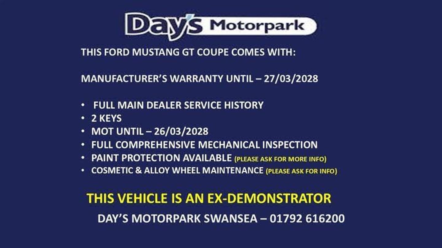 19in Alloy Wheels - Painted, ABS - Anti-lock Braking System, Adaptive Cruise Control with Adjustable Speed Limiter, Airbags, Bang and Olufsen - 12-Speaker Surround Sound Audio System, EBA - Emergency Brake Assist, EPAS - Electric Power Assisted Steering, Electric Windows - Front, Electronic Automatic Temperature Control - EATC, Electronic Stability Control - ESC with Full Speed Engine-Brake Traction Control - TCS, Front Seat Adjuster - 6-Way Power Drivers Seat, Front Seat Adjuster - 6-Way Power Passenger Seat, Fully Independent Front and Rear Suspension, Fully customisable 13.2in Touchscreen with Wireless Smartphone Integration - FordPass Connect and Connected Navigation, GT Bodykit with Black Door Frame Mouldings, GT Front Grill With Vertical Power Bars - GT Exterior Badging and Quad Tailpipes, Heated-Ventilated and Cooled Front Seats, Immersive Cockpit-Themed Interior with 12.4in Customisable Digital Cluster., Keyless Entry and Start System, Lane Keeping Aid with Lane Keeping Assist, Led Rear Lights with Sequential Indicators and Welcome-Farewell Animation, Locks - Remote Central with Double Locking, Power-Folding Door Mirrors Including Blind Spot Information with Mustang Logo Projection Puddle Lamps, Pre-Collision Assist with Autonomous Emergency Braking and Pedestrian-Cyclist Detection, Rain Sensing Wipers, Rear View Camera with Rear Parking Sensors, Selectable Drive Modes, Silver Triple-Led Headlamps with Welcome - Farewell Animation, Sports Seats, Steering Wheel - Leather Flat-Bottomed - Heated, Thatcham Category 1 Alarm, Tyre Mobility Kit, Tyre Pressure Monitoring System, Wireless Charging and USB Charging Port