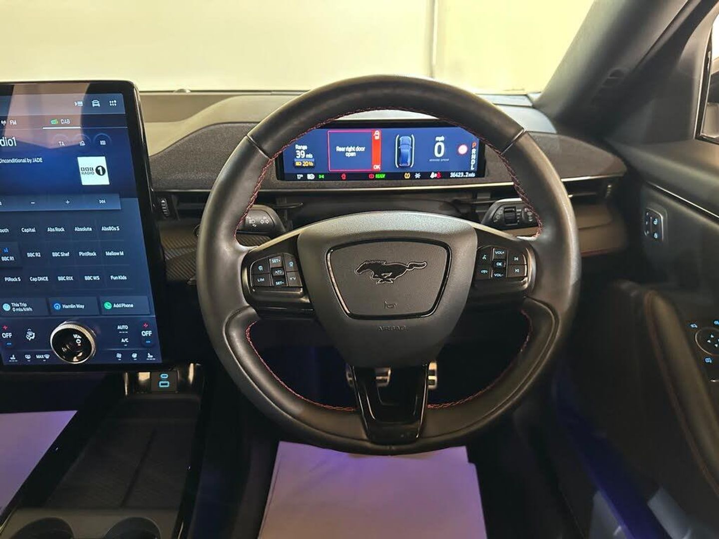 10.2in Full Digital Cluster and 15.5in Central Touch Screen, 19in Alloy Wheels - Black Machined, 8-Way Power Driver and Passenger Seats, ABS - Anti-lock Braking System, Adaptive Cruise Control with Stop and Go and Lane-Centering, Adaptive LED Mustang Signature Headlamps, Air Conditioning - Dual Zone Electronic Automatic Temperature Control, Airbags - Driver and Front Passenger, Applink Remote Control System, BLIS - Blind Spot Information System with Cross Traffic Alert, Black Powerfold Mirrors with Puddle Light Mustang Logo Projection, Blade Front Grille Design, Body Colour Bumpers, Dark Headliner, E-Latch Keyless Entry System including B-Pillar Keypad Access, Electric Windows - Front, FordPass Connect Embedded Modem, Front Trunk, Front and Rear Parking Sensors, Heated Driver and Passenger Seats, Heated Steering Wheel, High Power Charging Cable, Home Charging Cable, LED Mustang Signature Taillights, Lane Keeping Aid with Lane Departure Warning, One Pedal Drive, Power Steering, Pre-Collision Assist with Forward Collision Warning-Dynamic Brake Support-Autonomous Emergency Braking, Privacy Glass, Quickclear Heated Windscreen, Rear View Camera, Red Brake Calipers, SYNC with Connected Navigation and Natural Voice Search, Selectable Drive Modes - Active-Whisper-Untamed, Side Cladding and Wheel Arches Piano Black, Thatcham Category 1 Alarm, Wireless Device Charging Pad, Perforated Sensico - Black with Red Stitching