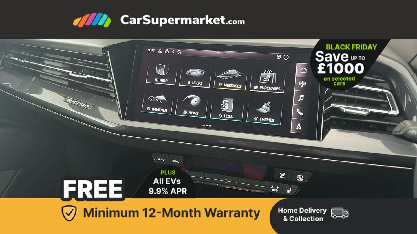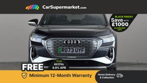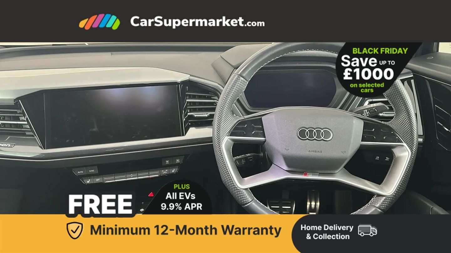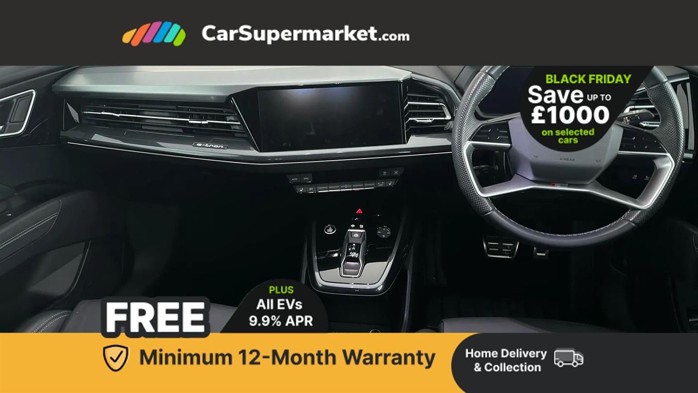 Audi connect safety and service (e-call),Audi drive select,Audi Virtual Cockpit - 10.25" display,Bluetooth interface,Camera based traffic sign recognition,Lane departure warning system,MMI Navigation Plus with high resolution 11.6 inch touchscreen colour display,Progressive steering,Swerve assist and turn assist,11KW onboard charger,135kW DC charging capability,AC and DC charging access point positioned on the rear right,Compact e-tron charging system,Household plug type G (GB),Industry plug CEE 32 A/230 V/6 h/long + straight,2 USB-C ports with charge and data functions,DAB Digital radio,Aluminium roof rails,Body coloured door mirrors,Contrast bumpers in Manhattan grey,Electrically adjustable/heated/folding/auto dimming door mirrors with integrated LED indications + kerb view function for passenger side,Frameless auto dimming interior rear view mirror,LED daytime running lights,Projection light in the exterior mirrors, e-tron logo projected from the underside of the exterior mirror onto the ground,Rear side wing doors,Rear wiper,S line exterior styling,Single frame grille with a structured, closed surface within an octagonal shape,3 seat bench in 2nd row,3 zone automatic air conditioning,4 way electric lumbar support for driver and front passenger,Accent surfaces in gloss black - centre console control panel, switch panel and trim on front doors in gloss black,Black cloth headlining,Driver/passenger manual seat height adjustment,Front door sill trims with aluminium inlay, illuminated with S logo,Heated front seats,Single front passenger seat,Gloss styling pack - Q4 E-tron,Non smoking pack - Q4 E-tron,3x3 point rear seatbelts,Driver and front passenger airbag with passenger airbag deactivation,Electric child locks,Pre-sense front with pedestrian and cyclist detection,Tyre pressure loss indicator,Anti theft alarm,Anti-theft wheel bolts,Keyless Go,Aluminium look interior elements,Adaptive cruise control with speed limiter,Audi smartphone interface,Driver alert system,Power operated tailgate with sensor controlled release,Rear view camera,Mode 3 type 2 AC charging cable 22kW,Sport suspension,Heat insulating glass windscreen,Heated rear window,LED 3rd brake light,Privacy glass - dark-tinted rear window, rear door windows and rear side windows,S Line badges on the front wings,40/20/40 split folding rear seat bench,Comfort auxiliary air conditioning,Door armrests in leatherette,Front sport seats with integrated head reastrains,Rear centre armrest with cupholders,Rear head restraints,Steering wheel with trim in chrome look, S emblem, steering wheel grips in perforated leather and contrast stitching,Ambient lighting plus pack - Q4 E-tron,Technology pack - Q4 E-tron,Acoustic vehicle alerting system,Convenience key with safelock,First aid kit with warning triangle and vests,Front side airbags with head airbag system and front interaction airbag,i - Size child seat mounting on the front passenger side and i - Size and top tether on the outer rear seats,Seat belt monitoring,Vehicle tool kit,Pedals in stainless steel,Technology Pack