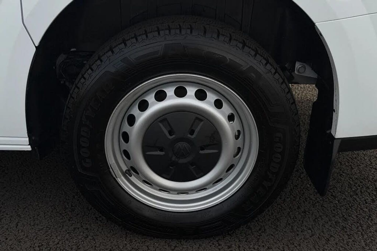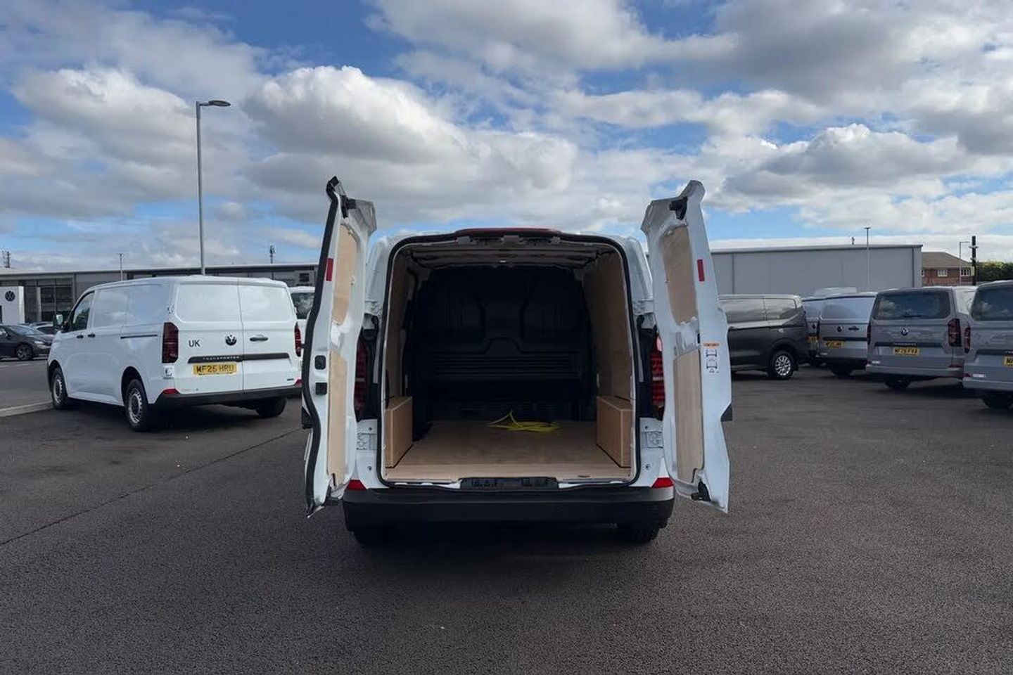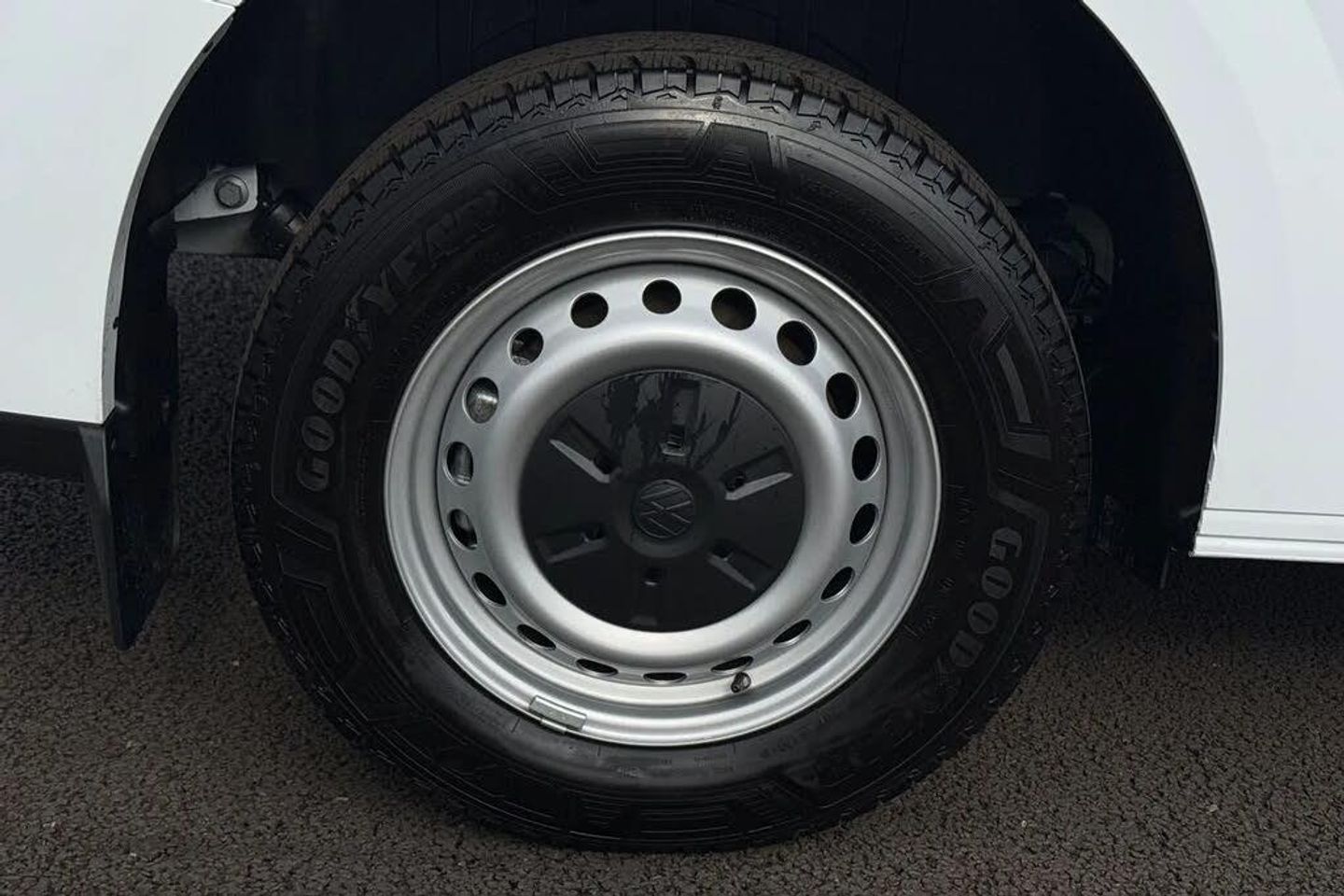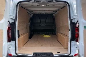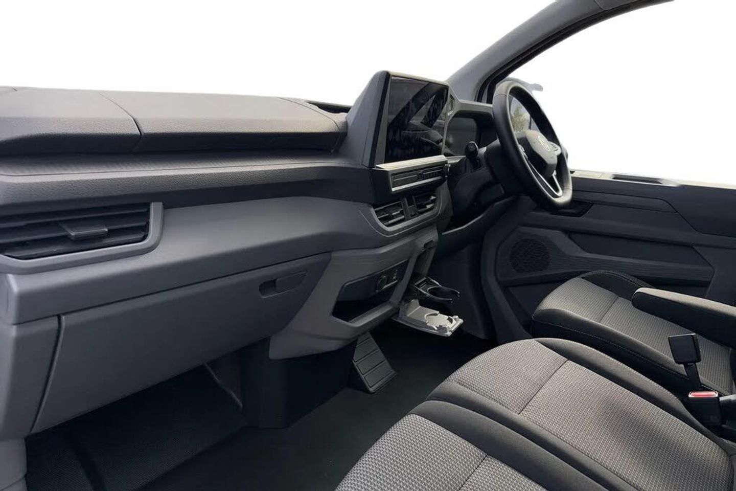Heat reflecting side window glass,Body coloured door handles,Mud flaps front and rear,Rear Transporter nameplate in black grained decorative trim,Vehicle opening configuration 1x 1st row of seats,2x all doors,Electromechanical brake booster,Electronic stability control,ABS,ASR with deactivation button,hill start assist and brake assist system,Cruise control,Electromechanical speed sensitive power steering,height and longitudinally adjustable steering column,Lane assist,Wrong way driver warning,Driver and front passenger airbag with front passenger airbag deactivation,Front and curtain airbags for driver and front passenger,Seat belt pretensioner for driver seat,Single tone horn,Apple CarPlay and Android Auto,4 speakers - 2x dashboard,2x cab doors,12" digital drivers display,13" touchscreen infotainment display with wireless app connect and DAB radio,5G Modem,Dynamic road sign display,eCall emergency system,Preparation of VW connect and connect plus,Electric auxiliary heater,Heat pump,2x 15-W USB data/charging ports in dashboard and 1x USB-C,1x USB-A center bottom,Black plastic scuff plate for sliding door in cargo without illumination,Narrow centre console with cup holder and compartment for mobile phone,Overhead storage compartment,Roof grab handle on front passenger side,Rubber floor covering in cab,Striped fabric upholstery,Cabin interior lighting,2x LED lights in load compartment,Lashing rings for reinforced floor covering,Without passenger seats in load compartment,4 way height and tilt adjustable head restraints,Anti theft alarm system with interior monitoring in cab,backup horn and towing protection,Electronic immobiliser,Preparation for alcohol ignition interlock,5+ Promise,Mode 3 charging cable,type 2,3-phase,32A,cable length 5m,Goodyear all season tyres,Tyre mobility kit in lieu of spare wheel with 12 volt compressor and tyre sealant