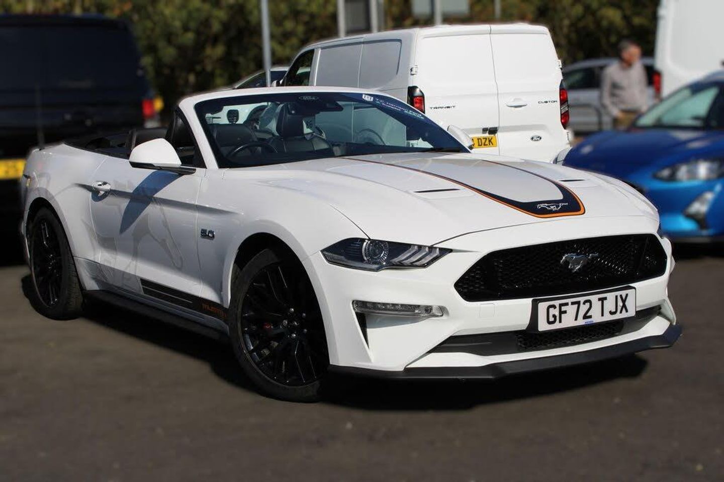 12" digital LCD instrument cluster, Adaptive cruise control with adjustable speed limiter, Apple car play/Android Auto, Bluetooth connectivity with voice control, Electric power steering, Emergency services call system, Ford pass connect embedded modem, Ford SYNC 3 with 8" colour touch screen, Lane keeping aid with lane keeping assist, Oil pressure gauge, Rear view camera with rear parking sensors, Selectable driving modes - normal, mymode, snow/wet, sport+, track and drag mode, Service interval indicator, SYNC Emergency Assistance, Track apps with accelerometer technology, Trip computer, DAB Digital radio, USB connection, 3rd brake light, 5.0 Exterior badge on front wings, Active exhaust system with quad tailpipes, Auto dimming rear view mirror, Auto high beam, Automatic headlights, Automatic rain sensing wipers, Body colour bumpers, Body colour door mirrors, Bonnet air intake, Electric front windows, GT exterior badge on bootlid, GT front grille with vertical power bars, LED headlamps with daytime running lights and LED fog lamps, LED rear lights, Magnetic blade decklid rear spoiler, Power folding door mirrors with Mustang logo projection puddle lamps, Rear boot, 6 way power adjustable front seats and driver seat power lumbar adjust, Ambient lighting, Cup holders, Dual electronic automatic temperature control, Front headrests, Heated steering wheel, Illuminated entry system, Individually folding 2 rear seats in 2nd row, Isofix system on outer rear seats, Leather gearknob, Leather multifunction steering wheel, Leather upholstery, Reach and rake adjustable leather steering wheel with integrated controls, Rear head restraints, Single front passenger seat, Ford key free system with power starter button and keyless entry, Immobiliser, MyKey system, Thatcham Cat.1 alarm, Custom Pack 2, Leather - Ebony
