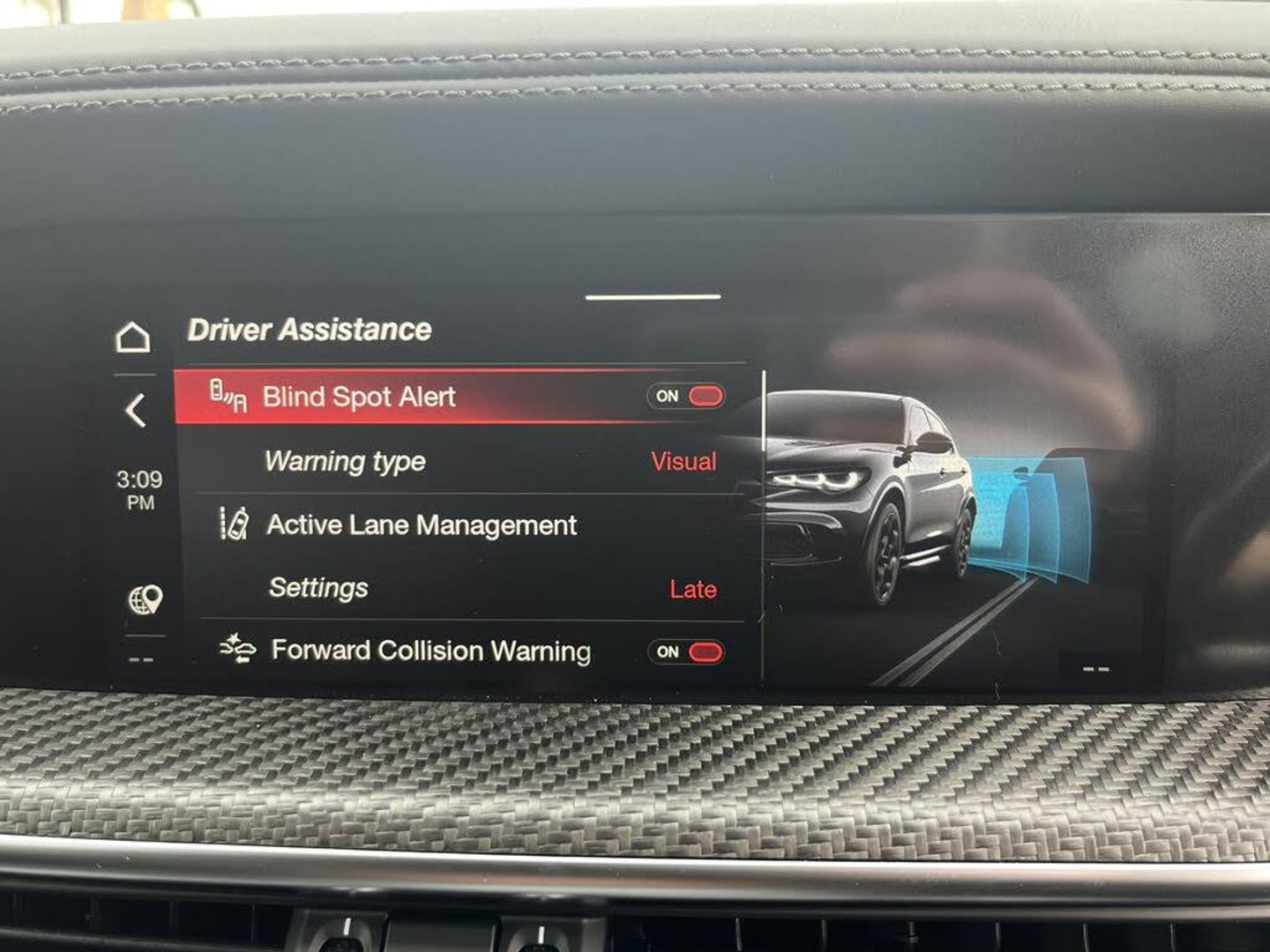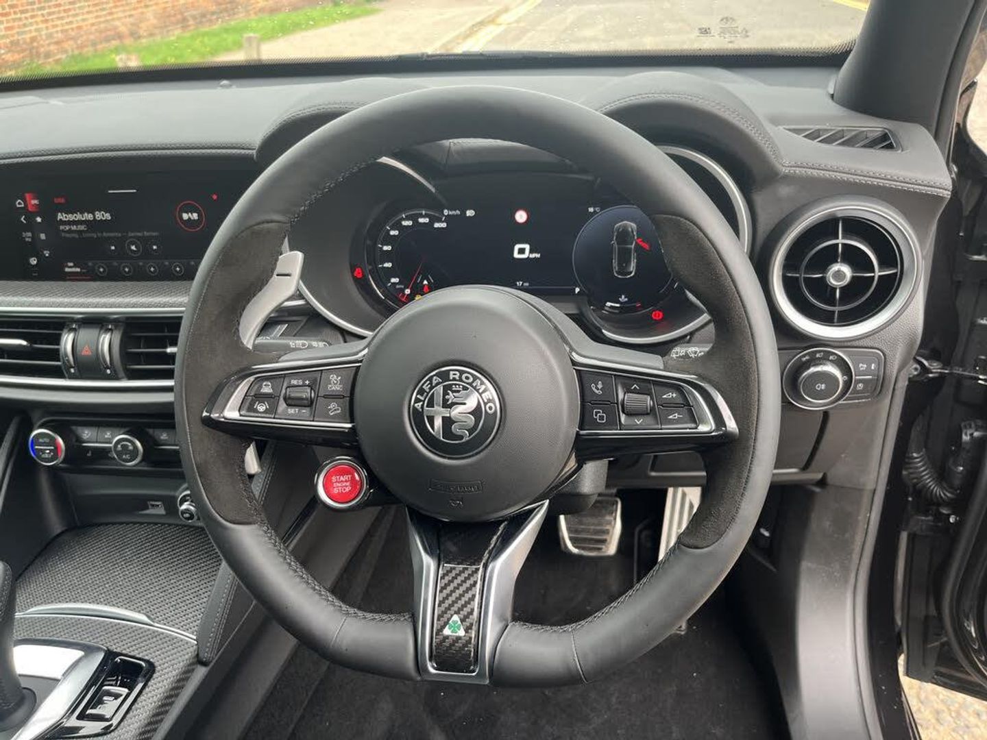 12.3" Full TFT instrument cluster, Active blind spot assist, Active cruise control, Adaptation for cold countries, Alfa Connect 3D Nav 8.8" Infotainment system (radio, 3D Nav, MP3, aux-in, bluetooth), Alfa connect box, Alfa connected services, Apple car play/Android Auto, Cyber security level 3 protection, DNA unlatched, Driver attention alert system, Forward collision warning, Front and rear parking sensors, Hands free tailgate, Lane departure warning system, Lane keep assist, Noise reduction kit, PAS, Power tailgate, Rear view camera with dynamic grid lines, Remote tailgate release with key fob button, Speedometer scale default, Steering wheel buttons, Stop/start system, TMC Pro, Traffic sign recognition (TSR), Trip computer, West European Map, Wireless charging pad, Alfa synaptic dynamic control suspension, Mechanical limited slip differential, 2 USB Power socket for rear seat, DAB digital audio broadcast, Harman Kardon sound system, USB and Aux in armrest, 4 exhaust tailpipes, Auto high beam assist, Automatic headlights with dusk sensor, Automatic rain sensing wipers, Black door mirrors, Dark finish V grille, Dark miron scudetto (shield), Dark tinted rear windows, Darkened rear lights, Dome bar, Electrically adjustable and folding door mirrors, Electrochromatic autodimming outside rearview mirrors, Electrochromatic rear view mirror, Exterior door handle courtesy lights, Exterior mirror finishing, Front and rear electric windows, Fuel door solenoid locking with doors locking, Full LED matrix trilobe headlamps, Heated washer jets, LED daytime running lights, LED rear lights, LED third brake light, Logistico option body, Quadrifoglio badge, Rear side wing doors, Rear wash/wipe, Transportation protection cover, Window surrounds gloss black, 12V power outlet, 230V/50hz auxiliary power outlet in trunk, 3 seat bench in 2nd row, Additional soundproofing, Air quality control system, Aluminium shift paddles on steering column, Aluminium sports pedals, Dark headlining, Driver and passenger sunvisors with illuminated vanity mirrors, Drivers side dashboard storage, Dual zone auto temp control with humidity sensor, English handbook, Front head restraints, Front/rear floor mats, Functional LED lighting, Heated front seats, Interior ambient lighting, IP Driver storage, Leather wrapped dashboard and upper door, New 3D carbon interior inserts, Quadrifoglio Leather/Alcantara flat bottomed sports steering wheel with carbon fibre insert, Rear air vents, Rear headrests, Roller cover for cargo area, Single front passenger seat, Third rear headrest, 3 rear 3 point seatbelts, ABS, ASR, Autonomous emergency braking, Driver and passenger airbags, Electronic parking brake, Electronic stability control, Front seat mounted side airbags, Hill descent control, Integrated monster brake system, Manual child lock in rear doors, Passenger airbag deactivation system, Pedestrian and Cyclist Detection, Rear seat ISOFIX, SOS - Emergency Call Button, Traction control, Tyre pressure monitoring system, Alarm system with bonnet and intrusion protection, Driver and front passenger doors with passive entry and keyless go, Immobiliser, Monotone wheel centre caps, Tyre inflation kit