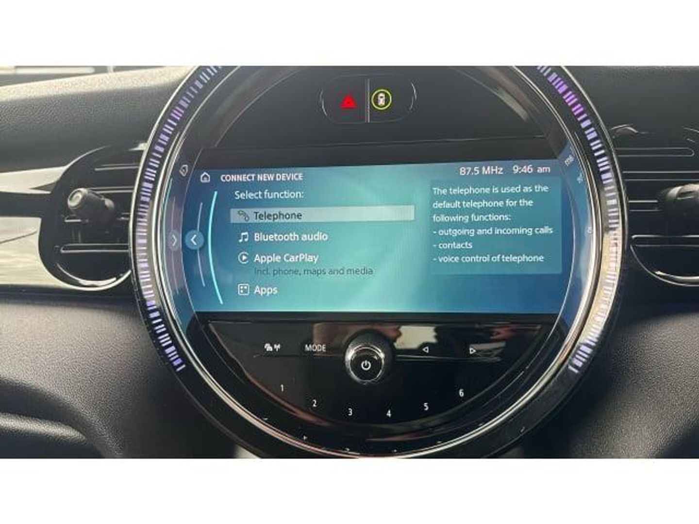Black velour floor mats, Electric front+rear windows, Heated rear window, Heated windscreen washer jets, Rear window wiper, Rain sensor window wipers, DSC - Dynamic Stability Control, Electronic parking brake, Anti-lock Braking System (ABS), Front and rear disc brakes, Compatible mobile phone bluetooth with audio streaming, Flexible car sharing preparation, Rear park distance control, Rear view camera, MINI Driving Modes - centre toggle switch to control driving setting (sport, mid and green), Electro-mechanical speed dependant steering assistance, Brake energy recuperation toggle switch with two settings, On board computer, Service interval indicator, Digital cockpit, Digital instrument cluster, Digital dashboard display, Auto dimming and folding door mirrors, Piano black interior trim, Surface chequered black interior trim, Electric front motor installed drives front wheels, FM tuner and DAB digital radio