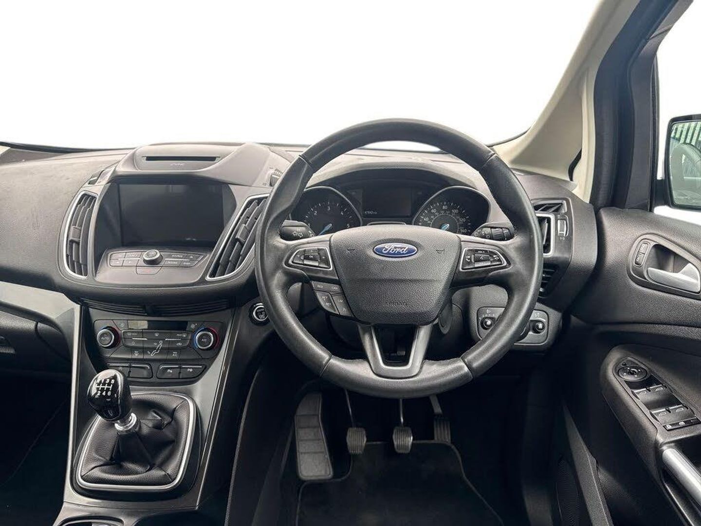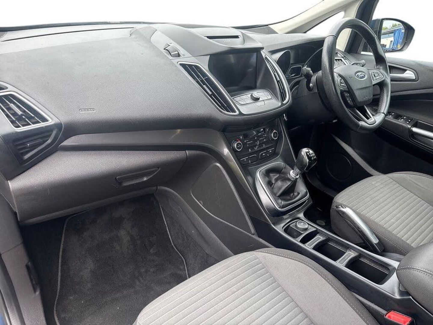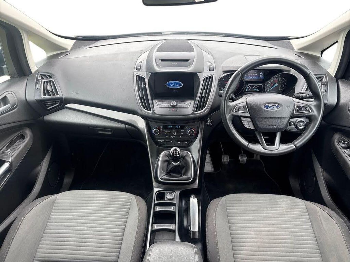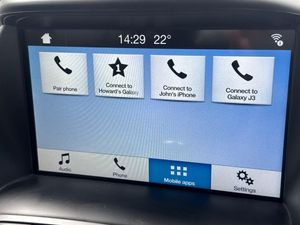 'Ford Power' starter button, Driver's information system, Easy fuel capless refuelling system, Electric power steering, Trip computer, Diesel particulate filter, Ford SYNC 3 DAB audio system includes 8" colour touch screen with bluetooth and advanced voice control of audio and emergency assistance, Steering wheel mounted audio controls, USB connection, Auto dimming rear view mirror, Automatic headlights, Body colour bumpers with black rubbing strip, Body colour door handles, Body colour door mirrors with integral indicators, Chrome finish on upper door line, Dual sliding side load doors, Electric front windows, Electric rear windows, Front and rear power windows with global closing, Front fog lights with chrome surrounds, Halogen headlamps with LED Day Running Lights, Heated door mirrors, Intermittent rear wash/wipe, Power fold mirrors, Quickclear heated windscreen, Rain sensing windscreen wipers, 12V accessory sockets - front and rear, 3 spoke steering wheel, Ambient interior lighting, Auxiliary power socket, Centre armrest with storage box, Child observation mirror, Cloth upholstery, Courtesy light in luggage compartment, Driver's seat manual height adjust, Driver/passenger lumbar adjustment, Dual zone electronic automatic temperature control, Footwell illumination, Front/rear courtesy lights, Front/rear reading lights, Fully adjustable front headrests, ISOFIX child safety seat attachments, Leather gearknob, Passenger seat height adjuster, Premium centre console with armrest, Rake/reach adjustable steering wheel, Satin chrome interior door handles, Sports style front seats, Three height adjustable rear head restraints, Tonneau cover, Versatile split folding rear seat - 40/20/40, 7 three point seatbelts, ABS + traction control, Driver and passenger airbags, Driver and passenger side airbags, Electronic brake force distribution, Emergency brake assist, ESP, Fasten seatbelt reminder, Front and rear curtain airbags, Height adjustable front seatbelts, Hill start assist, Intelligent Protection System (IPS), Power operated rear door child locks, Tyre pressure monitoring system, Anti-theft immobiliser, Keyless entry, Locking wheel nuts, MyKey system, Remote central double locking, Thatcham 1 volume sensing alarm, Satin black trim, Mini steel spare wheel