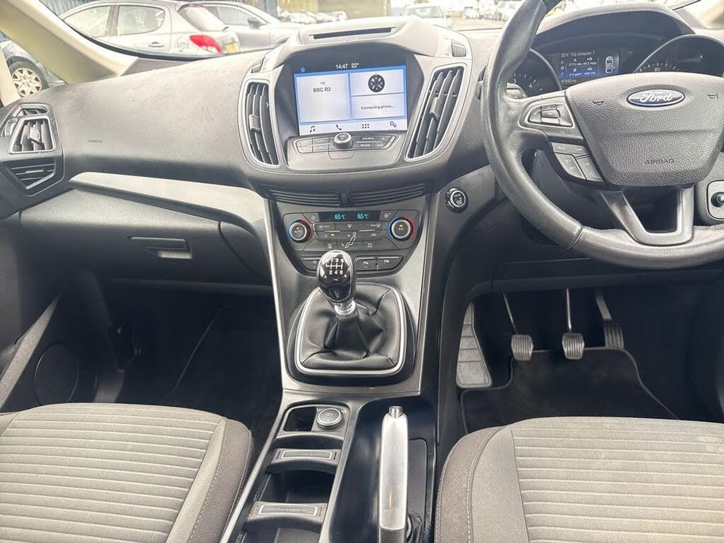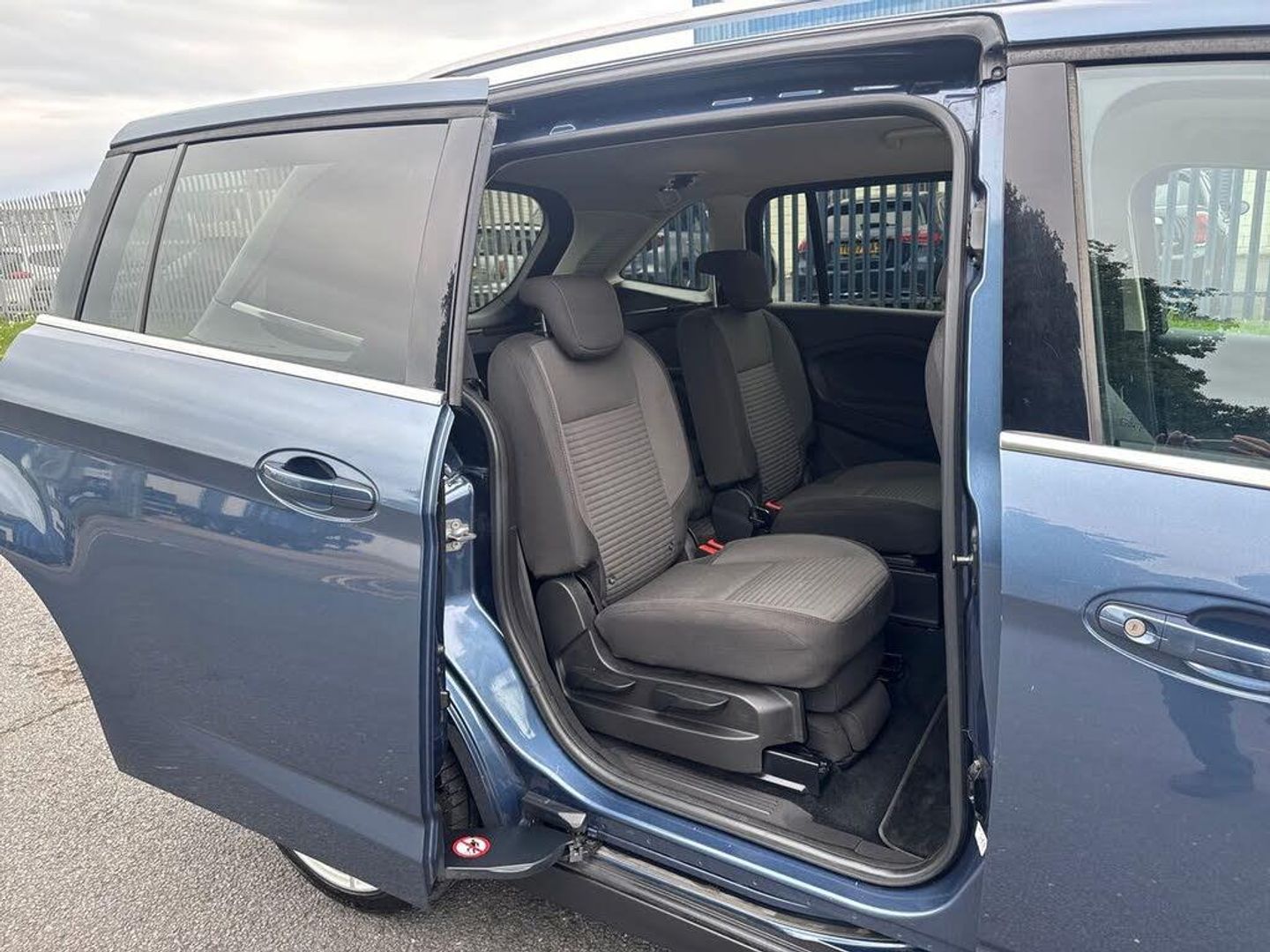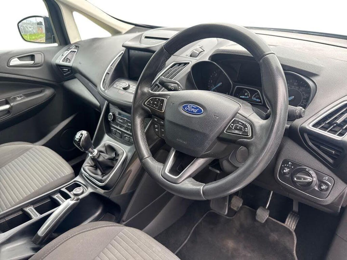 'Ford Power' starter button, Driver's information system, Easy fuel capless refuelling system, Electric power steering, Trip computer, Diesel particulate filter, Ford SYNC 3 DAB audio system includes 8" colour touch screen with bluetooth and advanced voice control of audio and emergency assistance, Steering wheel mounted audio controls, USB connection, Auto dimming rear view mirror, Automatic headlights, Body colour bumpers with black rubbing strip, Body colour door handles, Body colour door mirrors with integral indicators, Chrome finish on upper door line, Dual sliding side load doors, Electric front windows, Electric rear windows, Front and rear power windows with global closing, Front fog lights with chrome surrounds, Halogen headlamps with LED Day Running Lights, Heated door mirrors, Intermittent rear wash/wipe, Power fold mirrors, Quickclear heated windscreen, Rain sensing windscreen wipers, 12V accessory sockets - front and rear, 3 spoke steering wheel, Ambient interior lighting, Auxiliary power socket, Centre armrest with storage box, Child observation mirror, Cloth upholstery, Courtesy light in luggage compartment, Driver's seat manual height adjust, Driver/passenger lumbar adjustment, Dual zone electronic automatic temperature control, Footwell illumination, Front/rear courtesy lights, Front/rear reading lights, Fully adjustable front headrests, ISOFIX child safety seat attachments, Leather gearknob, Passenger seat height adjuster, Premium centre console with armrest, Rake/reach adjustable steering wheel, Satin chrome interior door handles, Sports style front seats, Three height adjustable rear head restraints, Tonneau cover, Versatile split folding rear seat - 40/20/40, 7 three point seatbelts, ABS + traction control, Driver and passenger airbags, Driver and passenger side airbags, Electronic brake force distribution, Emergency brake assist, ESP, Fasten seatbelt reminder, Front and rear curtain airbags, Height adjustable front seatbelts, Hill start assist, Intelligent Protection System (IPS), Power operated rear door child locks, Tyre pressure monitoring system, Anti-theft immobiliser, Keyless entry, Locking wheel nuts, MyKey system, Remote central double locking, Thatcham 1 volume sensing alarm, Satin black trim, Mini steel spare wheel