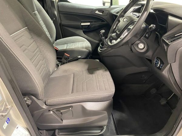 Bluetooth + USB, Cruise control + speed limiter, Easy fuel capless refuelling system, PAS, Trip computer, Diesel particulate filter, Steering wheel mounted audio controls, Automatic lights and wipers, Body colour door handles, Body colour side mouldings, Body coloured bumpers, Chrome headlight surround, Cornering light, Daytime running lights, Dual sliding side load doors, Electric folding and heated door mirrors, Front fog lights, Heated washer jets, Heated windscreen, Power front/rear windows with global close, Privacy glass, 2nd row centre armrest, 4 way manually adjustable passenger seat with height, reach, tilt, backrest and headrest, Cloth upholstery, Driver's armrest, Front carpet mats, Front head restraints, Leather gearknob, Leather steering wheel, Map pocket on front seat backs, Overhead storage shelfs, Pollen filter, Reach + rake adjustable steering column, Rear head restraints, Rear overhead stowage, Row 2 folding/removable seats, Seat pack 9 - Tourneo connect//Grand Tourneo Connect, 3 point seatbelts on all seats, Active city stop, Driver and passenger airbags, Drivers seatbelt reminder, ESC with ABS, Front and rear curtain airbags, Front side airbags, Passenger seatbelt warning indicator, 2nd remote key, Immobiliser, Remote central double locking