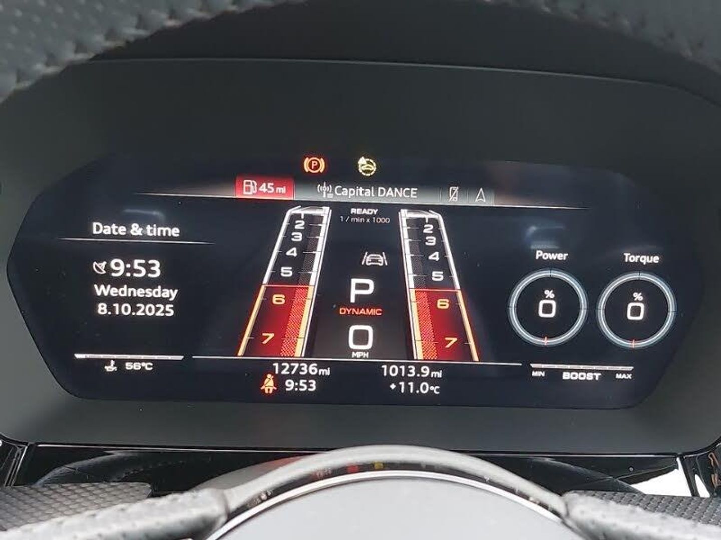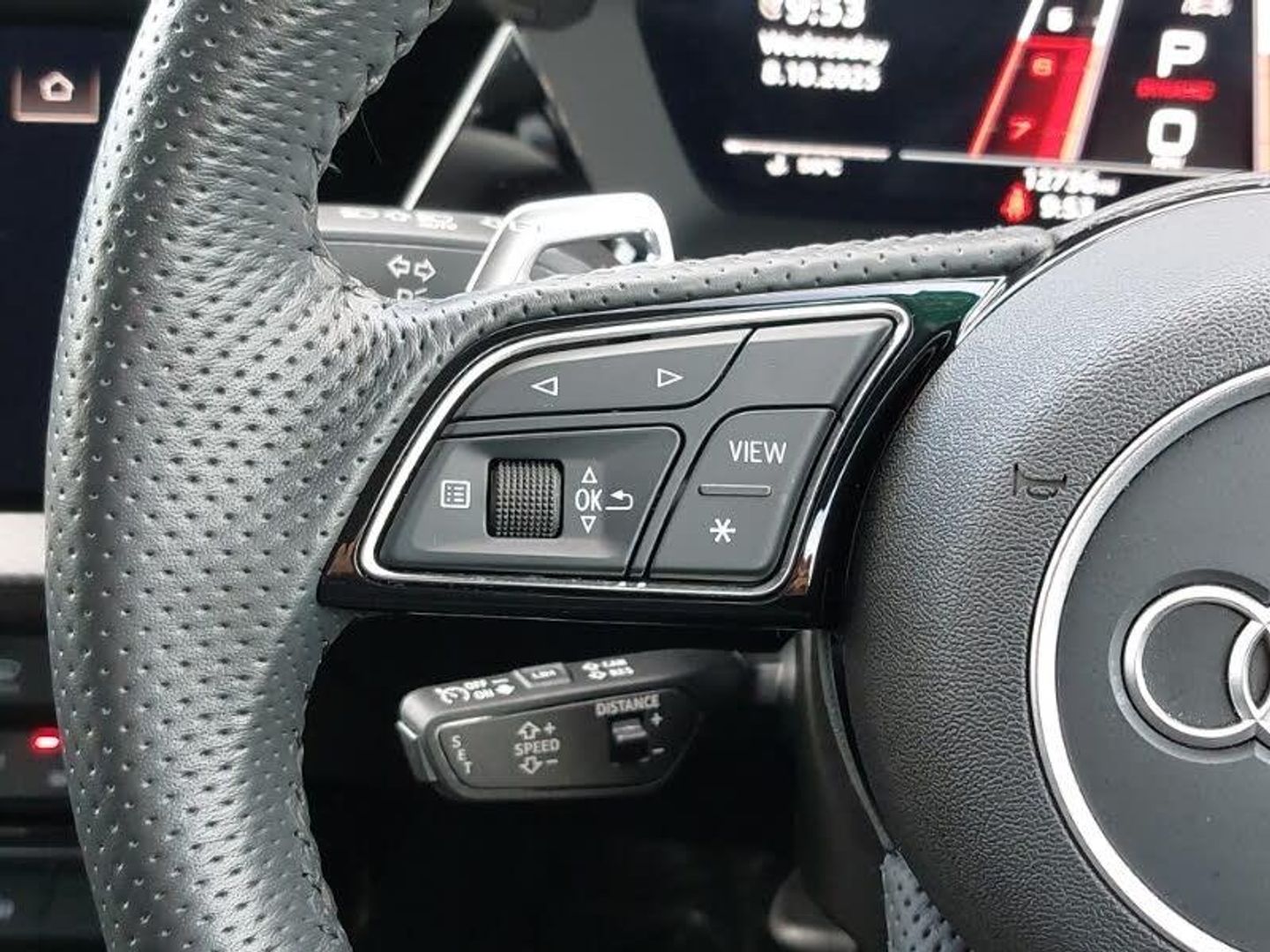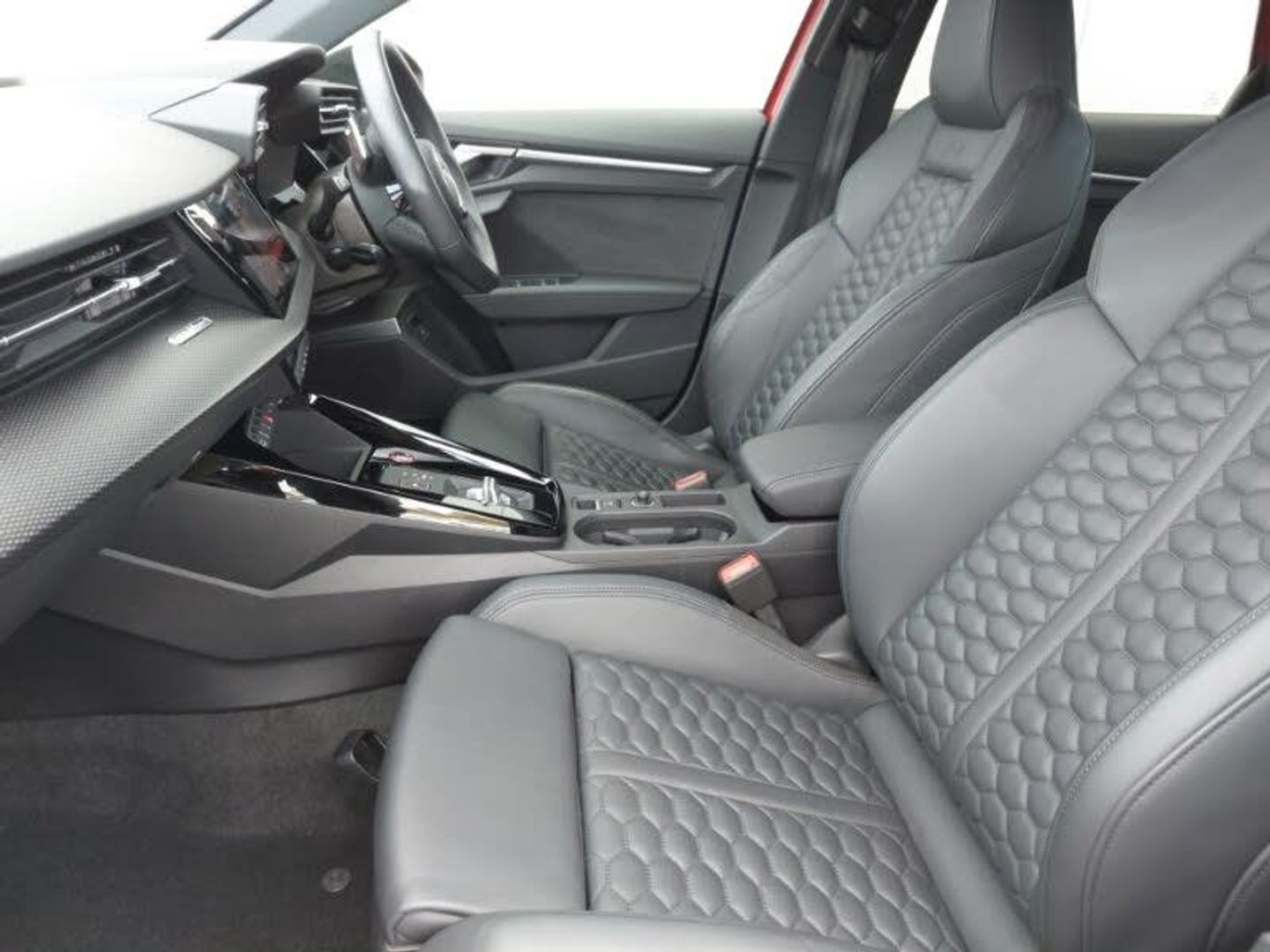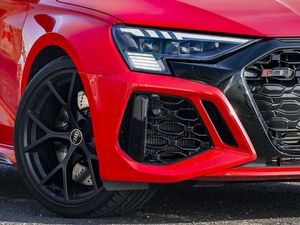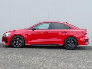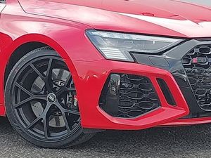 Audi smartphone interface, Audi virtual cockpit with RS specific display 12.3" full colour digital instrument cluster, Automatic start/stop system with recuperation, Lane departure warning system, Parking assist with parking system plus, Audi sound system impressive sound with 10 loudspeakers including centre speaker and subwoofer, 6-channel amplifier with a total output of 180 watts, DAB Digital radio, Special metallic paint, Audi beam uses LEDs to project the Audi sport logo onto the ground as you exit your RS 3, Audi matrix LED headlights, LED rear lights, dynamic front and rear indicators and headlight cleaning system, Auto dimming rear view mirror, Carbon exterior door mirror, Carbon fibre engine cover, Door mirrors - electrically adjustable, heated, folding and auto dimming on both sides, LED daytime running lights, Privacy glass - dark tinted rear and rear side windows from B-pillar backwards, RS exterior features in gloss black, RS sports exhaust system, Side skirt in carbon inlay, 40/20/40 split folding rear seat bench, Heated front seats, Honeycomb stitching and RS embossing, RS emblems, Stainless steel pedals and front footrest in black, 19" 5 Y spoke matt black alloy wheels