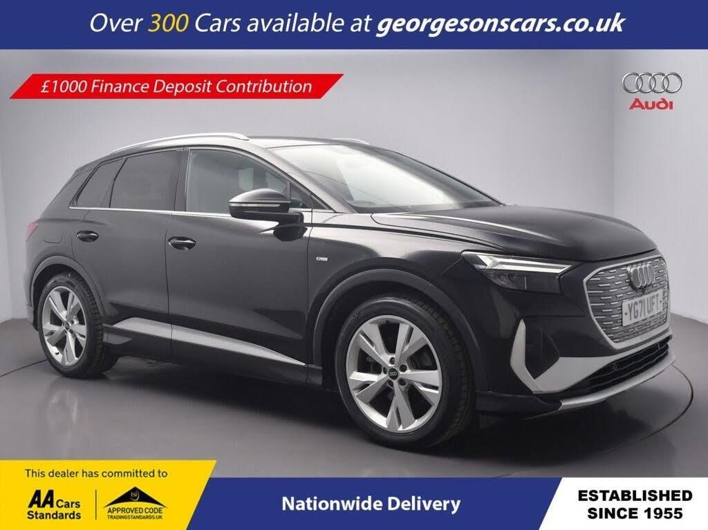 The Audi Q4 e-tron 35 S line combines an efficient electric motor with 201hp, delivering 0-62mph in 8.5 seconds and up to 329 miles of WLTP range in this front-wheel-drive setup with a smooth single-speed automatic transmission. The S line trim enhances the sporty appeal with 19-inch alloy wheels, aggressive styling, and a dynamic chassis for refined EV SUV performance. With one owner and two services, this Q4 e-tron is in excellent condition. Navigate effortlessly with integrated satellite navigation, Apple CarPlay, Bluetooth, and DAB radio, ensuring seamless connectivity on every journey. Parking is a breeze thanks to the parking sensors, providing confidence in tight spaces. Stay comfortable with front and rear climate control and heated seats, offering personalized cooling and warmth year-round. Adaptive cruise control with speed limiter and lane assist enhance safety and relaxation on highways. The push-button start adds daily convenience, while the spacious five-door SUV design includes a 520-litre boot for practicality *Minimum Advance £10,000 Georgesons Cars, one of the leading used car dealerships near me, has been serving Liverpool and the wider Merseyside area since 1955. As a third-generation family-run business, we offer a wide variety of cars for sale, including over 300 quality used cars in Liverpool. Whether you're searching for cars for sale in Liverpool or reliable auto used cars, our inventory is price-checked daily, ensuring competitive pricing. Rated 5-stars on TrustPilot, Georgesons Cars proudly upholds the AA dealer promise and Chartered Trading Standards approval. Contact us today to explore our full range of cars for sale and let our team help you find your next car!