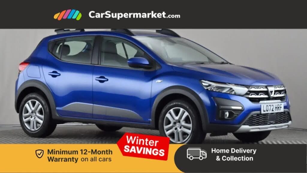 3.5" TFT instrument panel with on-board computer,Cruise control with speed limiter,eCall emergency call system,Eco mode,Electric power assisted steering,Rear parking sensors,Rev counter,Reversing camera,Stop/start system,8" Media display - DAB radio, smartphone replication, bluetooth, 4 speakers, Apple CarPlay and Android Auto,USB connection for data transfer and charging,USB socket,3 speed windscreen wipers,Auto lighting,Automatic wipers,Body colour door handles,Body colour door mirrors,Body coloured bumpers,Chrome longitudinal roof bars,Chrome radiator grille,Electrically adjustable and heated door mirrors,Front fog lights,Heated rear window,High level third brake light,LED automatic daytime running lights,LED Y-shape Dacia signature lighting,Modular roof bars,One touch electric front windows,Rear electric windows,Rear side wing doors,Rear wash/wipe,Stepway inscription on radiator grille and roof bars,Tinted windows,1/3 to 2/3 split folding rear seats,12 volt front socket,12 volt rear socket,3 height adjustable rear headrests,3 seat rear bench,Driver + passenger vanity mirrors,Fabric upholstery,Fixed smartphone holder on dashboard,Front armrest,Gear shift indicator,Height adjustable driver seat,Height adjustable front headrests,Height/depth adjustable steering wheel,Isofix points for child seats in both outer rear seats,Manual air conditioning,Satin chrome interior door handles,Satin Chrome/Copper orange air vents,Single front passenger seat,Soft feel steering wheel,Steering wheel controls,3x3 point rear seatbelts,ABS and Emergency brake assist,Automatic emergency braking system,Child locks on rear doors,Door open warning,Driver airbag,ESC (Electronic Stability Control),ESP + Hill Start Assist,Front curtain airbags,Front seatbelt pretensioners,Front side airbags,Height adjustable front seatbelts,Passenger airbag,Seatbelt reminder for driver and front passenger,Tyre pressure monitor,Automatic central locking,Immobiliser,Keyless entry,Remote central locking,Decopart on instrument panel and door with textile,16" Flex wheels with full wheel cap,Cloth - Titanium Black,Iron Blue