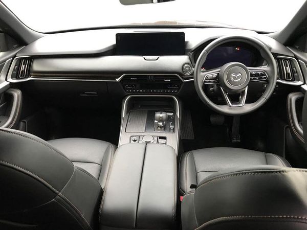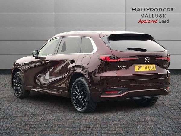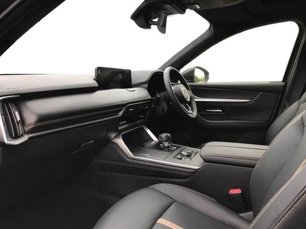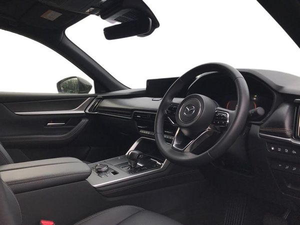 Emergency lane keeping with blind spot assist, Low washer fluid warning light, 12.3" Colour entertainment centre display with mazda connect infotainment, 12.3" TFT Colour display, Adjustable speed limiter, Blind spot assist, Blind spot monitoring with rear cross traffic alert, Distance alert system, Driver attention alert system, Driver Monitoring with personal identification, E-call with GPS, Emergency stop signalling system, Exit warning function, Front and rear parking sensors, Ingress / Egress support and automatic driver position guide, Integrated bluetooth, Intelligent speed assist, Kinematic posture control, Lane keep assist system (LAS) with Lane departure warning system (LDWS), Mazda Driver Personalisation System, Mazda Navigation System with european mapping, Multimedia Commander, PAS, Power lift gate with handsfree function, Power start/stop button, Speed alert, Traffic sign recognition enhanced with mandated excessive speed warning, Trip computer, Windscreen projected colour active driving display, Wireless apple car play/android Auto, Type 2 Mode 2 cable for AC charging via UK 3-pin plug, 7.2 kw On board Charger, Internal Combustion Engine Sound Emulator, Mi-Drive (Normal, Sport, Off-road, Towing and EV mode), Type 2 Mode 3 cable for AC charging via home or public charge points, AM/FM and DAB radio, Bose surround sound system with 12 Speaker, Bose center point, Bass match and audio pilot technology, Steering wheel mounted audio/bluetooth controls, USB-C inputs (x2 front and x2 rear), Auto dimming driver's door mirror, Automatic headlight levelling, B-pillar and C-pillar garnishes in piano black finish, Body colour roof spoiler, Body coloured bumpers, Body coloured wheel arch and side mouldings, Coming/leaving home lighting function, Dark plated headlight lense, Dark plating finish signature wing in front grille, Dark plating front side garnish, Differentiated front bumper design to accentuate the intake, Dusk sensing headlights, Electric front/rear windows with one touch auto up/down, Electric panoramic sunroof, Electrically adjustable, heated auto power folding door mirrors with memory, Frameless auto dimming interior rear view mirror, Front kodo turn signal, Front wiper de-icer, Gloss black door mirrors, Headlight washers, High beam control, LED 3rd brake light, LED rear signature combination lamps, Piano black honeycomb style front grille, Rain sensing front wipers with adjustable sensitivity and speed, Rear side wing doors, Rear wiper, Signature LED daytime running lights, Silver decoration panel, 12v power outlet - front, 12V socket in boot, 2 seat bench in 3rd row, 3 height adjustable rear headrests, 3 seat bench featuring folding centre armrest equipped with two cup holders 2nd row, 3 seat bench in 2nd row, 50/50 split folding 3rd row rear seats, 60/40 split folding 2nd row rear seats, Ambient lighting, Black roof lining, Cargo net, Door panel trim - Cordovan-like Vinyl leather with matt black hairline film inlay, Driver and front passenger two rear grab handles with rear coat hooks, Driver and front passenger visors with covered vanity mirror and driver ticket holder, Driver seat electric tilt, slide, recline, height and lumbar adjustment, Driver, front passenger and two rear door pockets, Driver/passenger front seatback pockets, Electric telescopic and tilt adjustment steering wheel, Front centre storage with illumination and two cupholders, Front down lamp with front and rear foot lamps, Front headrests, Front passengers seat electric slide, recline, height and lumbar adjustment, Front seat ventilation with 3-stage setting, Glovebox illumination, Heated front seats with 3 stage setting, Heated leather wrapped steering wheel, Heated outer rear seats with 3-stage setting, ISOFIX child seat anchorage points attached on outer rear seats, Leather wrapped gear shift knob, LED illumination luggage compartment, Nappa leather upholstery, Paddle shift, Practical and spacious front centre armrest storage, Rear seat recline function for rear passenger comfort, Remote fold down rear seats, Remote pre-heating/cooling, Roof mounted sunglasses holder, Single front passenger seat, Three zone climate control air conditioning with rear air vents for 2nd and 3rd row, Convenience and Driver Assistance Pack - CX-80 PHEV, 3 point ELR front seat belts x2 with pretensioners, 3 point ELR rear seat belts, Active bonnet, Anti-lock braking system (ABS), Drivers knee airbag, DSC - Dynamic Stability Control, Electronic parking brake with auto disengage function and auto hold function, Front and rear curtain airbags, Front dual stage driver and single stage front passenger airbags, Front passenger airbag cut-off switch, Front side airbags, Front smart city brake support, Hill decent control, Hill launch assist, Manual rear child locks, Seatbelt reminder for driver/front passenger and rear seats, Traction control, Tyre pressure monitoring system (TPMS), Remote central locking with deadlocking and automatic door lock when driving, Smart keyless entry, Thatcham accredited alarm and immobiliser, Dashboard panel - Cordovan-like vinyl leather, Mesh metal film centre console panel, 20" Black metallic alloy wheels, Emergency tyre repair kit