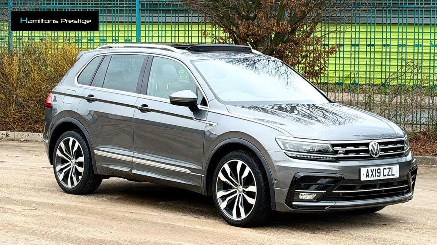 Black interior.Full VW Dealer Service History! Absolutely immaculate with Full Service Inc gearbox & fully refurbished alloy wheels! Pan Roof, Heated Seats, Digital Cockpit, Lane Assist, Ambient Lighting, R Line Badging, Auto Dimming Mirrors & More! Here at Hamiltons Prestige Limited, we are proud to offer this stunning Volkswagen Tiguan 2.0 TDI R-Line Tech SUV, a perfect blend of style, performance, and practicality. With a powerful 2.0-litre diesel engine delivering 187 bhp and an impressive torque of 295 lbs/ft, this vehicle accelerates from 0 to 60 mph in just 7.9 seconds, making it a thrilling drive. The automatic transmission and four-wheel drive system ensure a smooth and responsive experience, whether you're navigating city streets or tackling off-road adventures. Finished in a sleek Indium Grey, this SUV not only looks the part but also offers a spacious interior with part leather upholstery, comfortably seating up to five passengers. One of the standout features of this Tiguan is the Tyre Pressure Monitoring System, which enhances your safety by continuously monitoring the pressure in each tyre. This system alerts you to any discrepancies, helping to prevent potential blowouts and ensuring optimal fuel efficiency. With this added peace of mind, you can focus on enjoying your drive. The Winter Pack, which includes heated outer rear seats, is a fantastic addition for those colder months. Passengers in the back can enjoy a warm and comfortable ride, making long journeys more enjoyable for everyone. This thoughtful feature is perfect for families or anyone who frequently travels with friends. Another practical enhancement is the 230V socket in the boot, complete with a luggage light. This feature allows you to charge devices on the go, making it ideal for road trips or outdoor adventures. Whether you need to power up a laptop or keep your gadgets charged, this convenient addition ensures you stay connected wherever you are. The Discover Navigation Pro Touch-Screen Infotainment System is a highlight of the Tiguan, offering integrated voice activation and gesture control for effortless navigation and entertainment. With Car-Net Guide and Inform Plus, you can access real-time traffic updates and local information, while Car-Net App-Connect allows you to seamlessly integrate your smartphone with the vehicle's system. This ensures you have all the information and entertainment you need at your fingertips, enhancing your driving experience. With a top speed of 132 mph and a fuel consumption of 39.2 mpg, this Tiguan is not only powerful but also efficient, making it a great choice for both city driving and longer journeys. Being ULEZ compliant adds to its appeal, ensuring you can drive in urban areas without any concerns. This 2019 model has only had one previous owner and has covered 63,000 miles, making it a reliable option for anyone looking for a high-quality SUV.