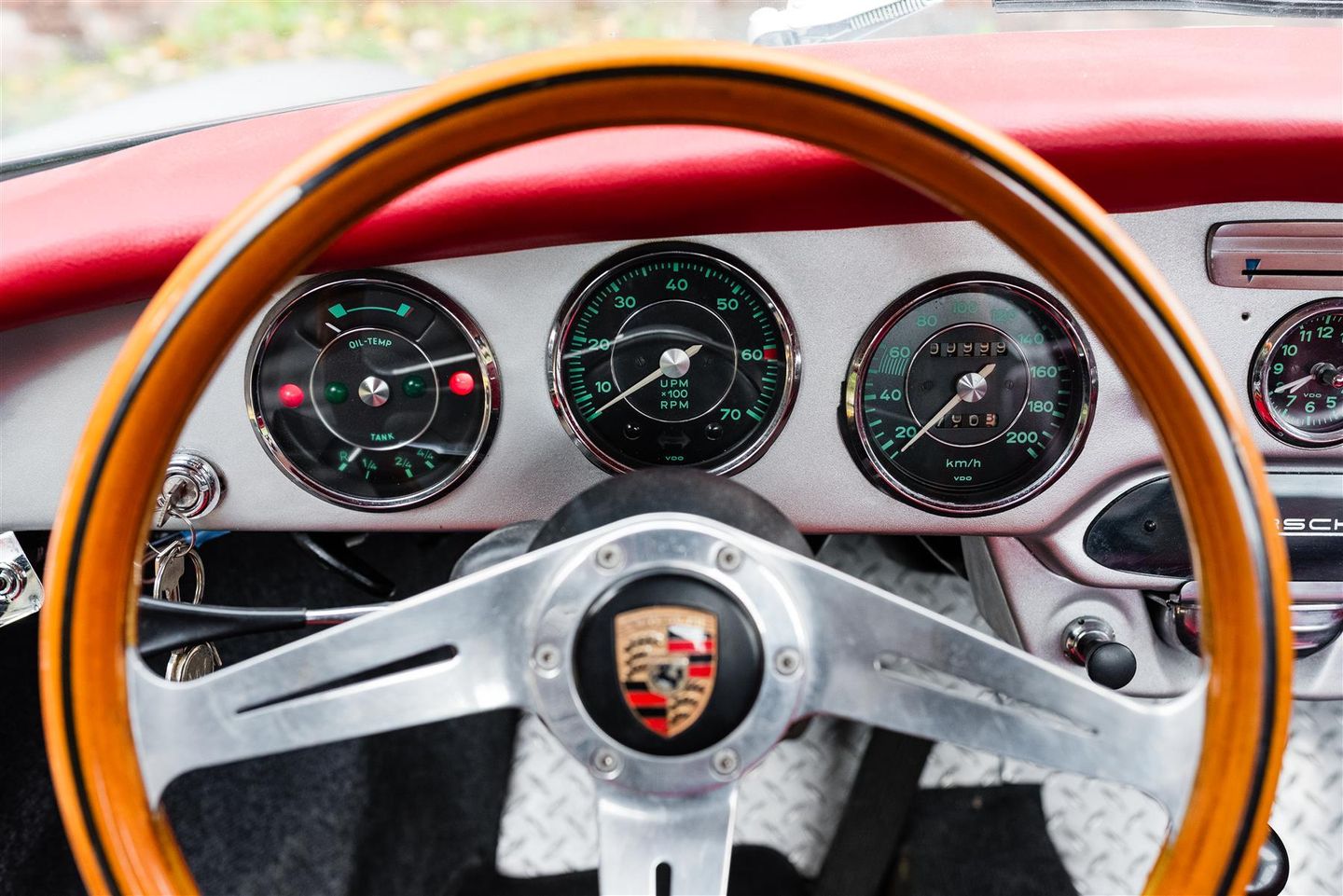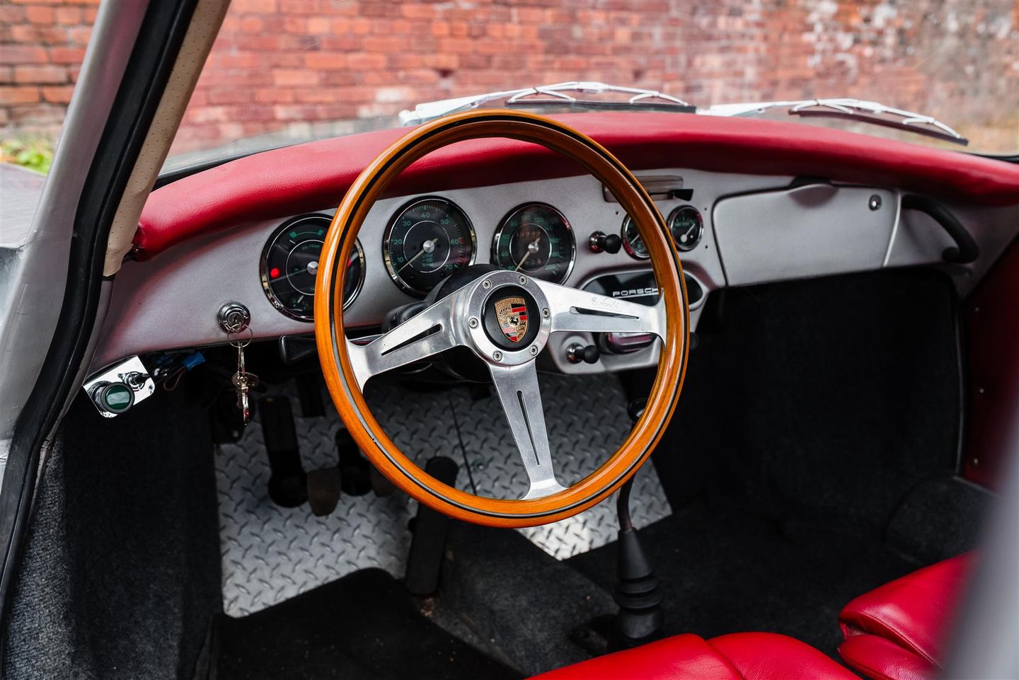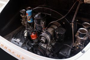 Chassis 130833 was registered new to its first owner, a resident of Alhambra, California in 1964 via Competition Motors, Culver City, California. The original specification was signal red over black interior per the Kardex, it was optioned with chrome-plated perforated disc brakes, red coconut floor mats, hubcaps with the Porsche crest and a Blaupunkt Frankfurt radio with two speakers and antenna. It was acquired by our client from a collector in Orlando, Florida in 2022. While the early history is unknown there is a nice history file of receipts. A previous owner had installed the additional front spot lights, speedster style bucket seats, stainless steel sports exhaust, Nardi wooden steering wheel, Bilstein shock absorbers, talbot chrome wing mirrors, front bonnet leather hood straps, black metal horn grilles, louvered engine lid, conversion to a 12 volt system and a set of Fuchs wheels. The car was repainted in the summer of 2025 and shows very few imperfections, the panel gaps and fits are excellent, and the undercarriage is solid and rust free. Prior to advertising the car has been serviced and MOT’d.