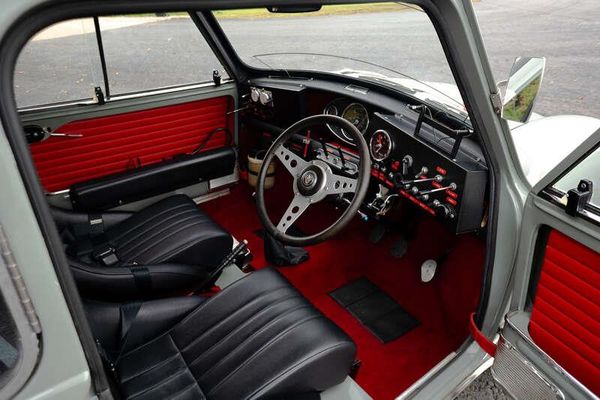 Lots of details - 130mph Cooper speedo, twin fuel tanks, Cooper S badges, grille/boot board, chrome mirrors, front spot and fog lights, leather bonnet strap, 10" Minilite wheels, bonnet mounted engine cut-off switch, sump guard, two towing eyes, heated windscreen, wheel arch extensions, mud flaps, Sabelt racing belts, roll cage, rear seat-delete, fire extinguisher, pace note reading lights, stop watches, full bank of racing switches, twin fuel tanks, centre exit exhaust and rear spot/reversing light