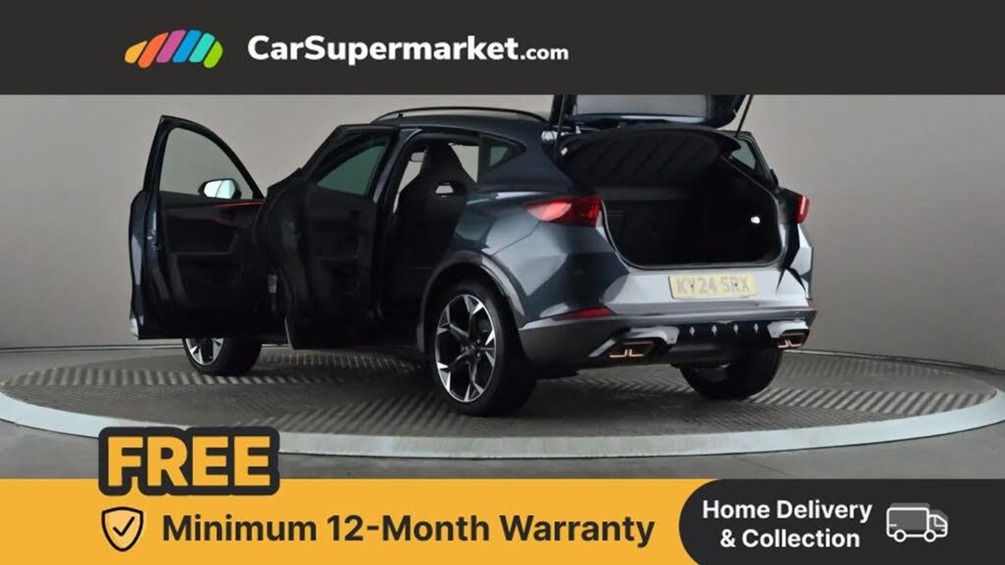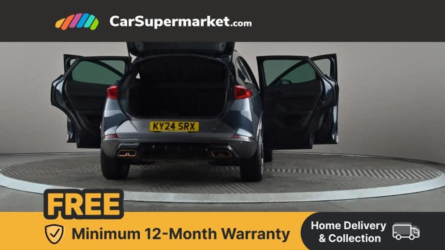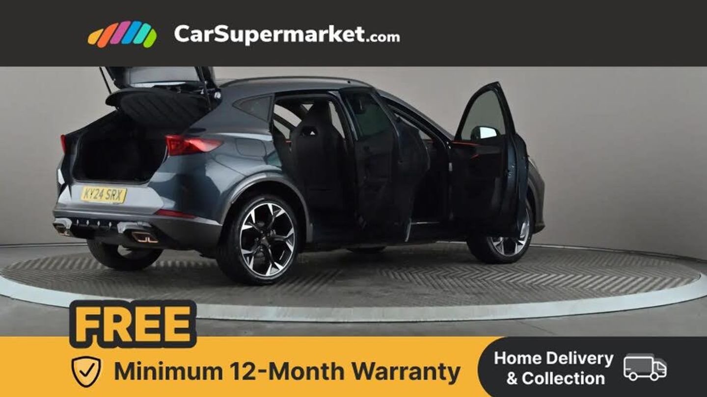 Digital cockpit and configurable dashboard,Driver alert system,Driving profile selection,Forward collision warning with automatic braking,Lane assist,Navigation system with 12'' Touchscreen Display,Park assist (inc front/rear parking sensors),PAS,Predictive adaptive cruise control with speed limiter,Rear view camera,RPM, trip computer, outside temp gauge, instrument light brightness, low fuel warning light, lights on reminder, gearshift indicator,Service interval indicator,Start/stop system with regenerative braking,Voice control system,Wired Android Auto,Wireless apple carplay,Wireless phone charger,10 amp mode 2 charging cable,16 amp mode 3 charging cable,3.6 kw On-board charger,Electronic locking differential and dynamic traction support,Standard suspension,2 front and 2 rear USB type C sockets,DAB radio,Auto dimming rear view mirror,Body colour door handles,Body coloured bumpers,Dark grey wing mirror,Daytime running light with automatic headlight control and coming home feature,Dynamic headlight range control,Electric front/rear windows,Electrically adjustable heated and folding door mirrors with memory function,Front fog lamps with cornering function,Gloss black roof rails and window surrounds,LED Headlights,LED Taillights with dynamic indicator,Rain sensing wipers,Rear diffuser with black simulated exhaust pipes,Rear side wing doors,Rear wash/wipe,Third brake light,Tinted rear windows,Welcome lights,12V socket,2 front and 2 rear reading lights,3 seat bench in 2nd row,60/40 split rear bench seat with armrest and mechanical seat release,Black headlining,Dust/pollen filter,Front and rear head restraints,Front centre armrest,Height/reach adjust steering wheel,Illuminated interior front door sills,Illuminated sunvisor with mirror,Isofix,Leather multi function heated steering wheel with gear shift paddles,Single front passenger seat,Three zone climate control with control panel in rear,Wraparound lighting,Genuine Nappa leather Pack - Cupra,3 point seatbelts on all rear seats,ABS,Brake control system - ESC and brake booster,Child proof door locks,Driver and front passenger airbags with front passenger airbag de-activation,Electronic parking brake,Front and rear disc brakes,Front side curtain airbags,Hill hold control,Public e-call,Seat belt reminder for front and rear seats,Tyre pressure monitoring system,Anti theft alarm system,Keyless entry and start system (KESSY),Locking wheel bolts,Copper and aluminium interior detailing,19" 'Exclusive' machined sport matte black and silver alloy wheels,Tyre repair kit