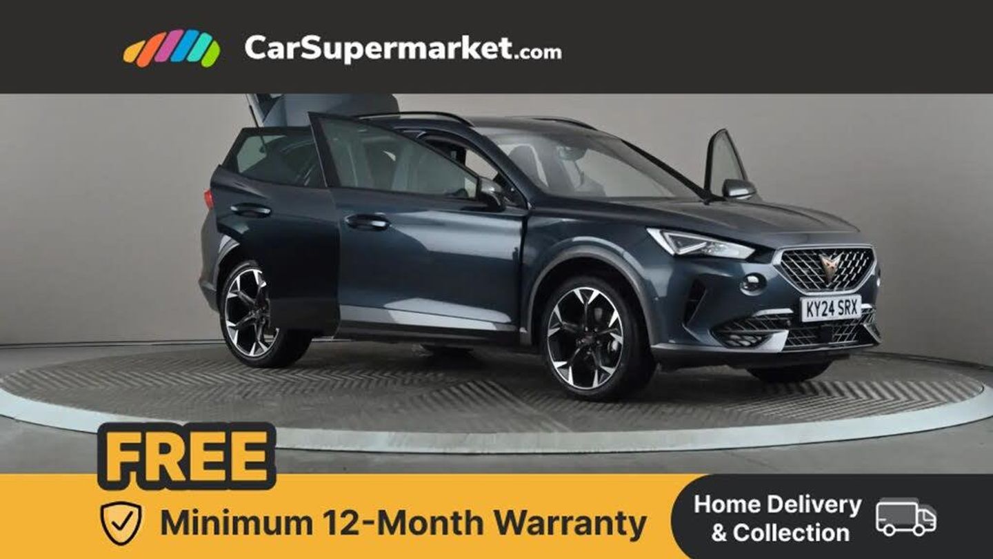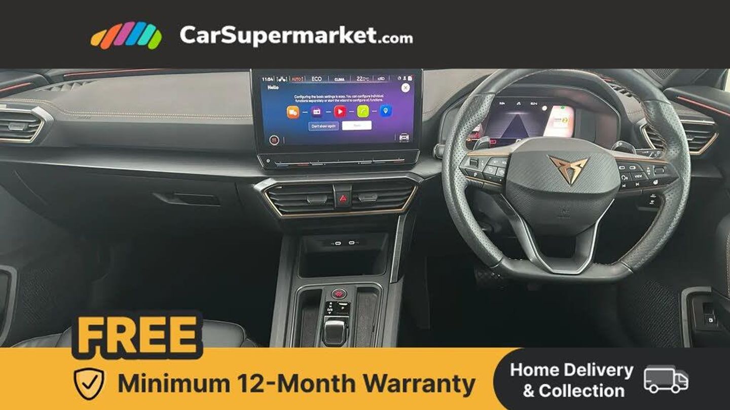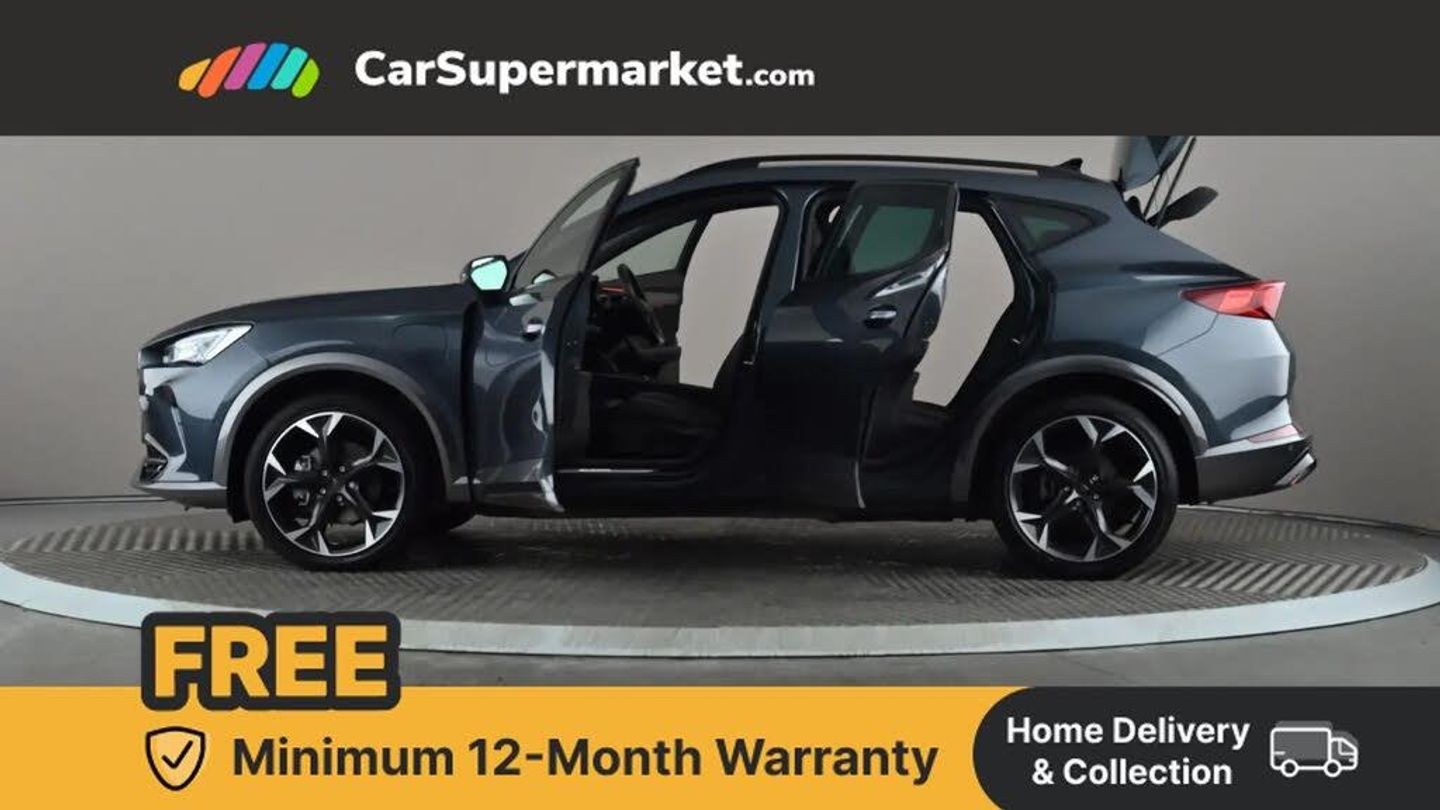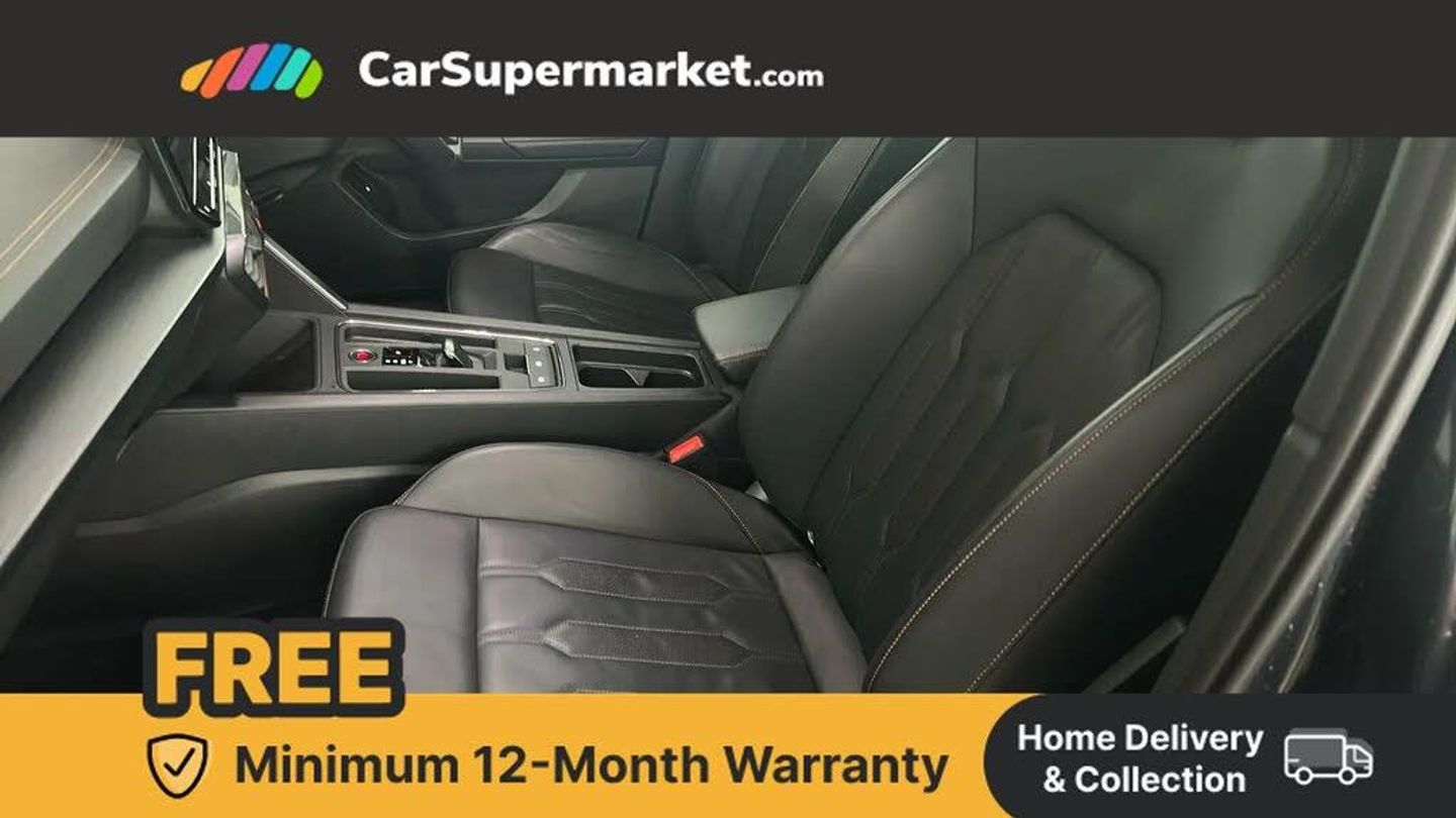 Digital cockpit and configurable dashboard,Driver alert system,Driving profile selection,Forward collision warning with automatic braking,Lane assist,Navigation system with 12'' Touchscreen Display,Park assist (inc front/rear parking sensors),PAS,Predictive adaptive cruise control with speed limiter,Rear view camera,RPM, trip computer, outside temp gauge, instrument light brightness, low fuel warning light, lights on reminder, gearshift indicator,Service interval indicator,Start/stop system with regenerative braking,Voice control system,Wired Android Auto,Wireless apple carplay,Wireless phone charger,10 amp mode 2 charging cable,16 amp mode 3 charging cable,3.6 kw On-board charger,Electronic locking differential and dynamic traction support,Standard suspension,2 front and 2 rear USB type C sockets,DAB radio,Auto dimming rear view mirror,Body colour door handles,Body coloured bumpers,Dark grey wing mirror,Daytime running light with automatic headlight control and coming home feature,Dynamic headlight range control,Electric front/rear windows,Electrically adjustable heated and folding door mirrors with memory function,Front fog lamps with cornering function,Gloss black roof rails and window surrounds,LED Headlights,LED Taillights with dynamic indicator,Rain sensing wipers,Rear diffuser with black simulated exhaust pipes,Rear side wing doors,Rear wash/wipe,Third brake light,Tinted rear windows,Welcome lights,12V socket,2 front and 2 rear reading lights,3 seat bench in 2nd row,60/40 split rear bench seat with armrest and mechanical seat release,Black headlining,Dust/pollen filter,Front and rear head restraints,Front centre armrest,Height/reach adjust steering wheel,Illuminated interior front door sills,Illuminated sunvisor with mirror,Isofix,Leather multi function heated steering wheel with gear shift paddles,Single front passenger seat,Three zone climate control with control panel in rear,Wraparound lighting,Genuine Nappa leather Pack - Cupra,3 point seatbelts on all rear seats,ABS,Brake control system - ESC and brake booster,Child proof door locks,Driver and front passenger airbags with front passenger airbag de-activation,Electronic parking brake,Front and rear disc brakes,Front side curtain airbags,Hill hold control,Public e-call,Seat belt reminder for front and rear seats,Tyre pressure monitoring system,Anti theft alarm system,Keyless entry and start system (KESSY),Locking wheel bolts,Copper and aluminium interior detailing,19" 'Exclusive' machined sport matte black and silver alloy wheels,Tyre repair kit
