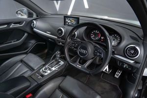Leather-Alcantara - S Embossed Sports Seats - Rotor Grey with Anthracite Stitching, Mythos Black, Split Folding Rear Seat Bench, Door Mirrors - Heated-Electrically Adjustable-Folding-Auto-Dimming, 18in Alloy Wheels - 5-Arm Turbine Design in Magnesium Look - Diamond Cut Finish, 2 x USB Charging Ports and 1 x AUX-IN, 6-Airbag System with Knee Airbag for Driver, Aluminium Interior Elements, Anti Theft Locking Wheel Bolts, Anti-Theft Alarm, Audi Beam, Audi Connect Infotainment Services - 3 Month Trial, Audi Drive Select, Audi Hill Hold Assist, Audi Smartphone Interface, Auto-Dimming Rear-View Mirror with Light and Rain Sensor, Bang and Olufsen Sound System, Black Styling Package, Bluetooth Interface, Brake Calipers Painted in Black with S3 Logo at the Front, CD Drive, Cloth Headlining in Black, Colour Drivers Information System - DIS, Cruise Control, DAB Digital Radio, Door Mirrors - Black Housing, Door Mirrors - Electrically Adjustable and Heated with Integrated LED Side Indicators, Dual-Zone Electronic Climate Control, ESC - Electronic Stabilisation Control inc ABS - ASR and EDL, Electric Windows - Front, Electromechanical Parking Brake, Email and Text Messages can be Displayed on your Vehicles MMI, Exhaust Tailpipe - Dual-Branch Oval Twin with Chrome Finish, First Aid Kit and Warning Triangle, Front Centre Armrest, Front and Rear Floor Mats, Headlights Washers, Heated Front Seats, Heated Windscreen Washer Jets, ISOFIX Child Seat Mounting and Top Tether, Illuminated Door Sill Trims with S Logo, Inlays - Matt Brushed Aluminium, Instrument Dials with S3 Logo, LED Headlights with LED Rear Lights and Dynamic Rear Indicators, LED Interior Light Package, Lashing Points in Luggage Compartment, MMI Navigation - SD Card Based, MMI Radio Plus with 7in Electrically Retractable Colour MMI Screen, Non-Smoking Package, Online Media Streaming - Audi MMI Connect App Required, Pedals in Stainless Steel, Privacy Glass, Progressive Steering, Rear Parking Sensors, Remote Central Locking with 2 Fold Away Keys, S Design Body Styling, S Sport Suspension, Seat Belt Monitoring, Space Saver Spare Wheel, Split Folding Rear Seat Bench - 60-40 or Fully, Steering Wheel - 3-Spoke Leather-Multifunction-Flat Bottomed-Shift Paddles, Storage Compartments in the Door Side Trims-Centre Console-Under Drivers Seat, Storage Package, Tool Kit and Car Jack, Tyre Pressure Warning Light