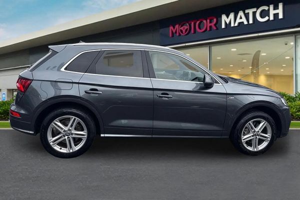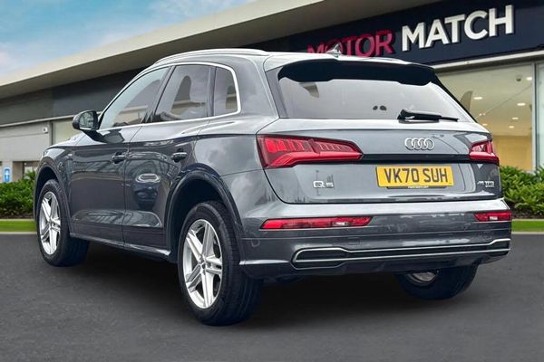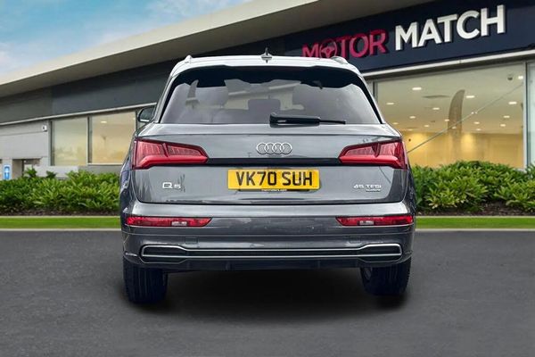 Isofix, Light and Rain Sensor, Sat Nav, Advanced Safety, Alloys, Aux In, Bluetooth, Cruise Control, DAB, AC/Climate, Heated Seats;This 2020 Audi Q5 TFSI S line offers a compelling blend of performance and practicality. Powered by a 2.0 litre petrol engine and featuring Four Wheel Drive, this Euro 6 compliant model is ready for any journey. Its S line trim ensures a premium feel, complemented by notable features such as automatic LED headlights with dynamic rear indicators, a light and rain sensor, and deluxe 3 zone climate control for ultimate comfort. Maneuvering is made effortless with the Audi Parking System Plus, providing front and rear sensors, while heated front seats add an extra touch of luxury. The Q5 TFSI S line boasts impressive capabilities, including a swift 0-62mph acceleration time of just 6.4 seconds, demonstrating its dynamic performance. This acceleration figure indicates a superior driving experience compared to many similar vehicles. Furthermore, its substantial towing weight of 2400 kg makes it a versatile choice for those needing to tow. The generous boot space further enhances its practicality, offering ample room for luggage, shopping, or equipment, making this Audi Q5 a well rounded and capable vehicle.