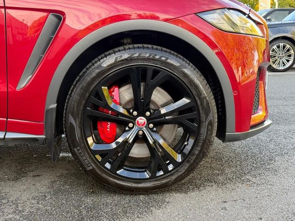 10in Touch Pro, 14-Way Electric Memory Front Seats, 2-Zone Climate Control, 21in Alloy Wheels - 5 Split-Spoke Style 5080 with Diamond Turned Finish, 3-Flash Lane Change Indicators, 360 Degree Parking Aid, 395mm Front and Rear Brakes, 40-20-40 Split Fold SVR Rear Seat, ABS - Anti-locking Braking System, AM-FM Radio, ASPC - All Surface Progress Control, Adaptive Dynamics, Adaptive LED Headlights with LED Signature Daytime Running Lights, Airbags - Front Side, Airbags - Full Length Side Window Curtain, Aluminium Gearshift Paddles, Ambient Interior Lighting, Android Auto, Apple CarPlay, Approach Illumination, Auto High Beam Assist, Auto-Dimming - Power Fold - Heated Door Mirrors with Memory and Approach Lights, Auto-Dimming Interior Rear View Mirror, Bluetooth Connectivity, Bluetooth Streaming, Body Coloured Door Mirror Caps, Brake Pad Wear Indicator, Bright Metal Pedals, Centre Console - Side Stowage, Centre Console - Storage Surround Finishers - Satin Chrome, Centre Console with Armrest, Configurable Dynamics, Connect Pro, Cruise Control with Speed Limiter, Digital Audio Broadcast - DAB - Radio, Door Trim - Luxtec, Driver Condition Monitor, Dynamic Stability Control - DSC, Dynamic Volume Control, EBA - Emergency Brake Assist, ECO Driving Style Assistant, EPAS - Electric Power Assisted Steering, EPB - Electronic Parking Brake, Ebony Suedecloth Headlining, Electric Windows - Front and Rear with One-Touch Open-Close and Anti-Trap, Electronic Active Differential with Torque Vectoring by Braking, Emergency Braking, F-PACE Badge, Front Airbags with Passenger Seat Occupant Detector, Front Headrests - SVR Embossing, Front Windscreen with Non-acoustic Layer, Gloss Black Grille with Satin Grey Surround, Gloss Black Roof Rails, Gloss Black Side Window Surround, Glovebox Finisher with Jaguar Script, Green Tinted Glass, Headlight Power Wash, Heated Front Windscreen, Heated Rear Window, Heated Steering Wheel, Heated and Cooled Front Seats with Heated Rear Seats, Hill Launch Assist, Hook in Loadspace, ISOFIX Rear, InControl Apps, Interactive Driver Display, Interior Front Door Handles with Separate Locking Switches, Jaguar Script and Leaper, Jaguar Tyre Repair System, JaguarDrive Control, Keyless Entry, LED Tail Lights, Lane Keep Assist, Lockable Glovebox, Luggage Tie Downs in Loadspace, Luxtec Wrapped Instrument Panel Topper with SVR Trim, Meridian Sound System - 380W, Meshed Aluminium Trim Finisher, Metal Loadspace Scuff Plate, Metal Treadplates with SVR Branding, Navigation Pro, No Loadspace Storage Rails, Outside Temperature Gauge, Overhead Lighting Console, Passive Front Head Restraints, Power Operated Child Locks, Power Sockets, Powered Tailgate - Boot Lid, Pro Services and Wi-Fi Hotspot, Protect for Warranty Period, Quad Tailpipes with 95mm Finishers, Rain Sensing Windscreen Wipers, Rear Air Vents, Rear Armrest with Twin Cupholders, Rear Camera, Rear Centre Headrest, Rear Fog Lights, Rear Metal Treadplates, Red Brake Calipers, Remote Premium, SVR Badge, SVR Body-Coloured Door Claddings with Satin Grey Finishers, SVR Front Bumper, SVR Leather Steering Wheel, SVR Luxury Carpet Mats, SVR Rear Bumper with Satin Grey Finish, SVR Satin Grey Side Vents, Satin Chrome Touchscreen Surround, Satin Grey Bonnet Louvres, Seat Belt Reminder, Seats - Performance, Speed Proportional Steering, Sportshift Selector, Start Up Sequence with Movement - Dials and Lighting, Steering Column - Electrically Adjustable, Steering Wheel - Multi-Function, Switchable Active Exhaust, Traffic Sign Recognition with Adaptive Speed Limiter, Trailer Stability Assist, Trip Computer, Twin Front Cupholders with Cover, Tyre Pressure Monitoring System, Valet Mode, Variable Intermittent Wipers, Voice Control, Firenze Red, Lozenge Quilted Leather - Ebony-Ebony