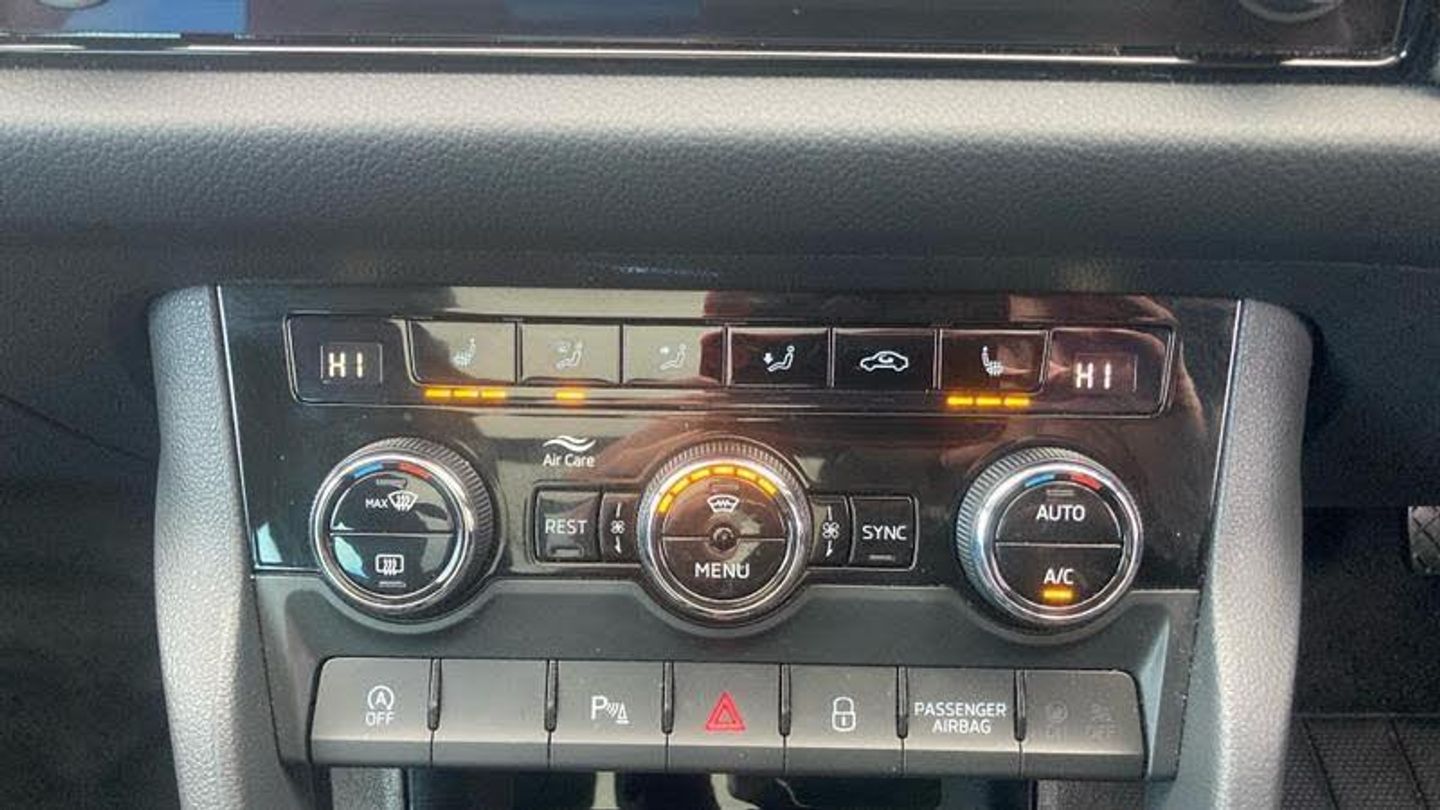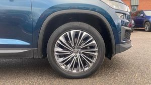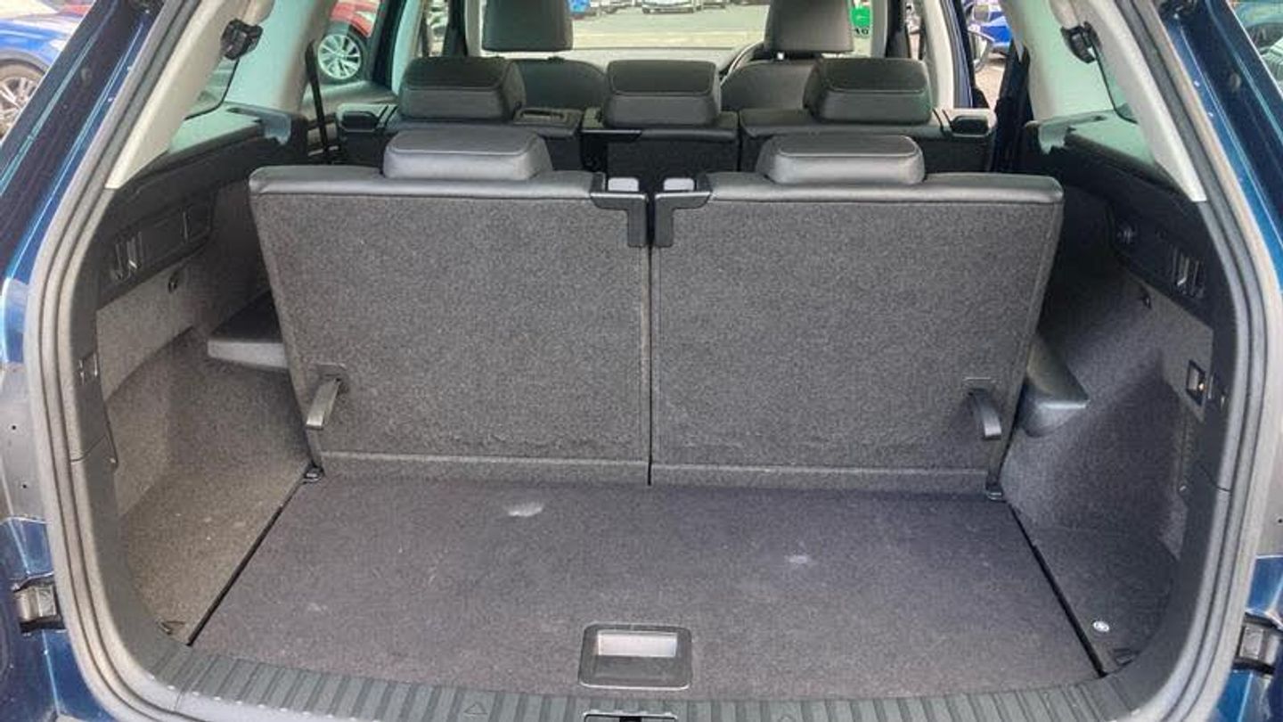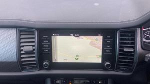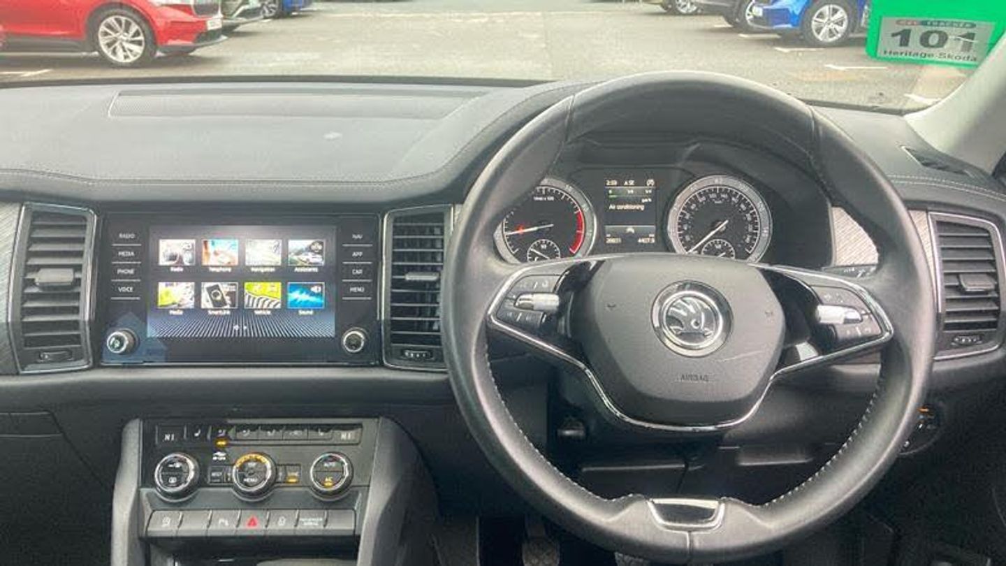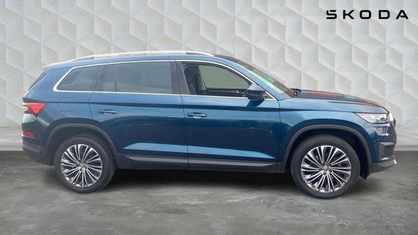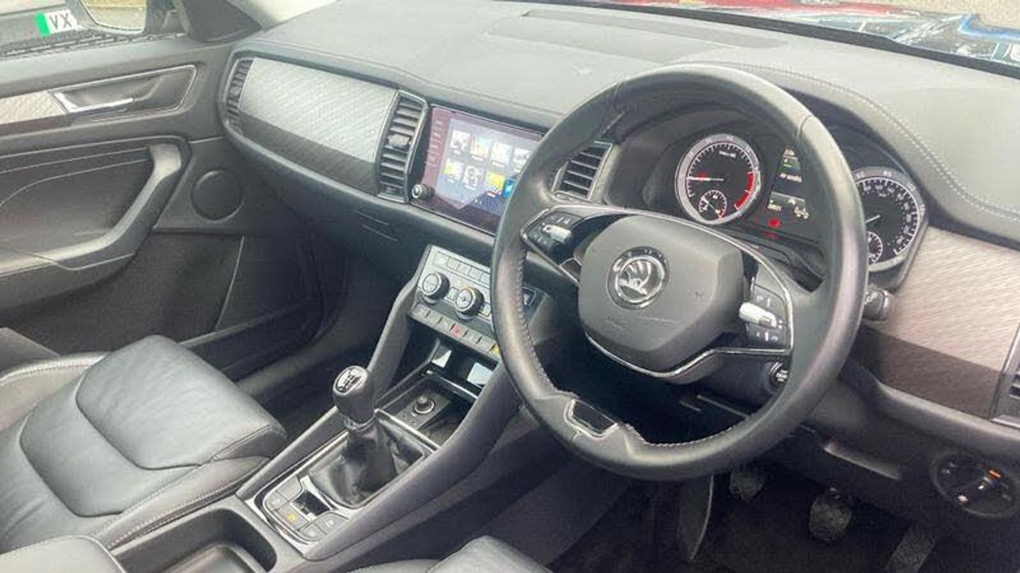 Metallic paint, Front and rear parking sensors, Electrically operated boot door, Amundsen satellite navigation with 8 touchscreen, integrated Wi-Fi, web radio, Winter pack with heated front and rear seats - Kodiaq, Metallic - Petrol blue, Electrically folding towbar with adaptor, Electric front and rear windows, Rain and light sensors, Black wheel arch surrounds, Body colour bumpers, Body colour door mirrors and handles, Chrome front grille, Chrome roof rails with chrome window surround, Off-road style lower front bumper element, Rear side wing doors, Daytime running lights, Full LED matrix headlights with AFS (adaptive front light system), cornering function and AWL (all weather lighting system), Headlight washers, LED rear fog light, Light assistant (coming/leaving home/tunnel light), Rear LED lights (high functionality) with welcome effect and dynamic indicators, Emergency rear braking signal, ESC (incl. ABS+MSR+ASR+EDS+HBA+DSR+RBS+MKB), Front assist with autonomous emergency braking, Hill hold control, Rear disc brakes, Electric adjustable/heated/folding door mirrors, driver side auto dimming with boarding sports and memory function, Auto door release and activation of warning lights in the event of an accident, Child locks on rear doors, Driver and front passenger airbag with knee airbag and front passenger airbag deactivation, Front side airbags with curtain airbags, Fuel cut off safety device, Height adjustable front 3 point seatbelts + pretensioners, Three point rear seat belts, Tyre pressure monitor, Bluetooth system, E-call, Smartlink wireless for apple carplay and wired for android auto, 8 Speakers, DAB Digital radio, ECO Stop/start function, Linear diamonds decorative inserts, 2 seat bench in 3rd row, 3 seat bench in 2nd row, 60:40 foldable rear seat with sliding adjustment and backrest angle adjustment, Height adjustable front headrests, Isofix child seat fittings in outer rear seats with top tether, Single front passenger seat, Three rear height adjustable headrests, 12V socket in boot, 4 foldable roof handles with rear coat hooks, Bottle holders in door panel in the 1.5 litre front and 1 litre rear, Cargo storage compartments, Chrome interior door handles, Covered storage compartment on driver side, Front centre armrest with storage compartment, cup holder and 12V socket, Grey stitching in front and rear armrests and door armrests + door inserts, Illuminated and cooled glovebox, Net programme in boot (1x horizontal Net, 2x vertical Nets), Rear centre armrest with cupholders, Small Bags on the inner sides of the front backrests, Umbrella in door panel, Front courtesy lights, Illuminated glovebox, Illuminated luggage compartment, Sunvisors with illuminated vanity mirrors, Alarm with interior monitoring and tilt sensor with safe function, Anti-theft wheel bolts, Immobiliser, Keyless entry and start system (KESSY), Remote central locking with 2 keys, Temporary spare wh, [Audio and Communications]Wireless charging, USB C Port x 2 in front centre console, [Drivers Assistance]Cruise control, Rear view camera, Exterior temperature indicator, [Exterior]Panoramic sunroof, Heated rear window, Privacy glass, Extended rear spoiler with finlets in gloss black, Invisible tailpipe, Window control switches with black trim, Electrically Folding Tow Bar with Adaptor, Panoramic Sunroof, [Illumination]Front fog lights, LED third brake light in rear spoiler, [Interior]Heated front seats, Leather - Black, Aero front windscreen wipers with intermittent function, Safety reflectors on front and rear doors, Auto dimming rear view mirror, Safety vest holder in door, Tailgate unlocking from outside, Digital voice enhancement, Grey stitching in dashboard, Pollen filter, 2 rails with 2 hooks, Chrome headlight control button, Coat hooks on B pillar, Gear shift lever with chrome frame and black gloss insert, Manually adjustable steering column, Overhead glasses storage compartment, Sliding trunk cover, Ticket holder on A Pillar, Variable boot