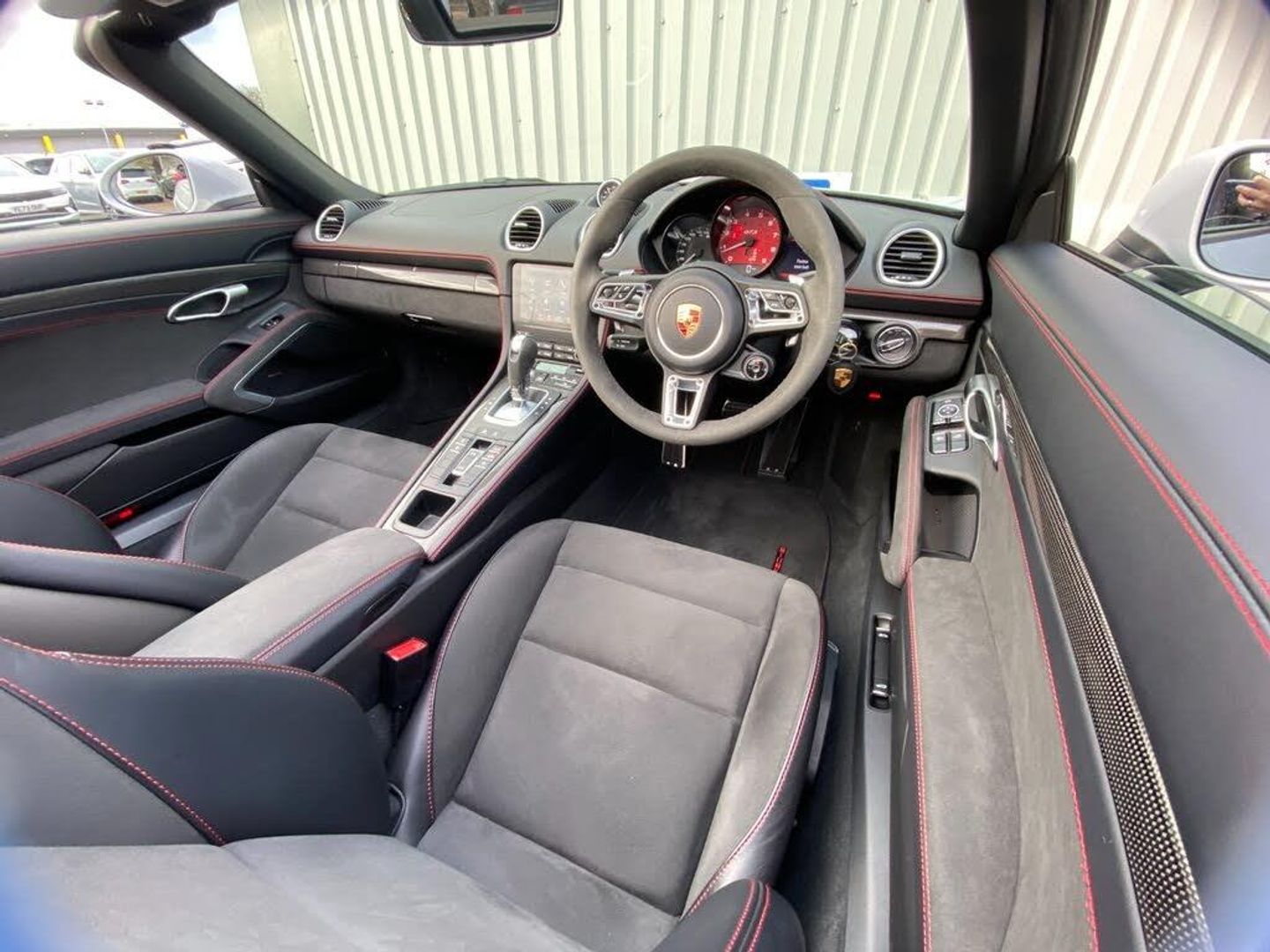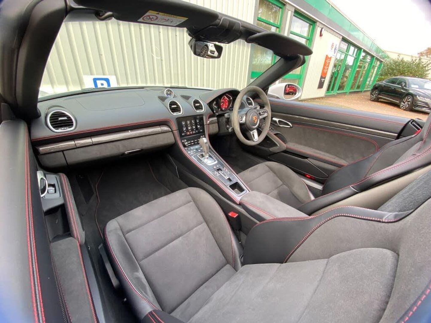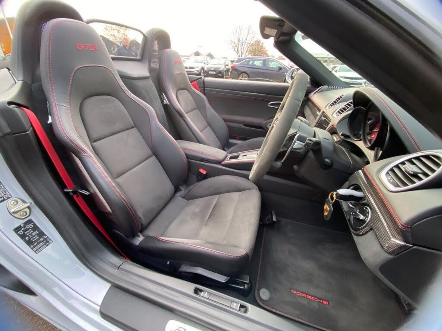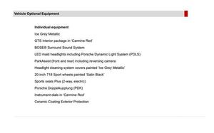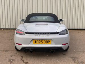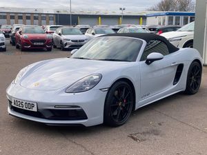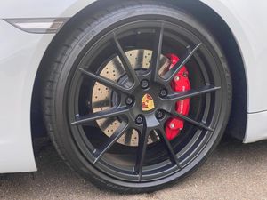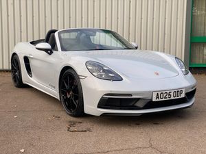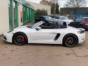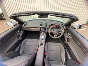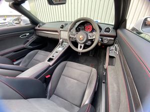 Auto start and stop system, Digital displays for vehicle speed, chosen gear, odometer, trip odometer and clock, eCall emergency call system, Instrument cluster with central rev counter and high-resolution 4.6 inch colour display, Porsche Communication Management (PCM) including online navigation module, mobile phone preparation, audio interfaces and voice control system, 64 litre fuel tank, Aluminium block and cylinder heads, Central cooler, Closed underbody panelling, Direct fuel injection (DFI), Dynamic gearbox mount system, Gasoline particulate filter, Integrated dry-sump lubrication with an on-demand oil pump, Porsche Doppelkupplung (PDK), Porsche Stability Management (PSM) with ABS, advanced brake functions, Porsche TORQUE Vectoring (PTV) with mechanical rear differential lock, Rear wheel drive, Two seater vehicle with mid mounted engine, Two three-way catalytic converters and on-board diagnostics for monitoring emission control system and coated particulate filter, Variable intake manifold with two switchable resonance valves, VarioCam (camshaft control for inlet and exhaust valves) and adaptive cylinder management, Water cooled with thermal management, DAB Digital radio, Integrated 4G/LTE compatible SIM including data for the Porsche Connect Services, Integrated compatible SIM including Porsche Connect Services, Navigation incl porsche + Apple Carplay, connect module, wireless internet access, carfinder, remote vehicle status, remote service and vehicle track, Wifi and music streaming, Auto deploying rear wing, Automatic headlight activation including welcome home lighting, Automatically extending rear boot spoiler, Body colour bumpers, Body colour door handles, Electrically adjustable heated exterior mirrors on door waist rails, aspherical on driver's side, Electrically folding exterior mirrors including courtesy lighting, Fully automatic fabric hood, electrically operated/heatable rigid glass rear screen, operable approx 31 mph and convenient operation by key remote, Green tinted heat insulating glass, Grey top tinted windscreen, Heated rear windscreen, Intelligent lightweight body in Aluminium/Steel composite construction, LED 3rd brake light, LED tail lights and integral 4 point brake lights and reversing lights, Net wind deflector, Power windows with one touch operation and door seal protection, Rain sensor, Rear boot, Separate tinted auxiliary lights in the front end with LED indicators and position lights, Side air intakes with one grille in black, Specifically designed GTS front and rear aprons partially painted in black, Twin tract sports exhaust system with two tailpipe in stainless steel high gloss black, Windscreen washer system with two wiper speeds and washer jets, 12V sockets in passenger footwell and centre console storage compartment, 718 logo on gear lever, Additional smooth finish leather with door panel armrest and centre console main storage compartment, Adjustable fan with air recirculation and defroster functions, Ascending centre console with uncovered storage compartment and closed storage compartment, Clothes hooks on front seat backrests, Footwell illumination, Front and rear luggage compartments, Front headrests, Heated seats, Hood lining in black fabric, LED reading lights, orientation, ignition lock, additionally luggage compartment and glove compartment lighting, Lockable glovebox, Seat centres in race tex, side bolsters, headrests in leather and headrests embroidered with GTS logo in black, Single front passenger seat, Storage compartments in each doors, Two individual cup holders (Passenger side, integrated into dashboard trim strip), Sport chrono package including mode switch - Boxster, 3 point automatic seatbelts, ASR, Electrically controlled parking brake, Front and rear lightweight spring strut axle, Front seatbelt pretensioners + load limiters, Full size driver and passenger airbags, Passenger airbag deactivate switch, Porsche side impact protection doors with thorax airbag in outer backrest side bolster and head airbag for driver/passenger in door panel, Tyre pressure monitoring system, Alarm system with interior surveillance, Anti-theft wheel bolts, Dashcam prep, Engine immobiliser with in key transponder, central locking and remote control, Tyre repair kit, Wheel centres with full colour Porsche crest